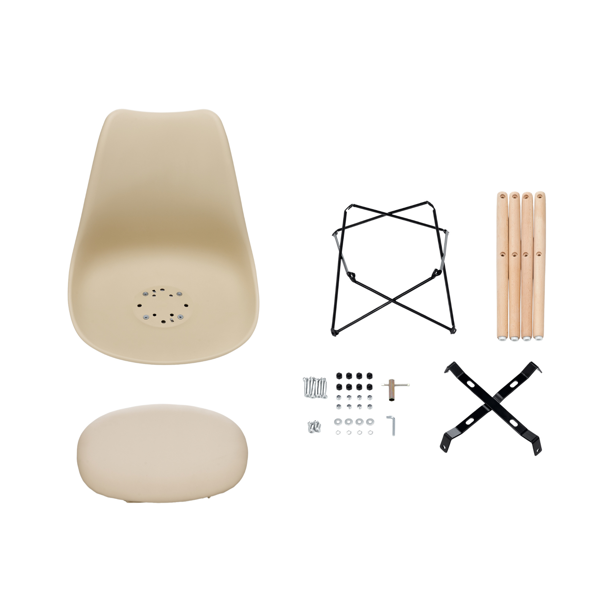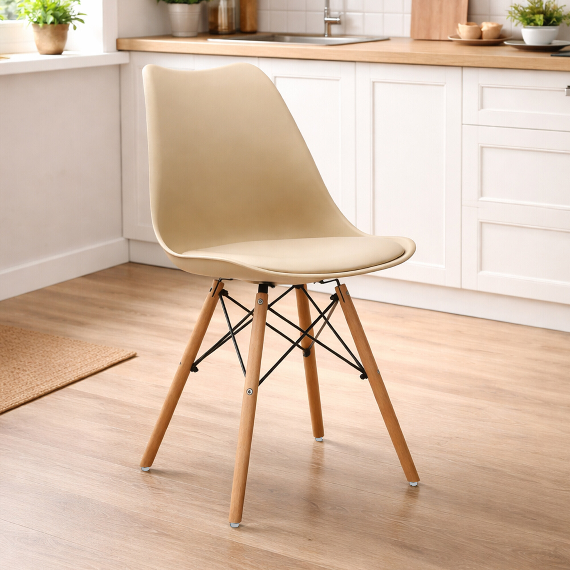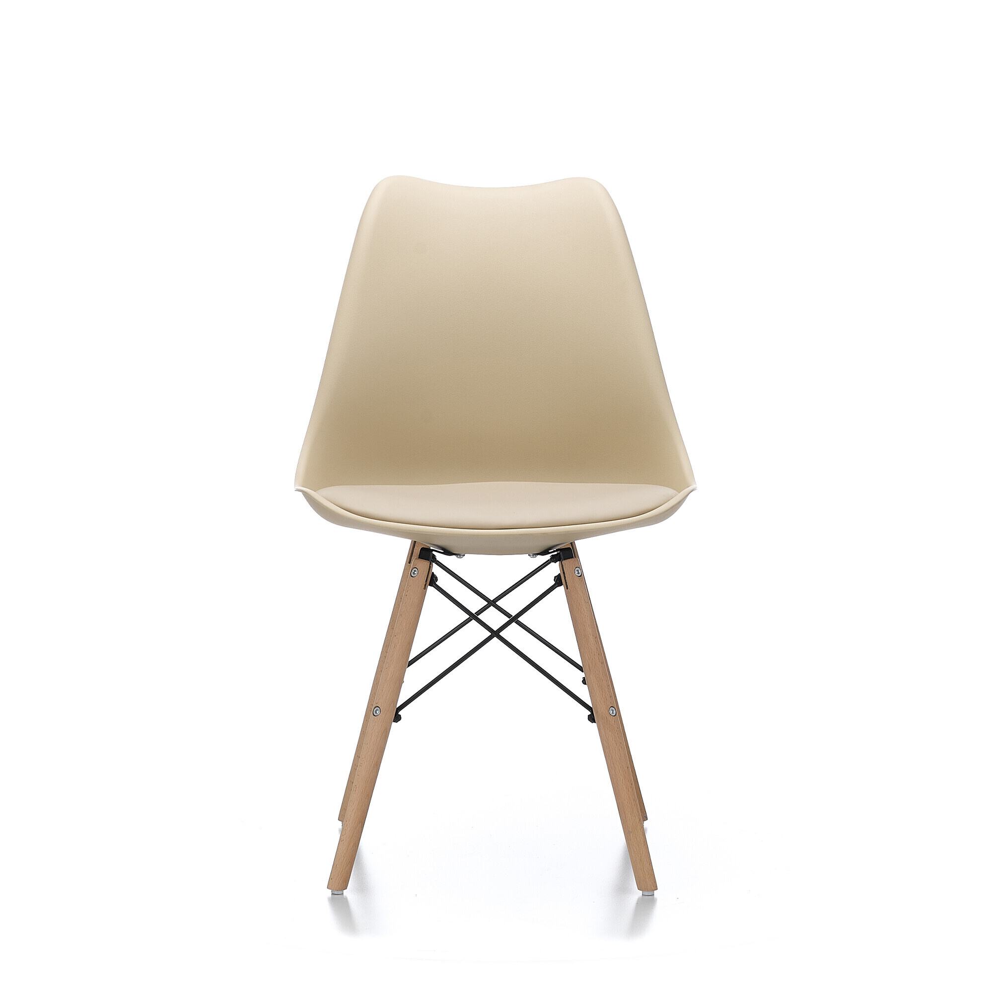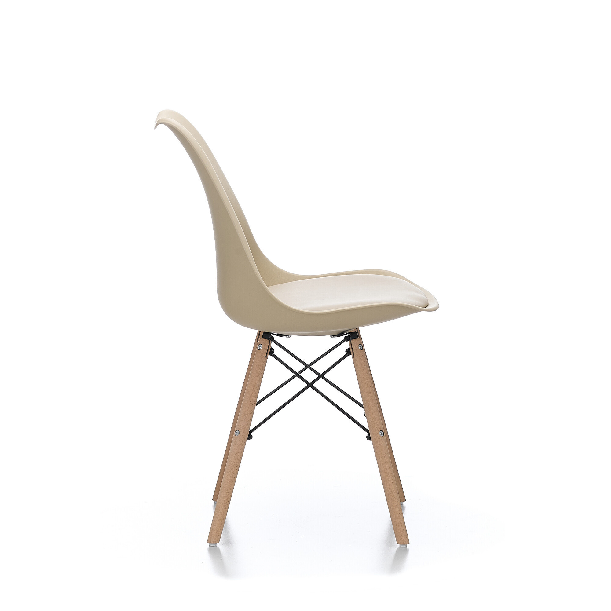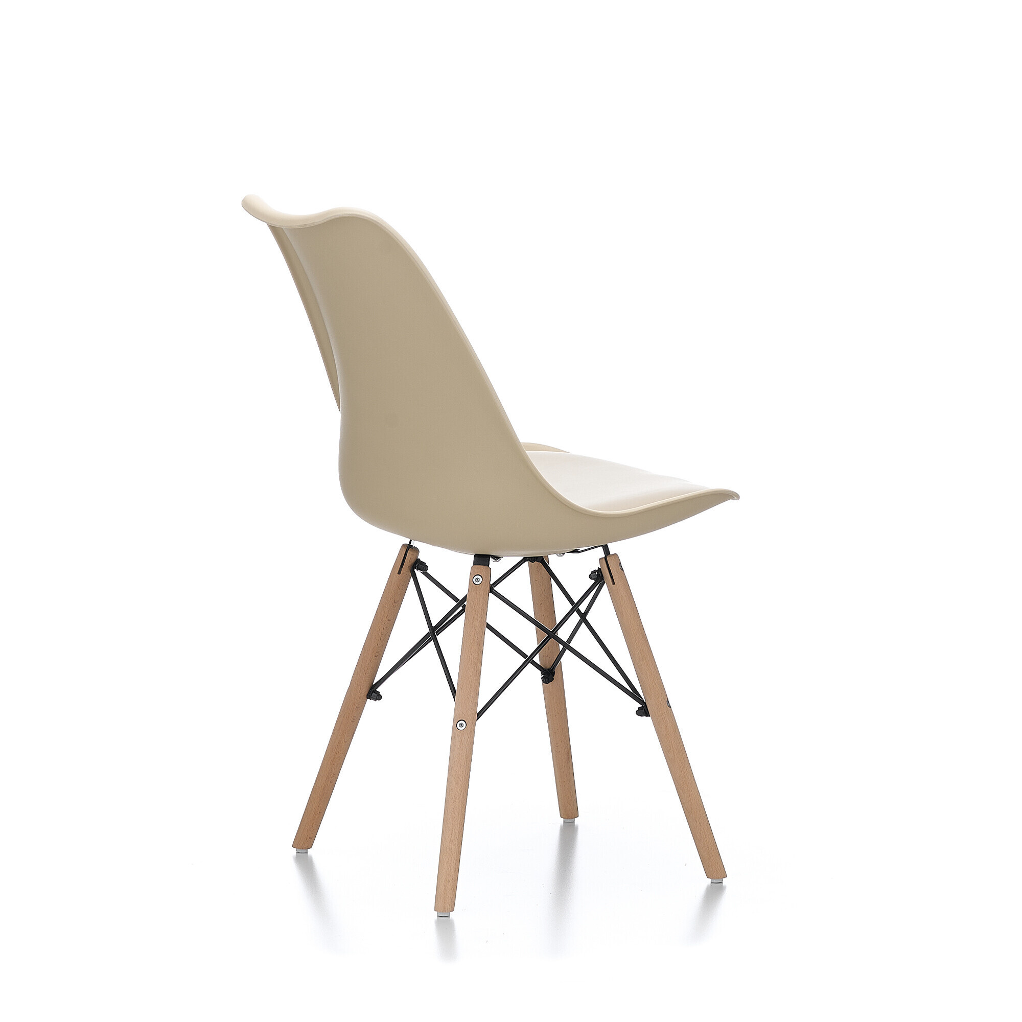 A szék kiváló minőségű és tartós polipropilénből készült, műbőr huzattal ellátott párnával, bükkfa lábakkal kombinálva.
