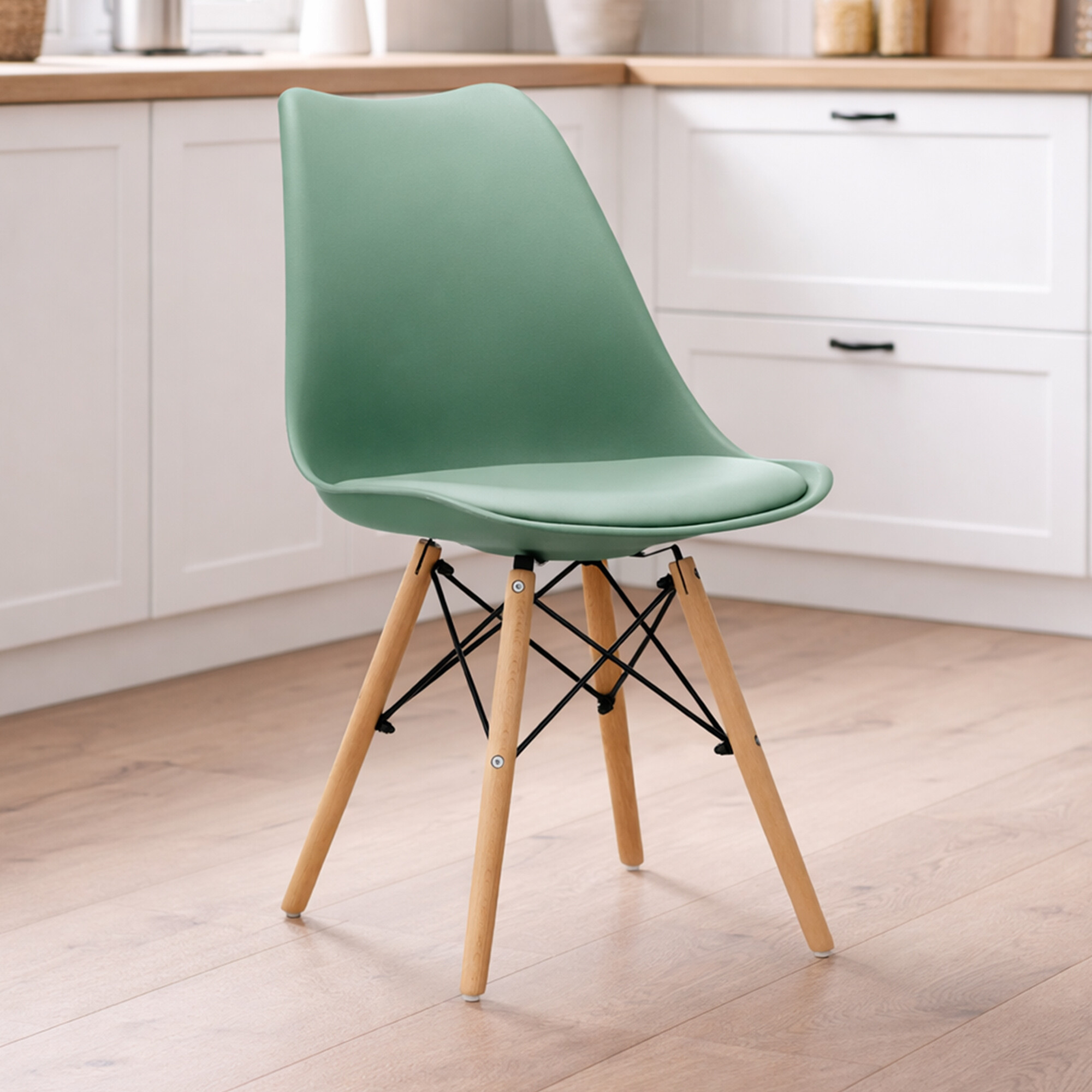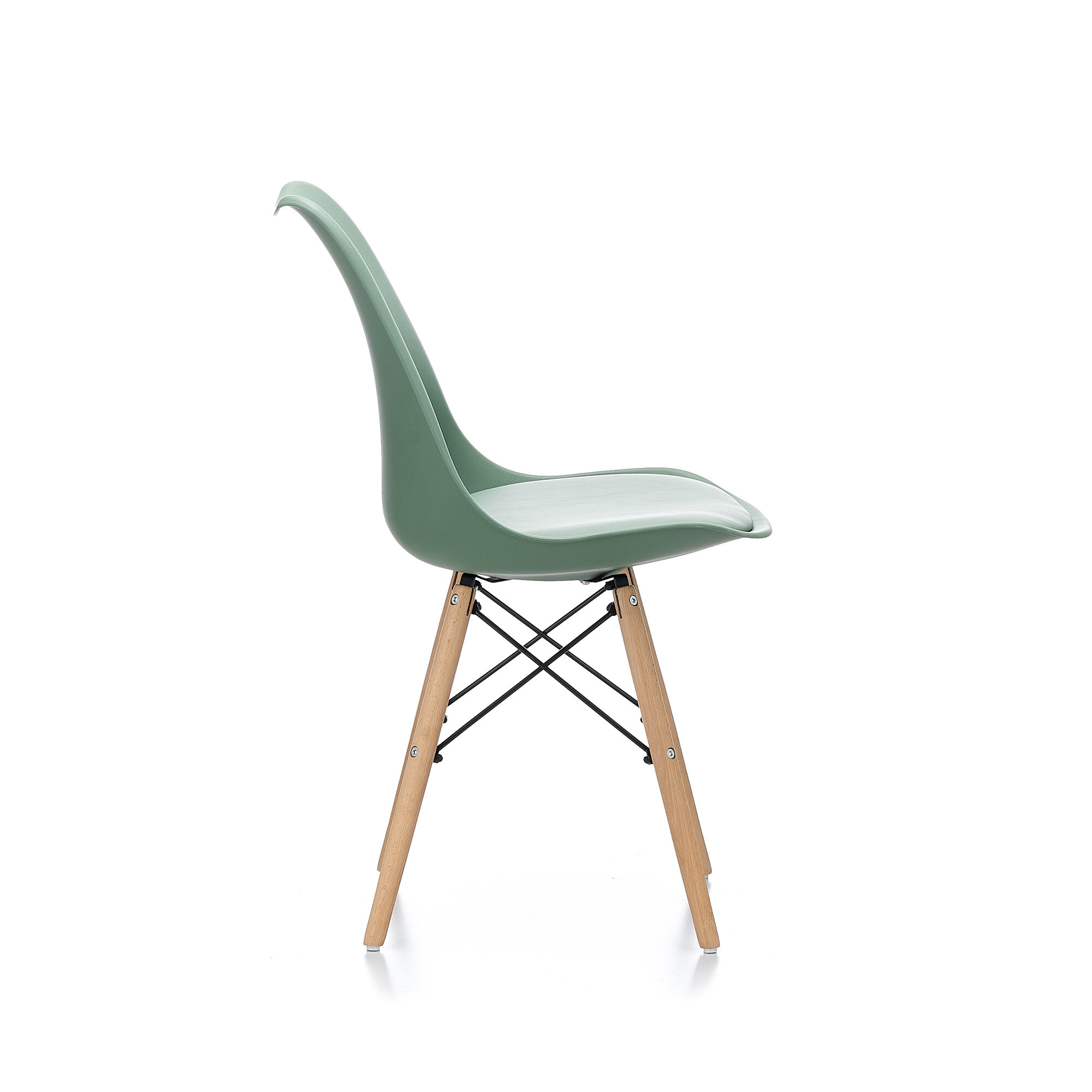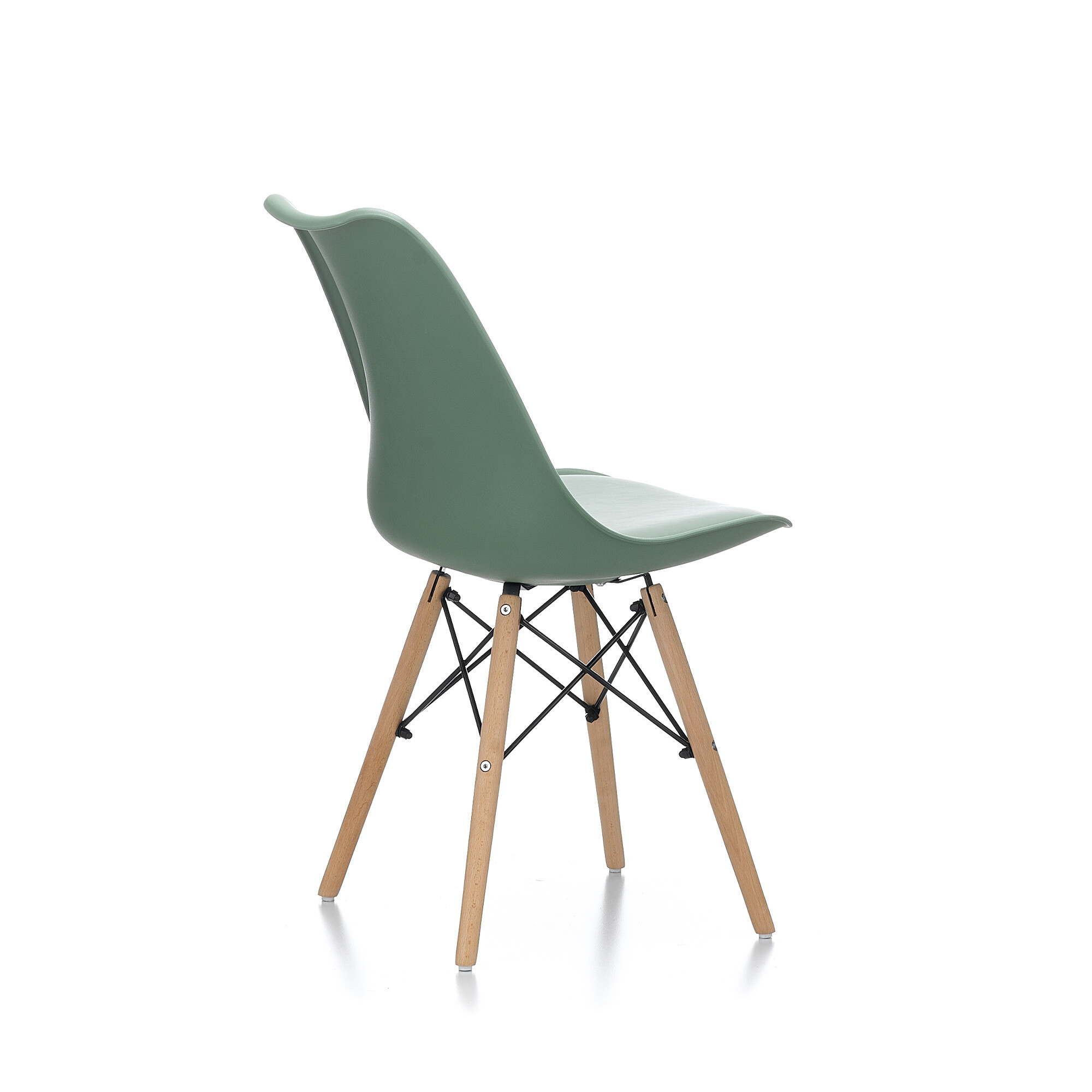 A szék kiváló minőségű és tartós polipropilénből készült, műbőr huzattal ellátott párnával, bükkfa lábakkal kombinálva.