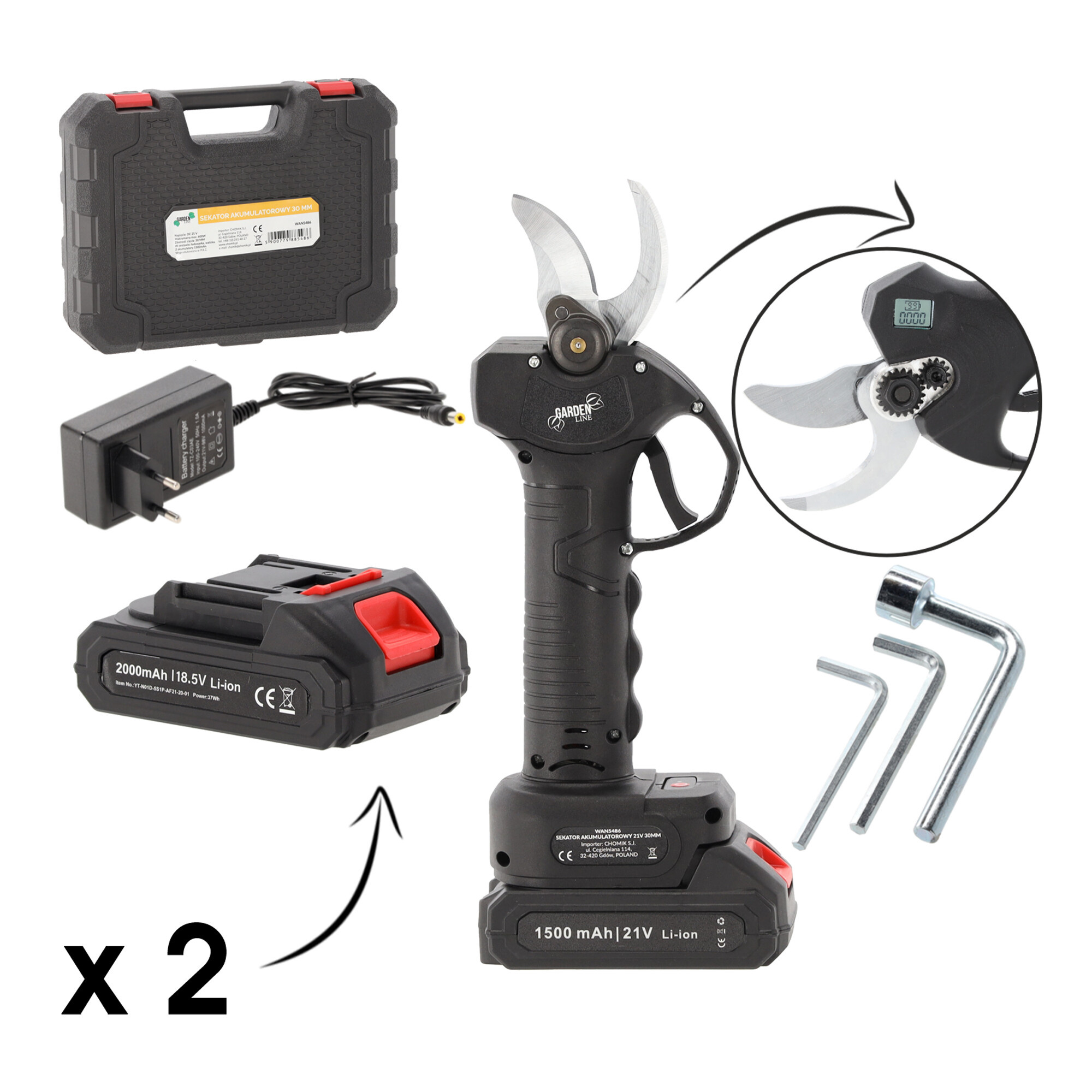 • A csomag tartalma: 2× 21V akkumulátor, akkumulátoros kerti olló, töltő és hordtáska