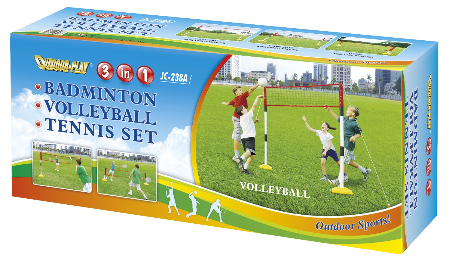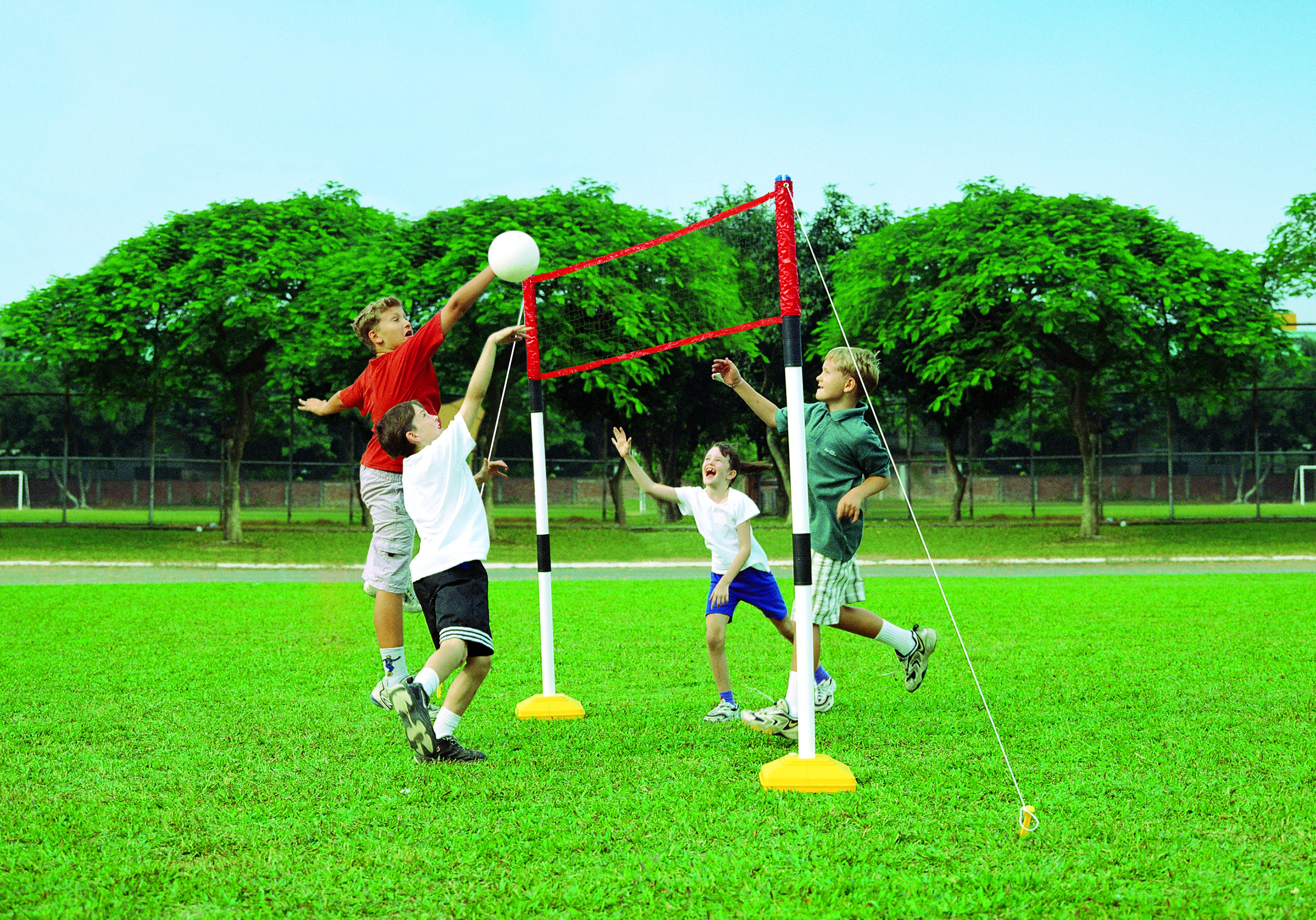 A háló kétféle magasságban állítható, tollaslabda 300x150 cm, röplabda 300x200 cm vagy tenisz 300x80 cm.