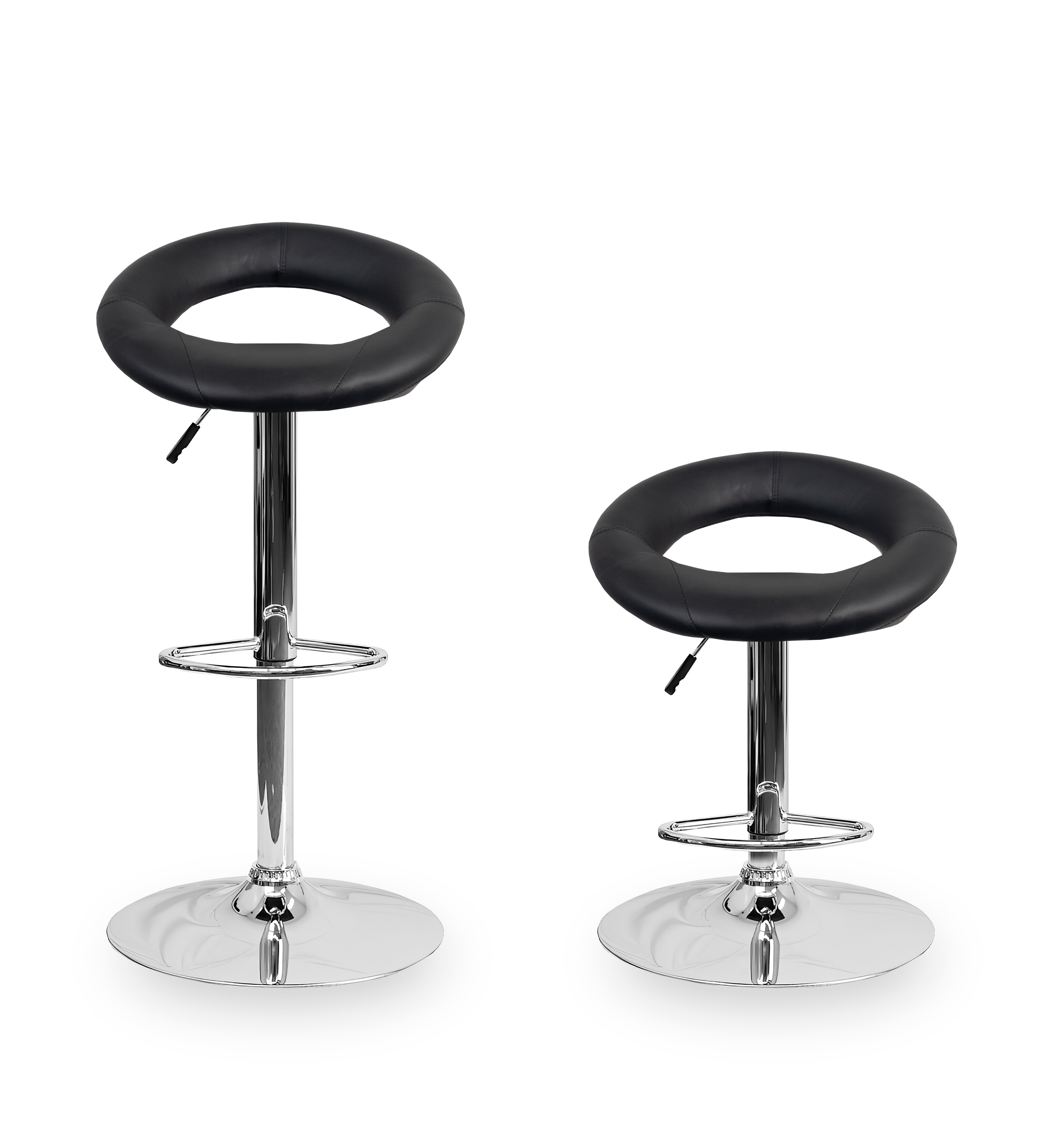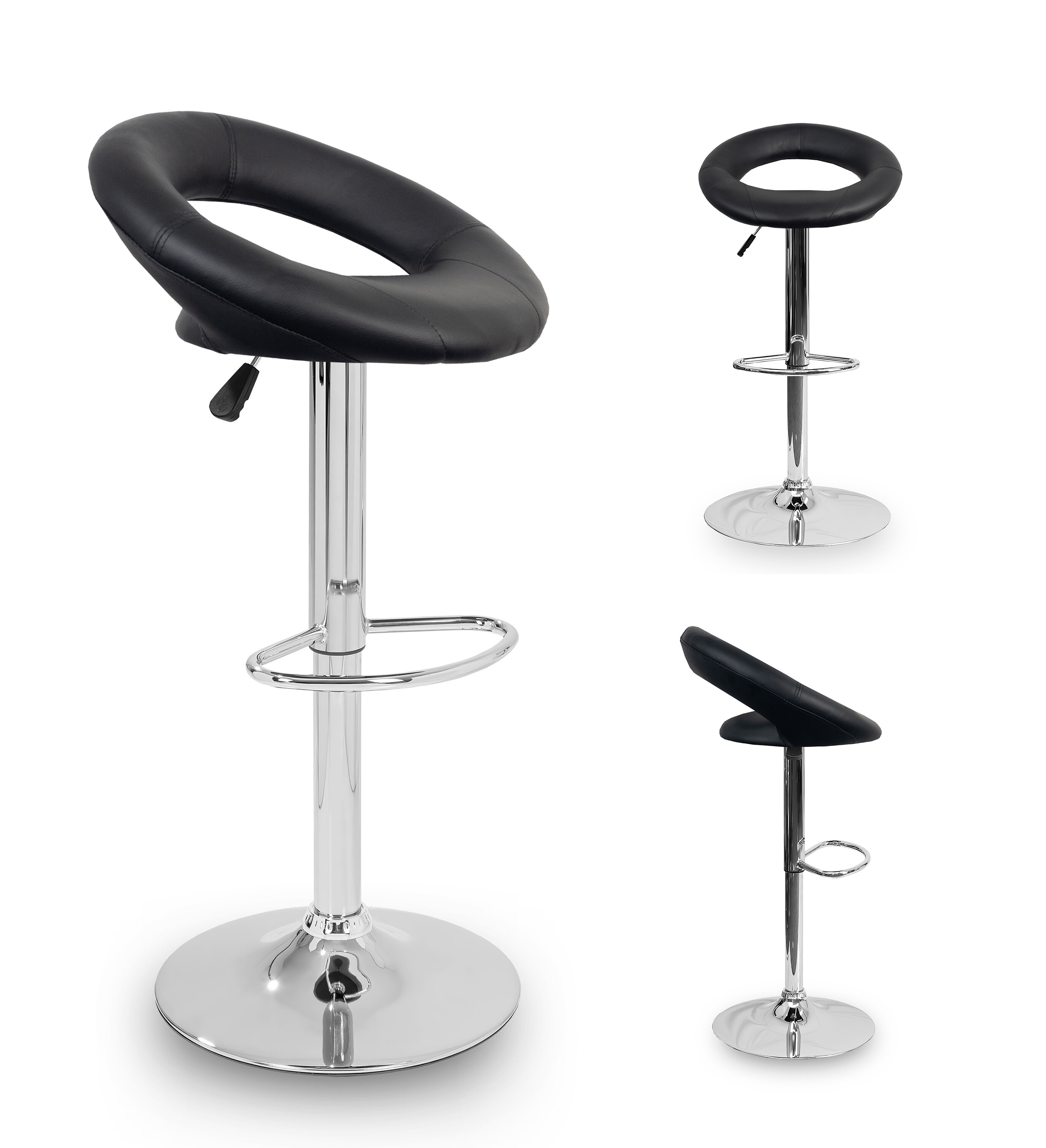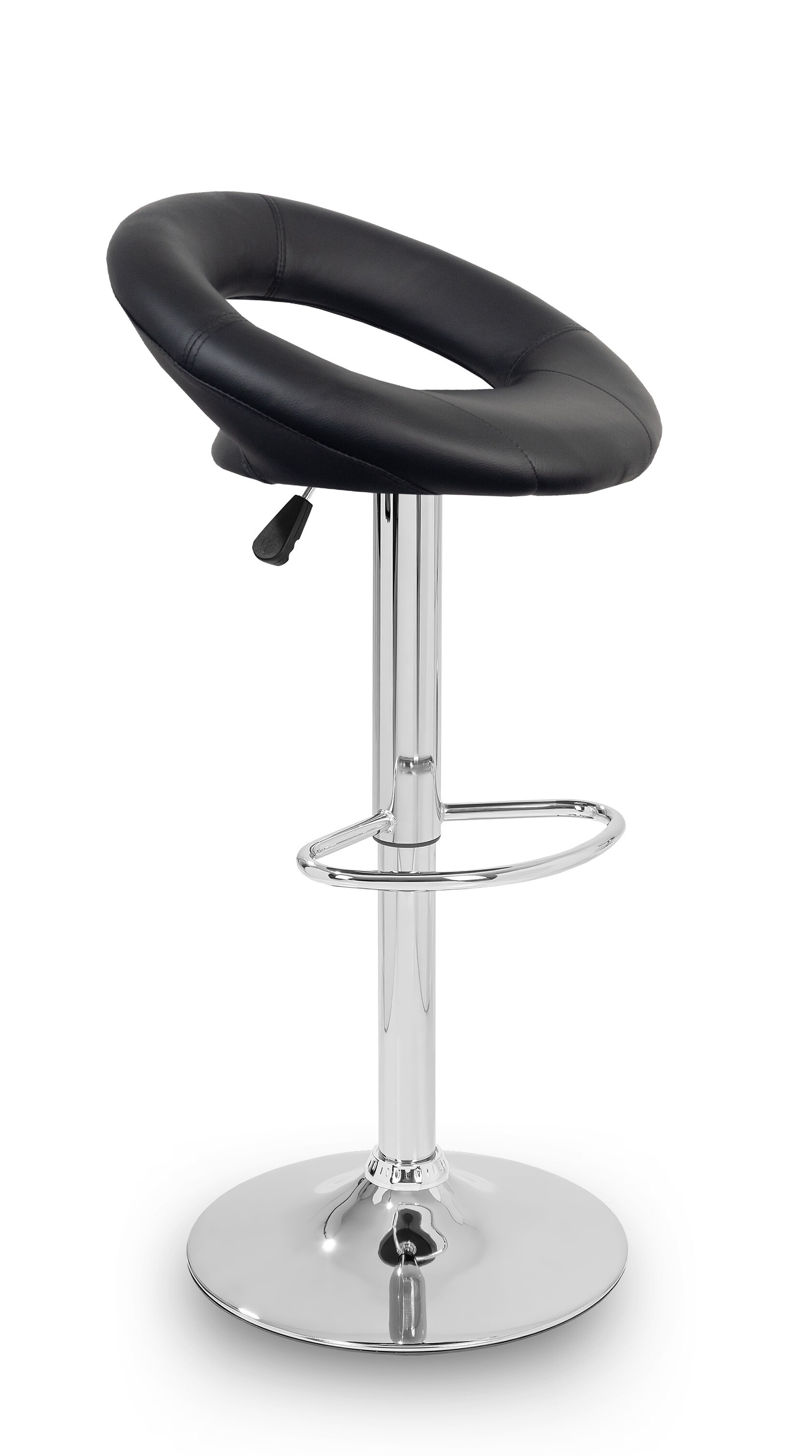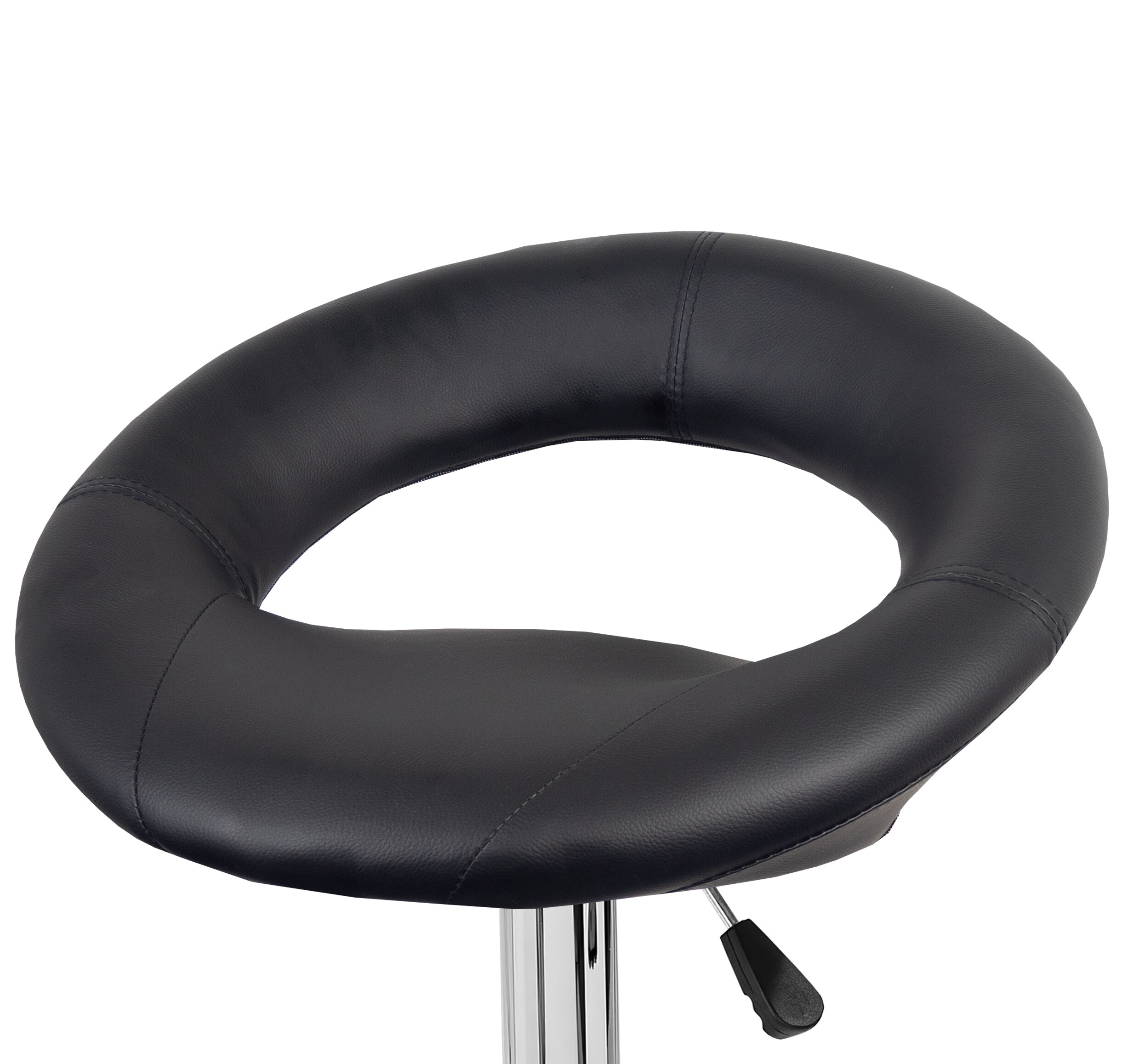 A szék kiemelkedik a kör alakú formáival, a kör alakú ülés összekapcsolódik a kör alakú háttámlával.A bárszék ülőfelülete műbőrből készült.