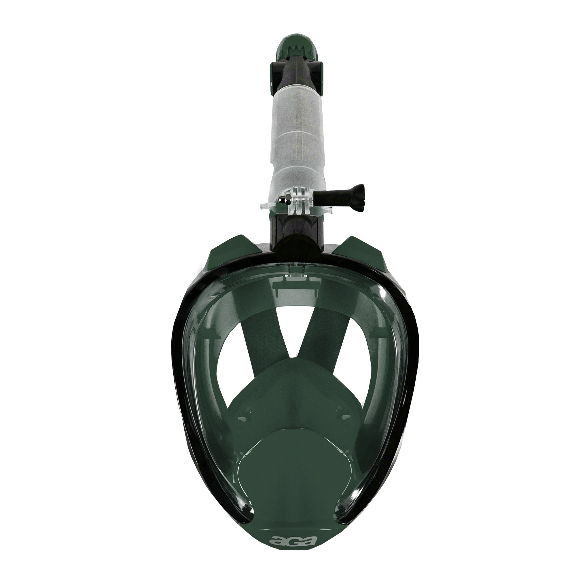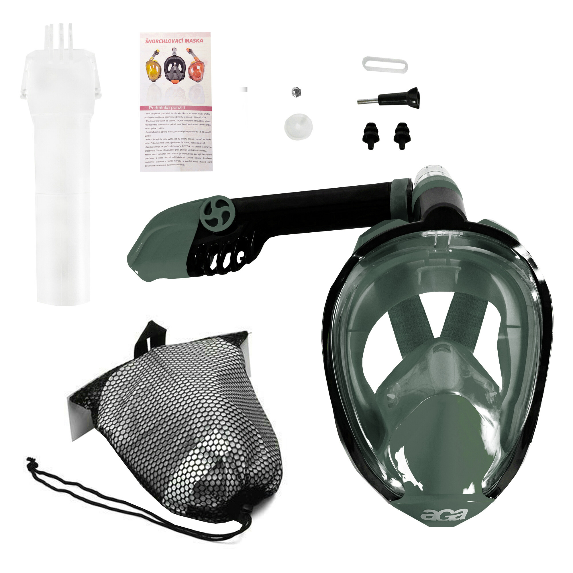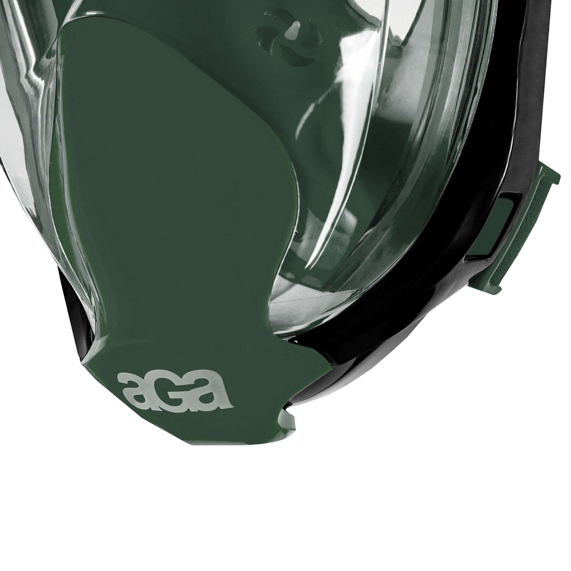 Az Aga búvármaszk polikarbonátból készült, és hatalmas védelmet nyújt a víz bejutása ellen, valamint kényelmes viseletet biztosít. 180°-os látószöget biztosít keringető légzőrendszerrel. Friss levegőt szív be az orrán és a száján keresztül, majd az egyirányú nyílásokon keresztül távozik a maszkból.