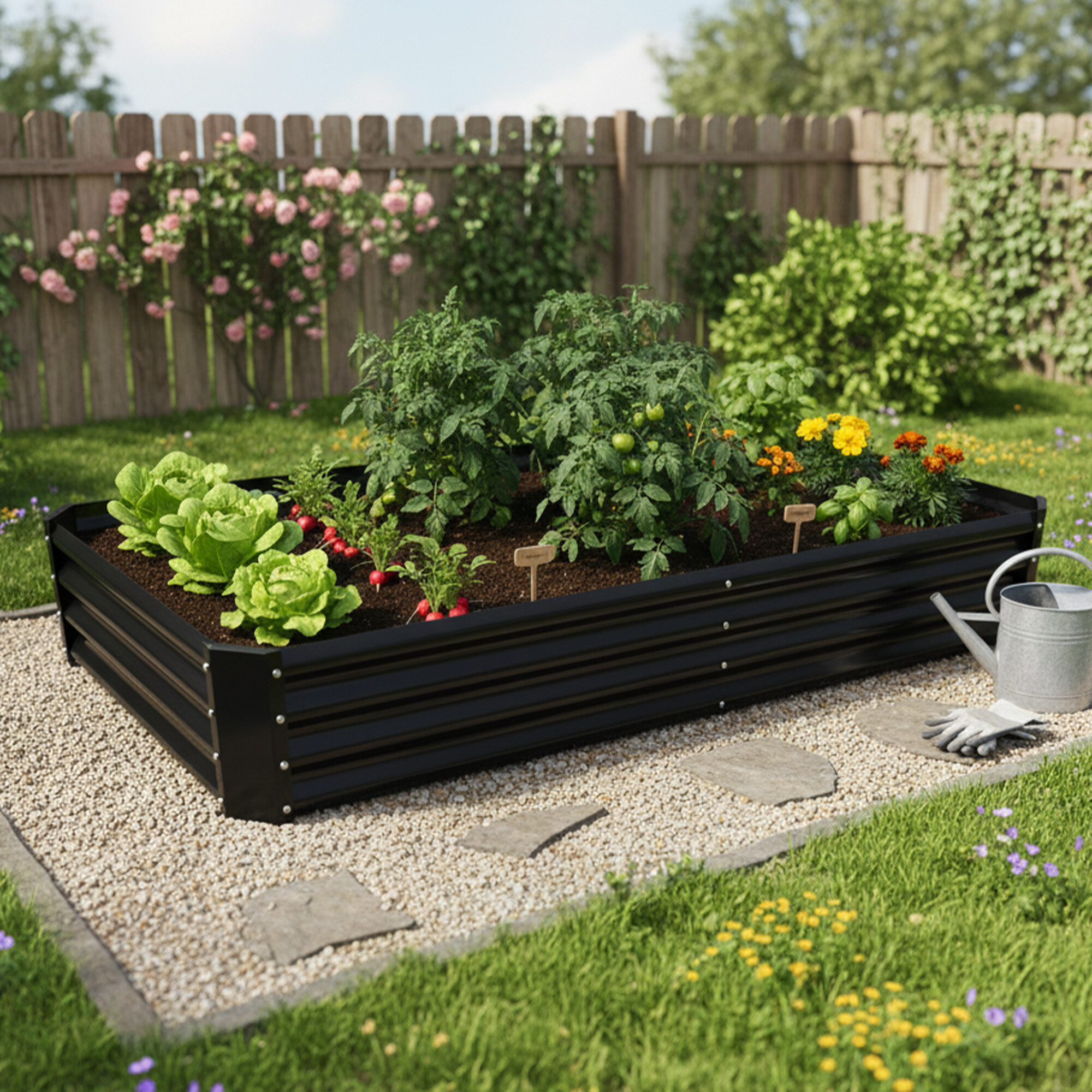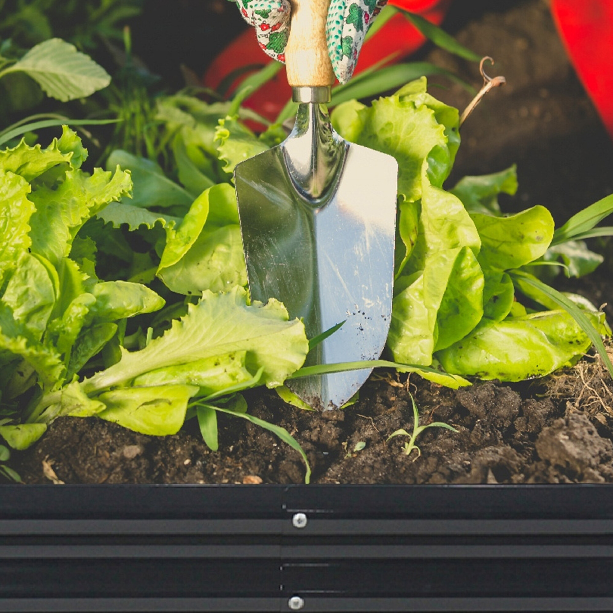 Az ágyás tartós horganyzott acélból készült, így kiválóan ellenáll az időjárásnak, és alkalmas kültéri használatra.
