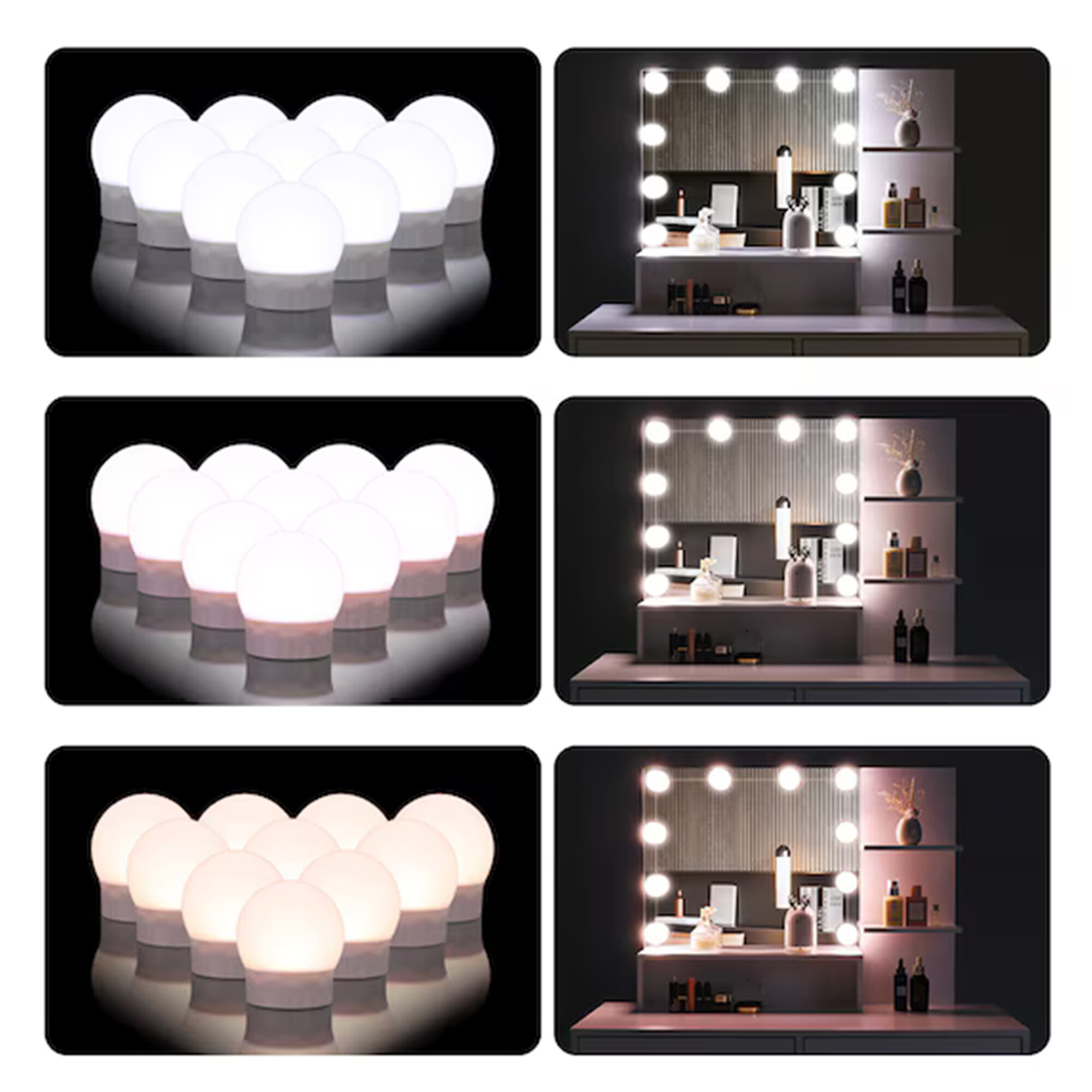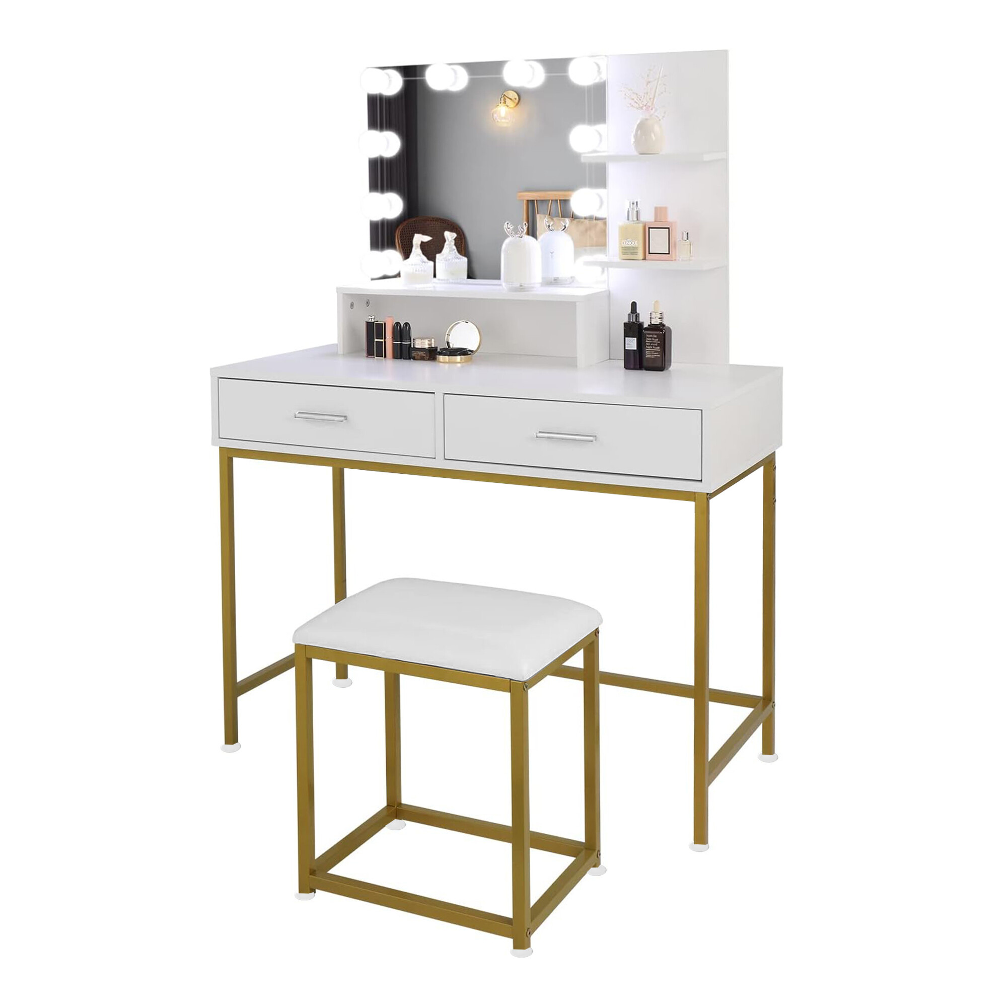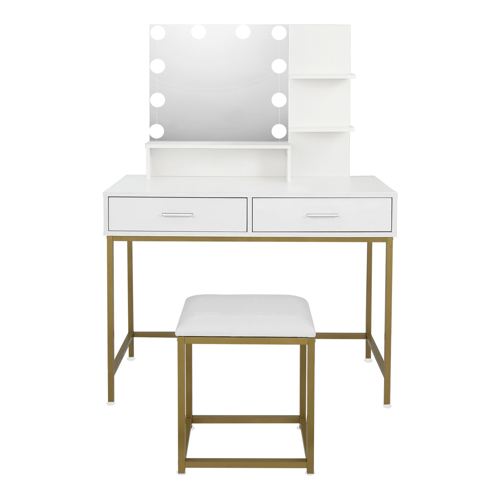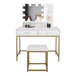 A tükörön 10 LED izzó található, így kényelmesen sminkelhet még rossz természetes fényviszonyok mellett is.A puff kiváló minőségű puha habból készült, amelyen órákig lehet ülni.
