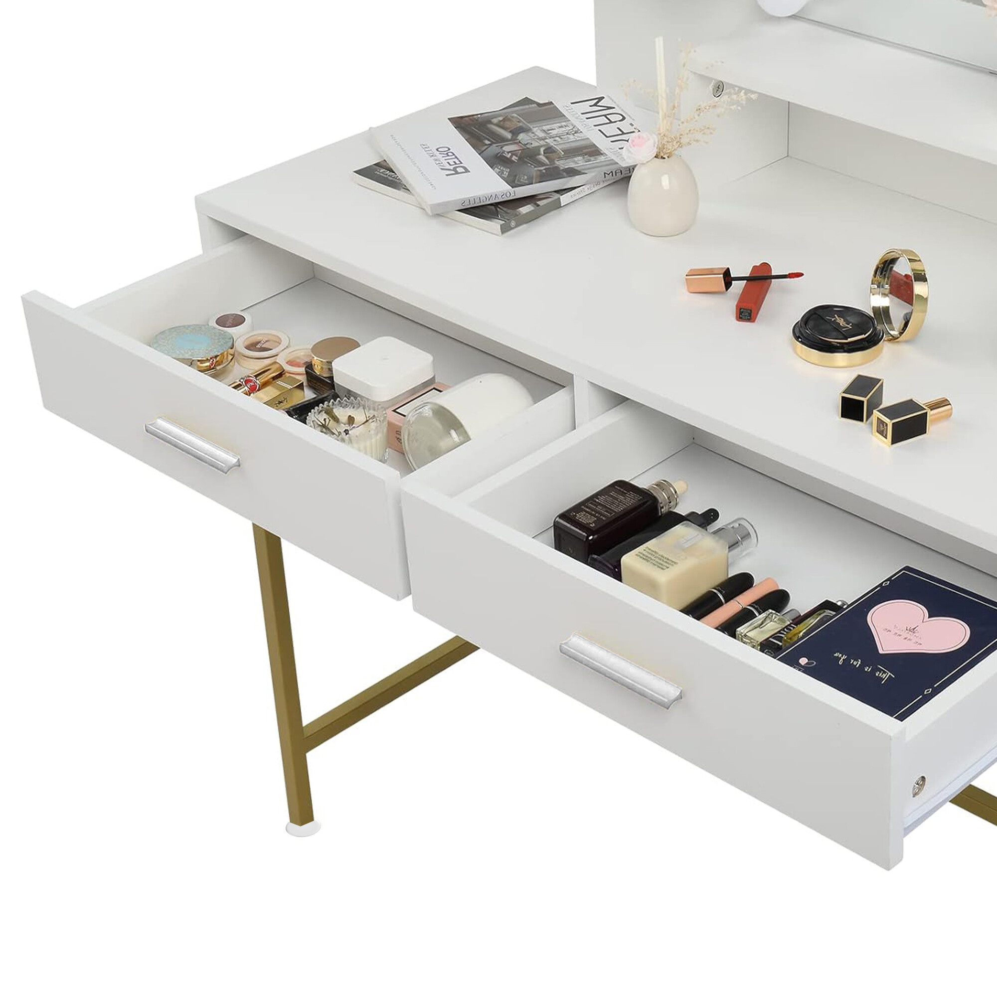Biztosan értékelni fogja a 2 tágas fiókot is, amelyekben kényelmesen elhelyezheti az összes kozmetikai eszközét, ékszerét és egyéb kiegészítőit.
