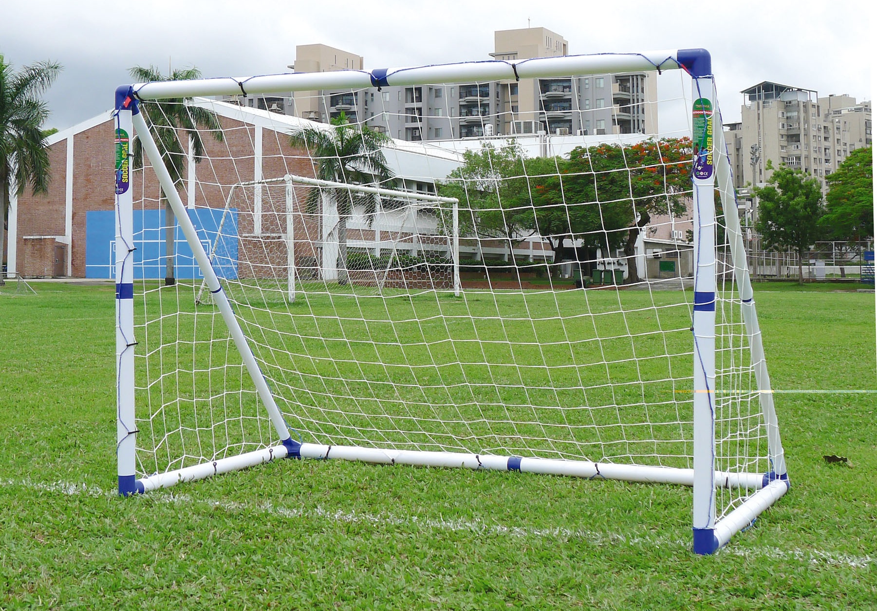 A csomag tartalmaz egy futballhálót is, amely a kapuszerkezethez a hálón lévő fűzőlyukak és rögzítőcsapok segítségével van rögzítve, amelyek a kapu földhöz rögzítésére szolgálnak, és így biztosítják a kapu rögzített helyzetét.