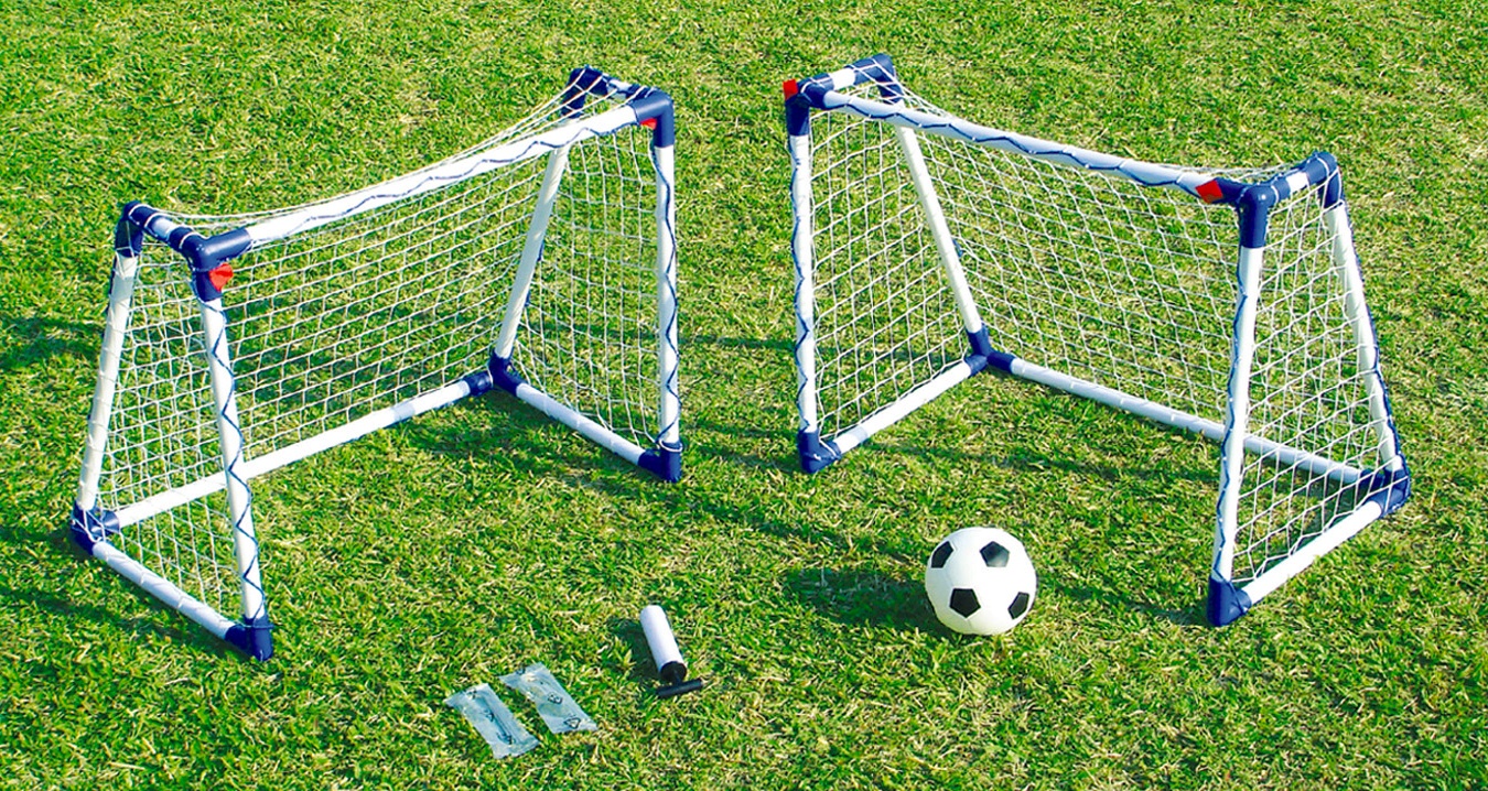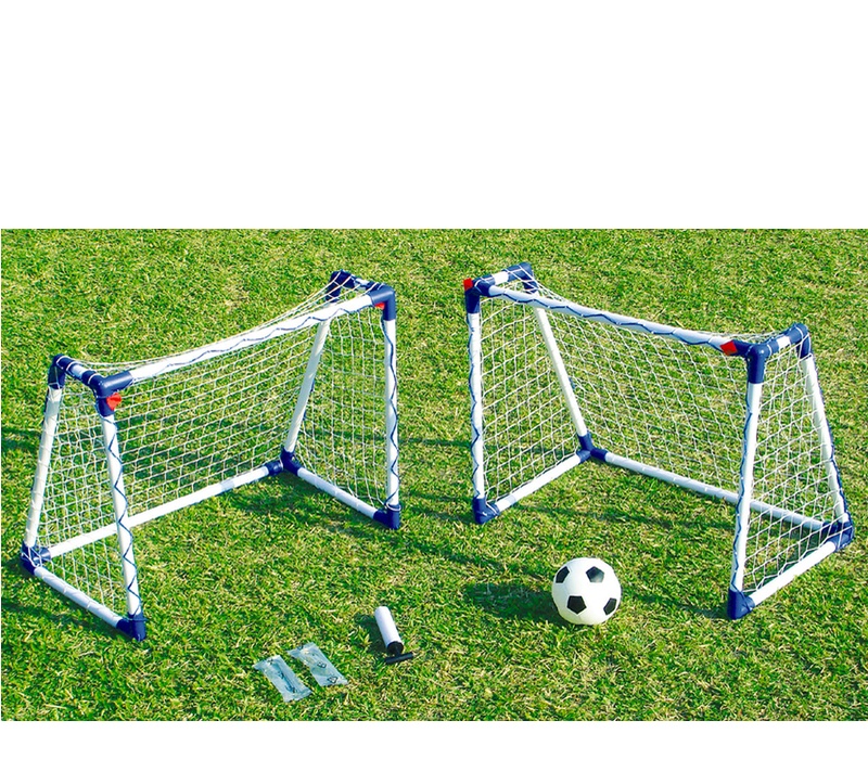 Focikészlet, amely két focikaput tartalmaz. A készlet alkalmas szabadidős használatra kertekben vagy játszótereken.
