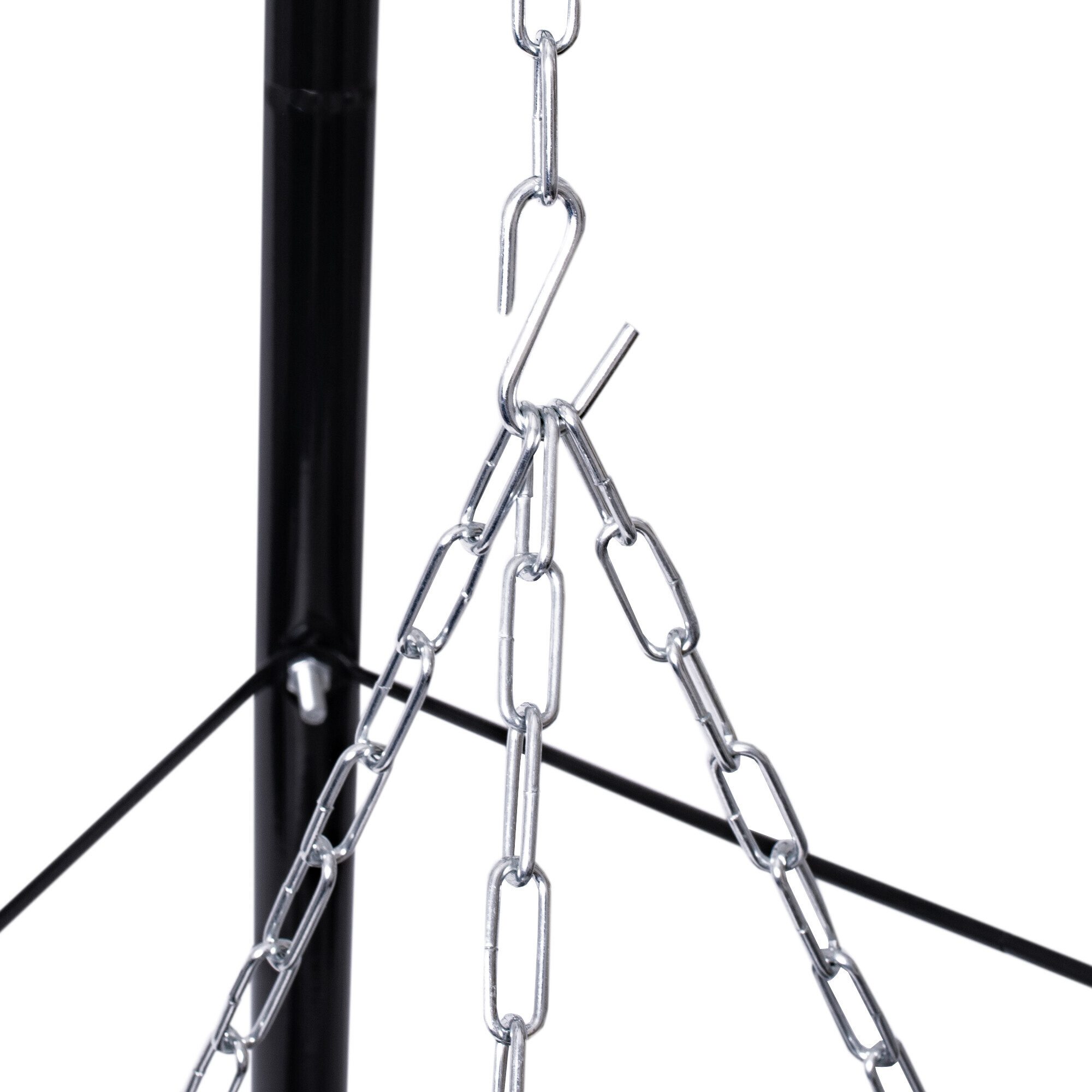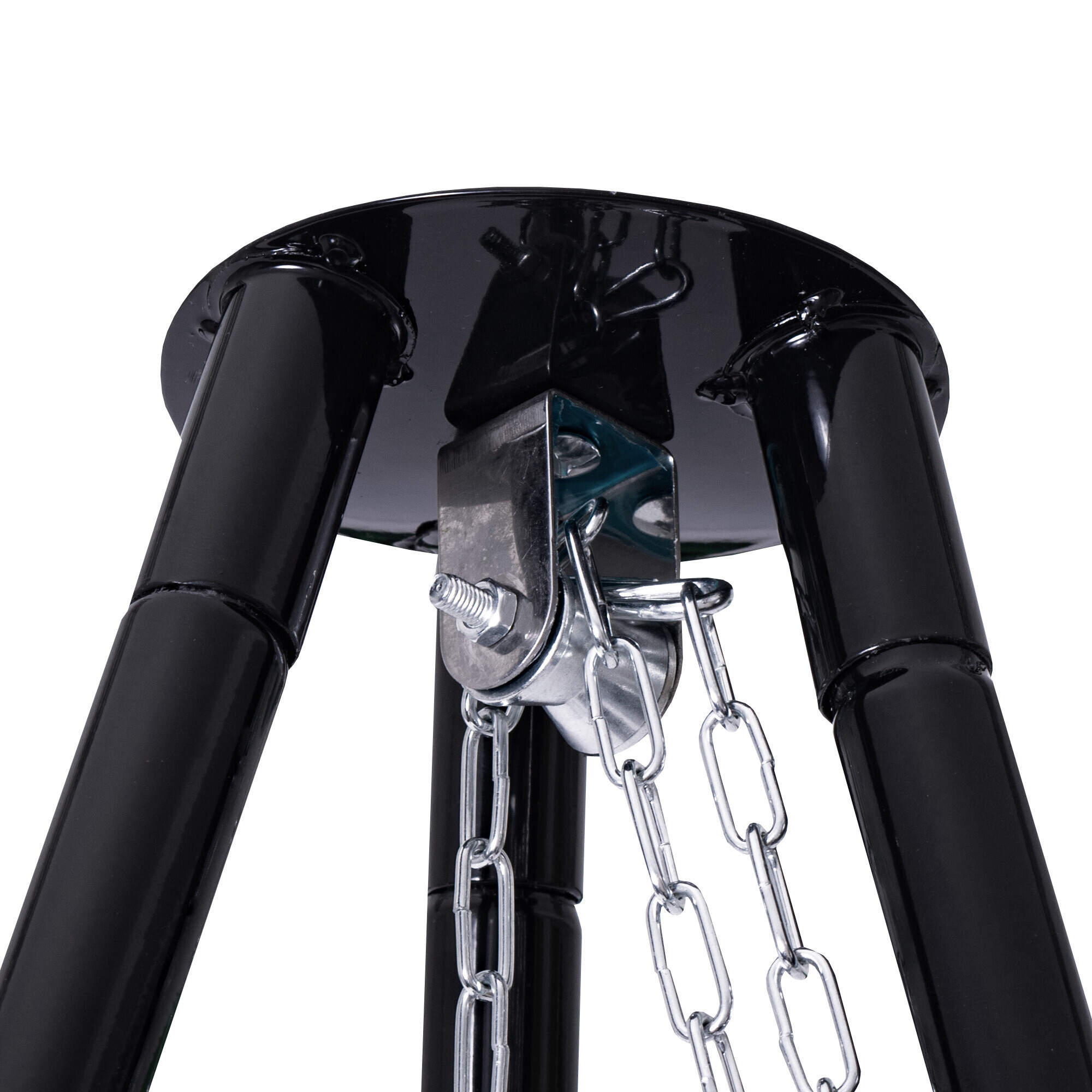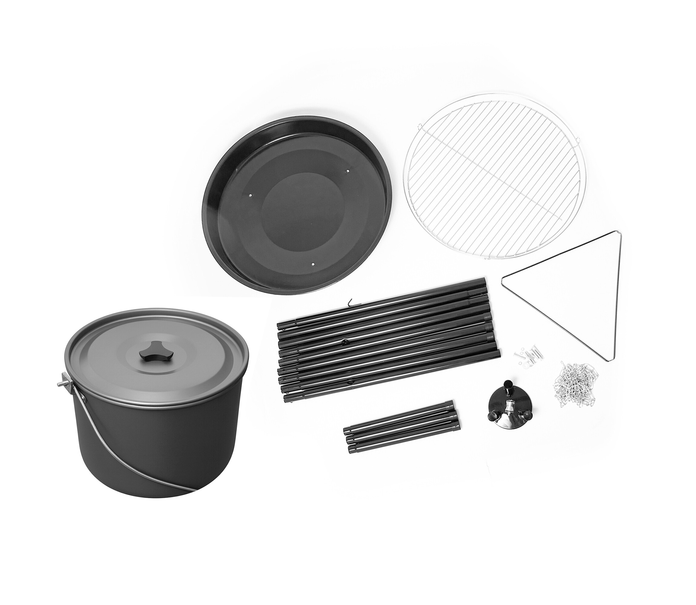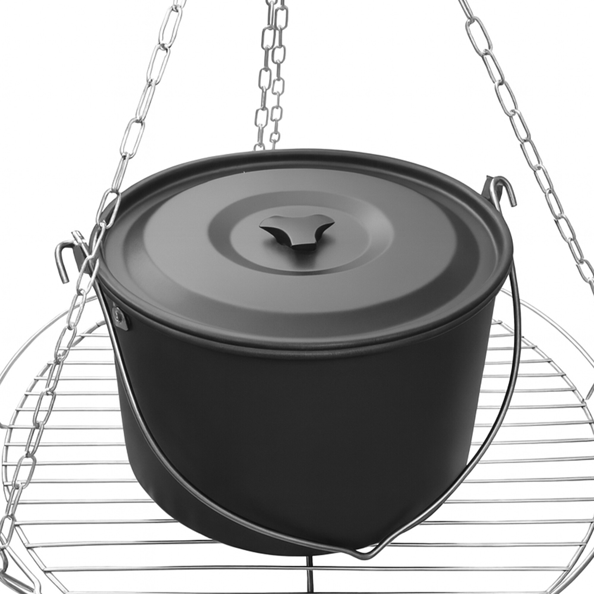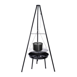 Magasságban állítható 3 az 1-ben kerti grill, amely egyesíti a tűzrakóhelyet, a függesztett rácsot és a bográcsot egy megoldásban. A praktikus láncrendszernek köszönhetően könnyedén beállíthatja a rostély vagy a bogrács magasságát a tűz intenzitása szerint, így a hús soha nem ég meg, és a gulyás pontosan olyan ízű lesz, amilyennek lennie kell.
