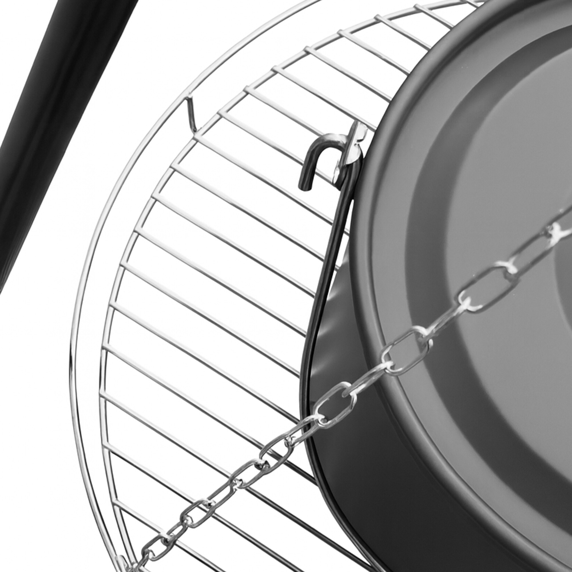A grill kiváló minőségű acélból készült, korróziógátló felületkezeléssel. A stabil háromláb biztonságos használatot biztosít, míg a 48 cm-es rács és az 51 cm-es tűzhely elegendő helyet nyújt a kényelmes grillezéshez családdal és barátokkal.
