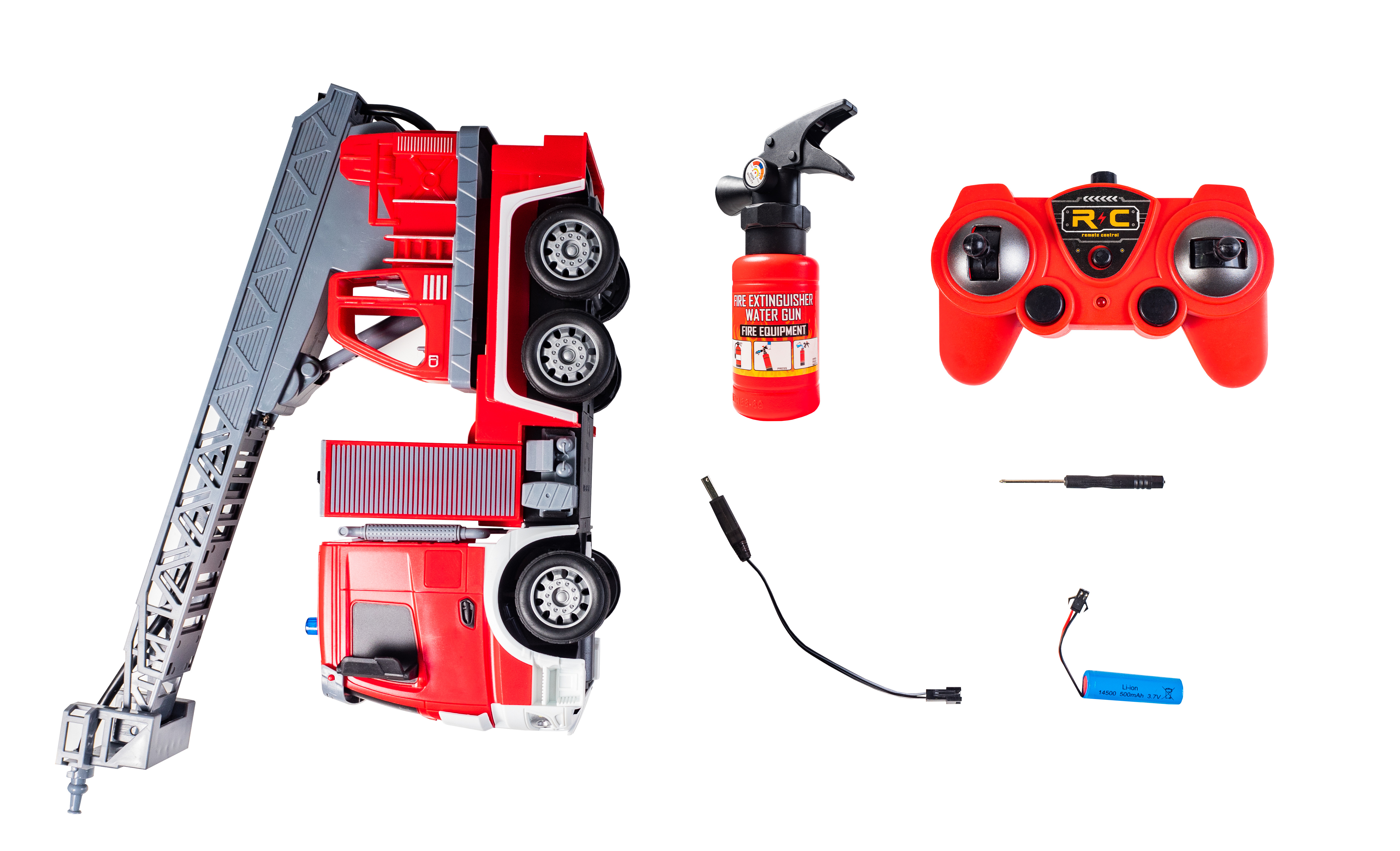 - A csomag tartalma - tűzoltó jármű, USB töltő (kábel), 3,7V akkumulátor és tűzoltó készülék (a víztartály könnyebb feltöltéséhez)