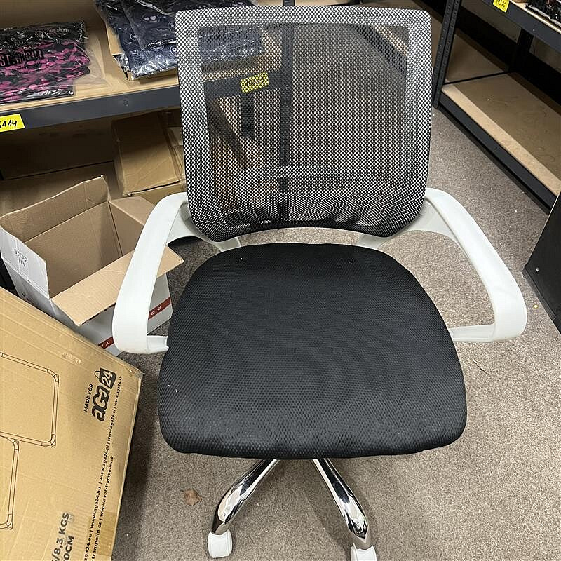 Fejtámla nélküli irodai szék, amely fekete - fekete színben, háló és műanyag kombinációjában készült.