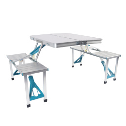Függetlenül attól, hogy mit tervez az asztalra helyezni, biztos lehet benne, hogy a nehezebb tárgyakat is elbírja. Az asztal napernyő elhelyezésére szolgáló nyílással is fel van szerelve, így megvédheti magát a naptól, és élvezheti a pikniket még a forró nyári napokon is.Ennek a kemping készletnek a karbantartása nagyon egyszerű. Az alumínium szerkezet és az MDF asztallap ellenáll a szennyeződéseknek és könnyen tisztítható. Elég csak egy nedves ruhával letörölni, és a készlet újra olyan lesz, mint új korában.