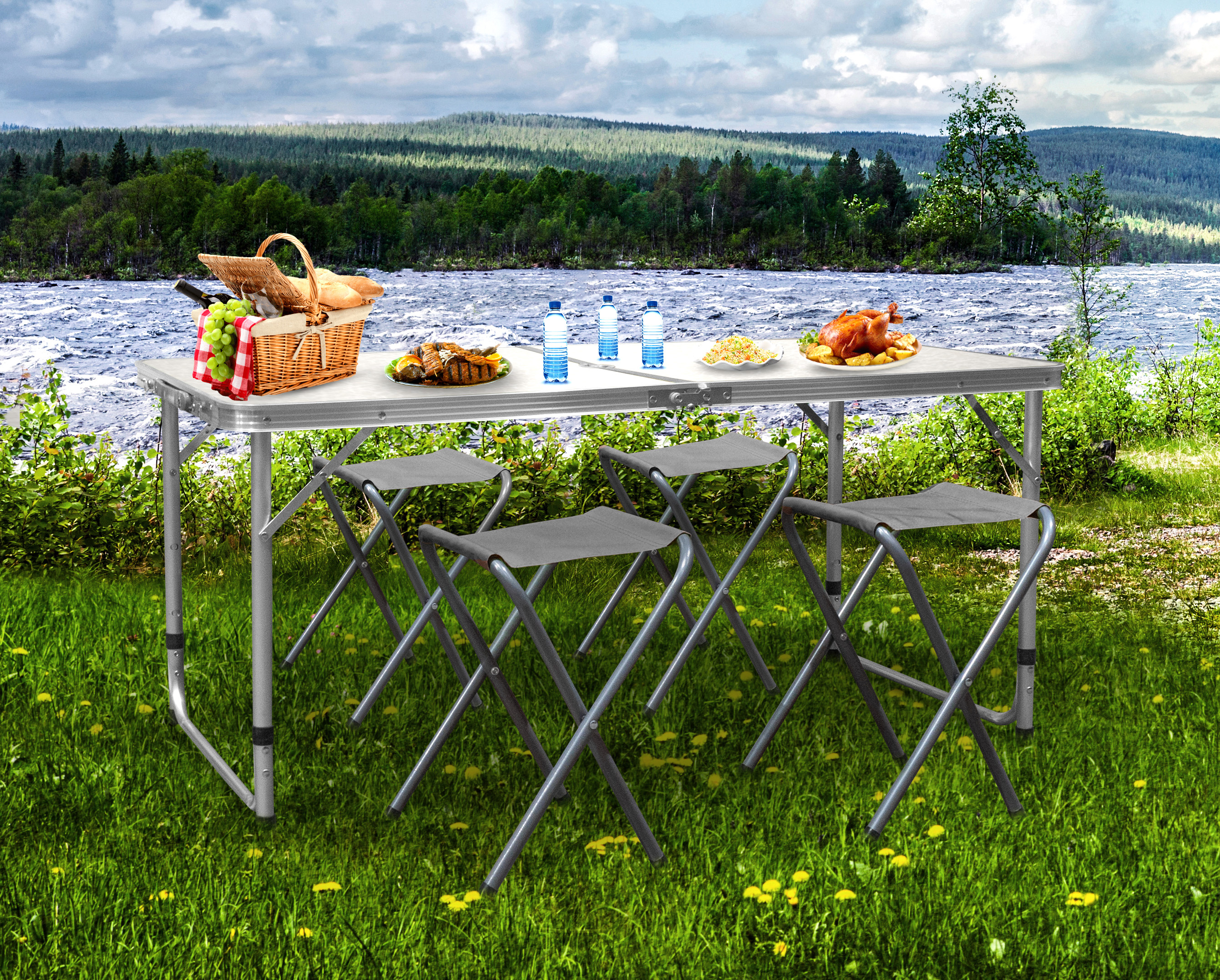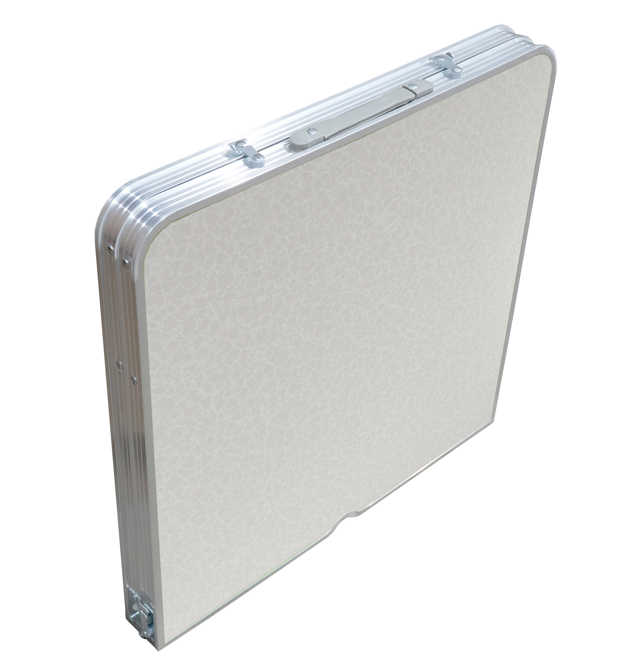 A kemping szett egy kis bőrönd formájára hajtható össze.A része egy fül is, amelynél fogva az összecsukott asztalka könnyen szállítható.