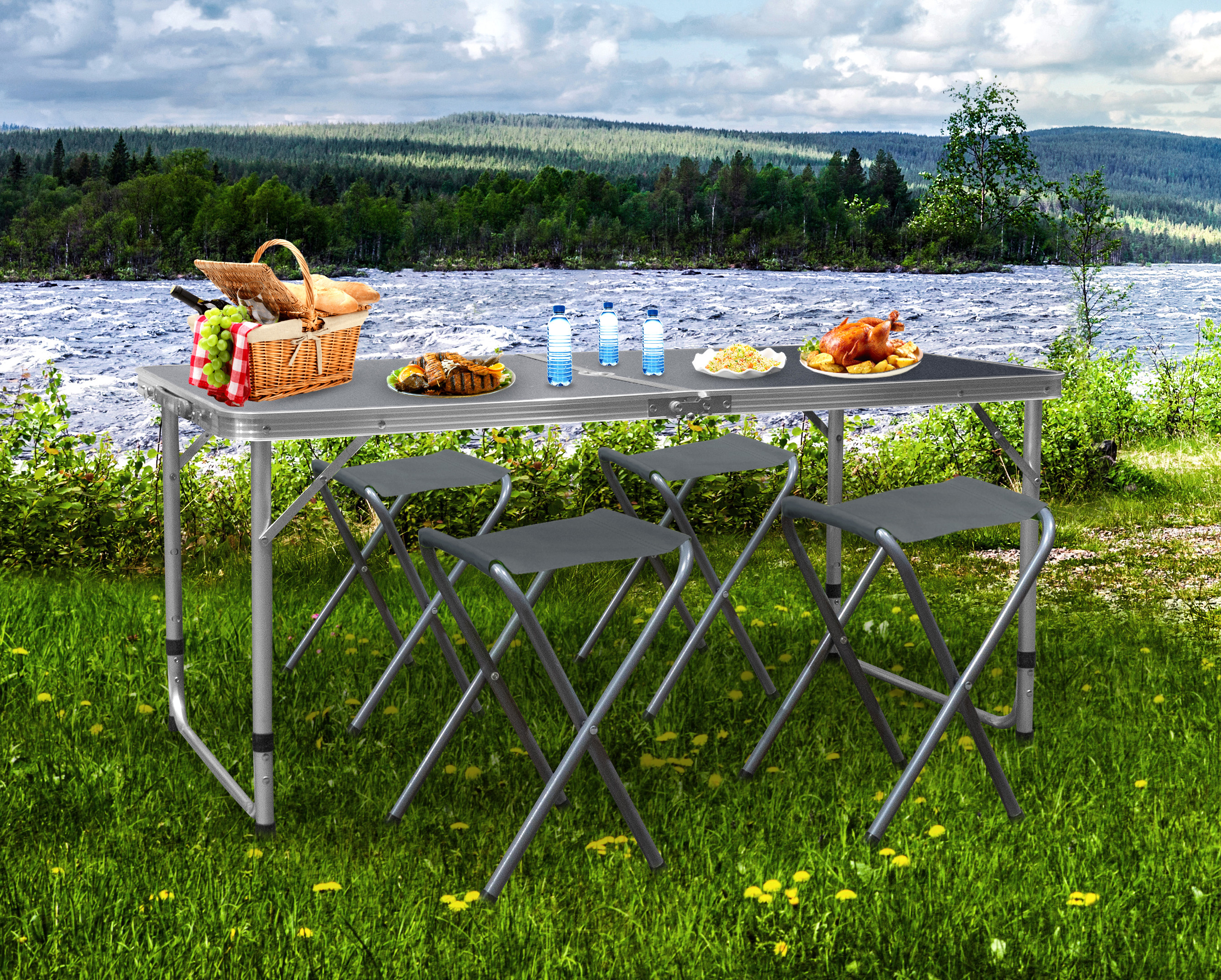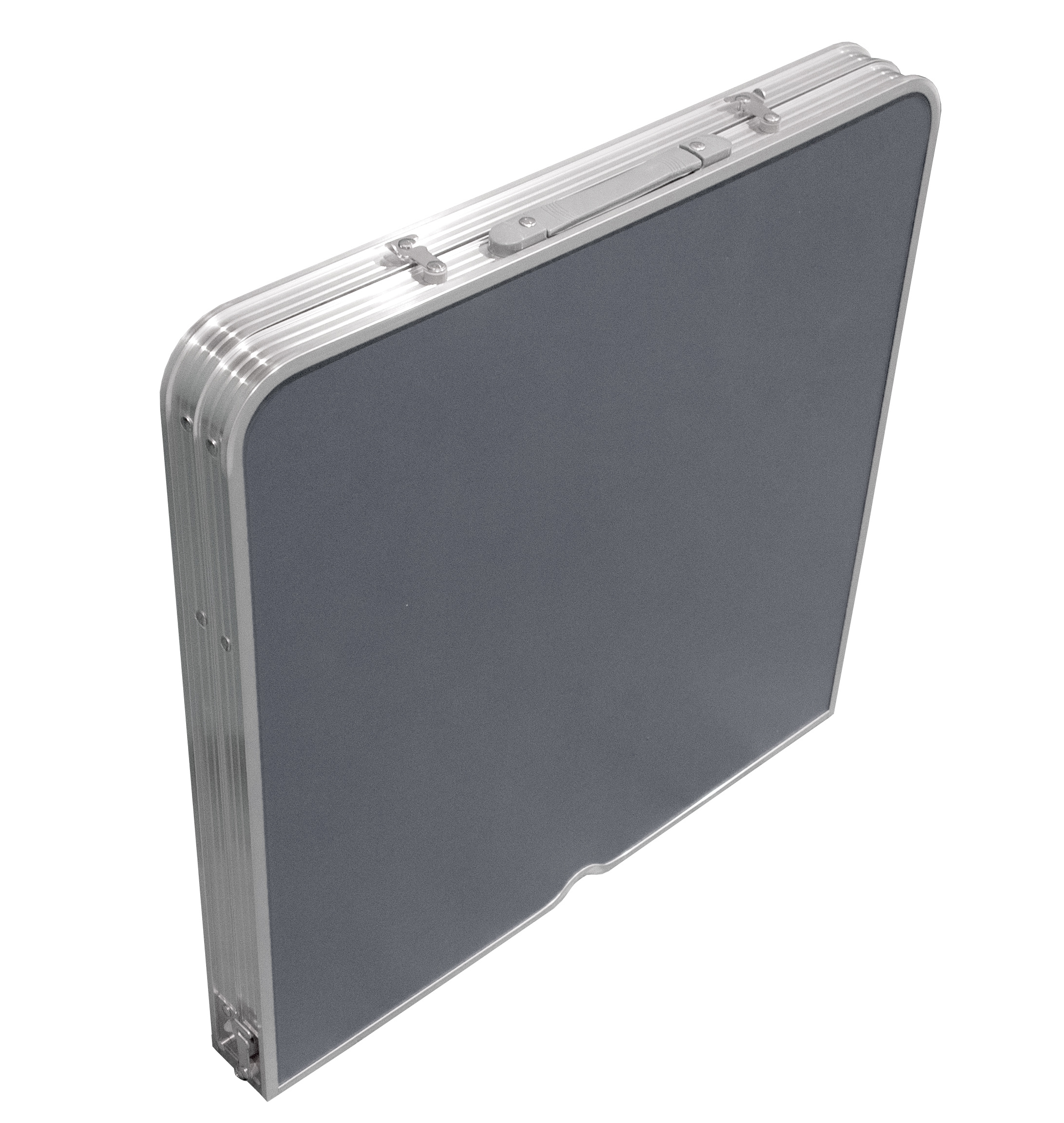 A kemping szett egy kis bőrönd formájára hajtható össze.A része egy fül is, amelynél fogva az összecsukott asztalka könnyen szállítható.