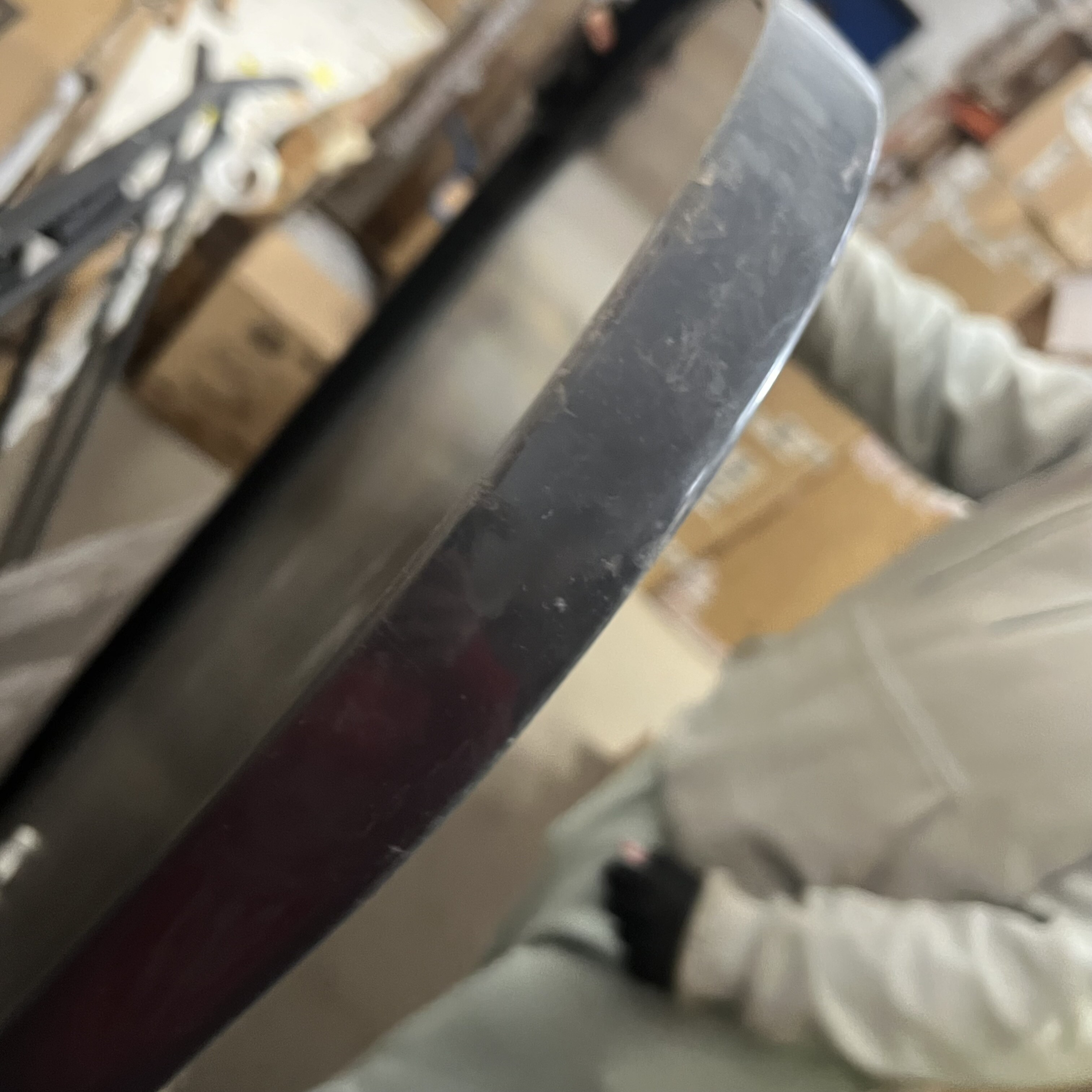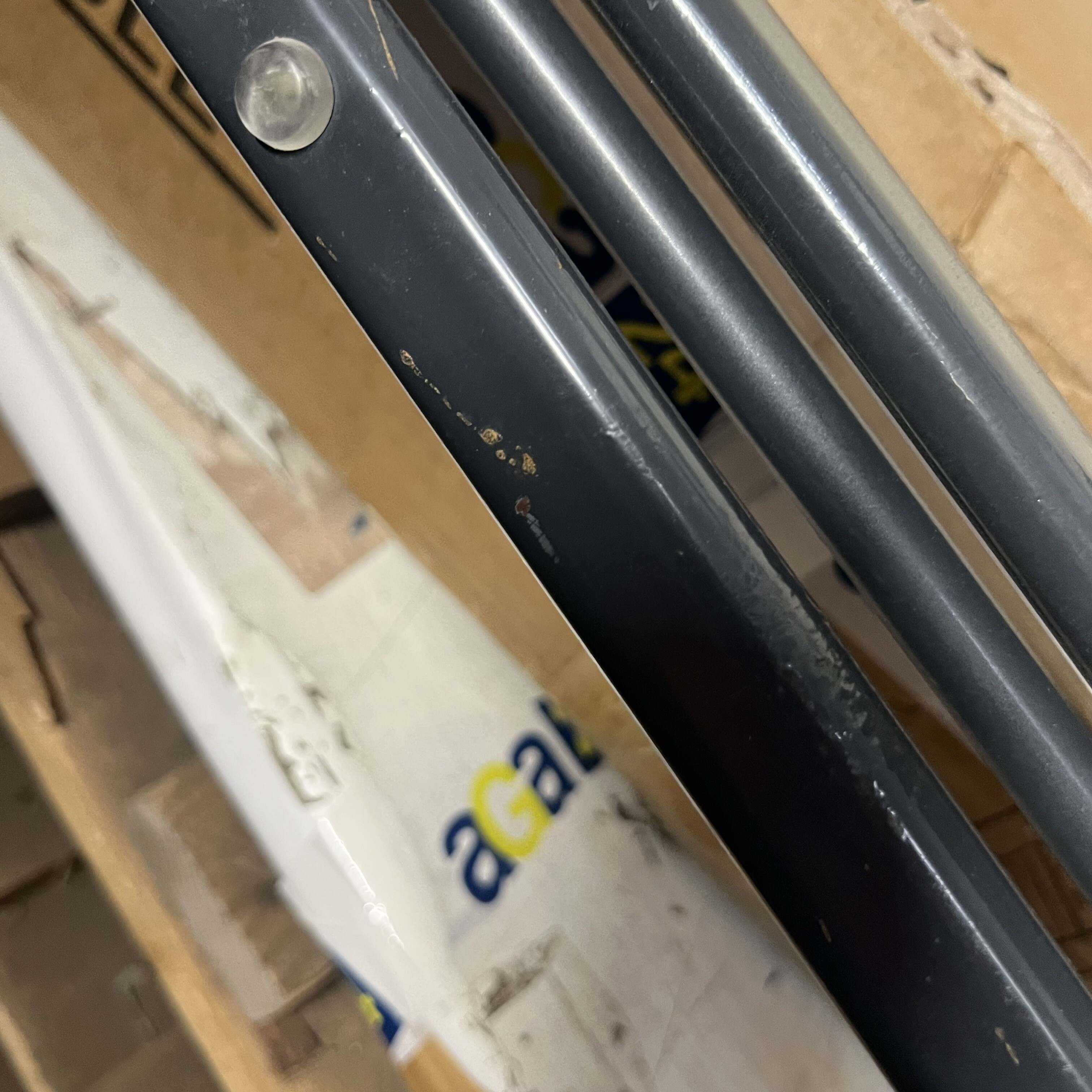 Az asztal sérülés jeleit mutatja, a keret egyik oldalon leválik, karcos, és hiányoznak a lábak végződései.