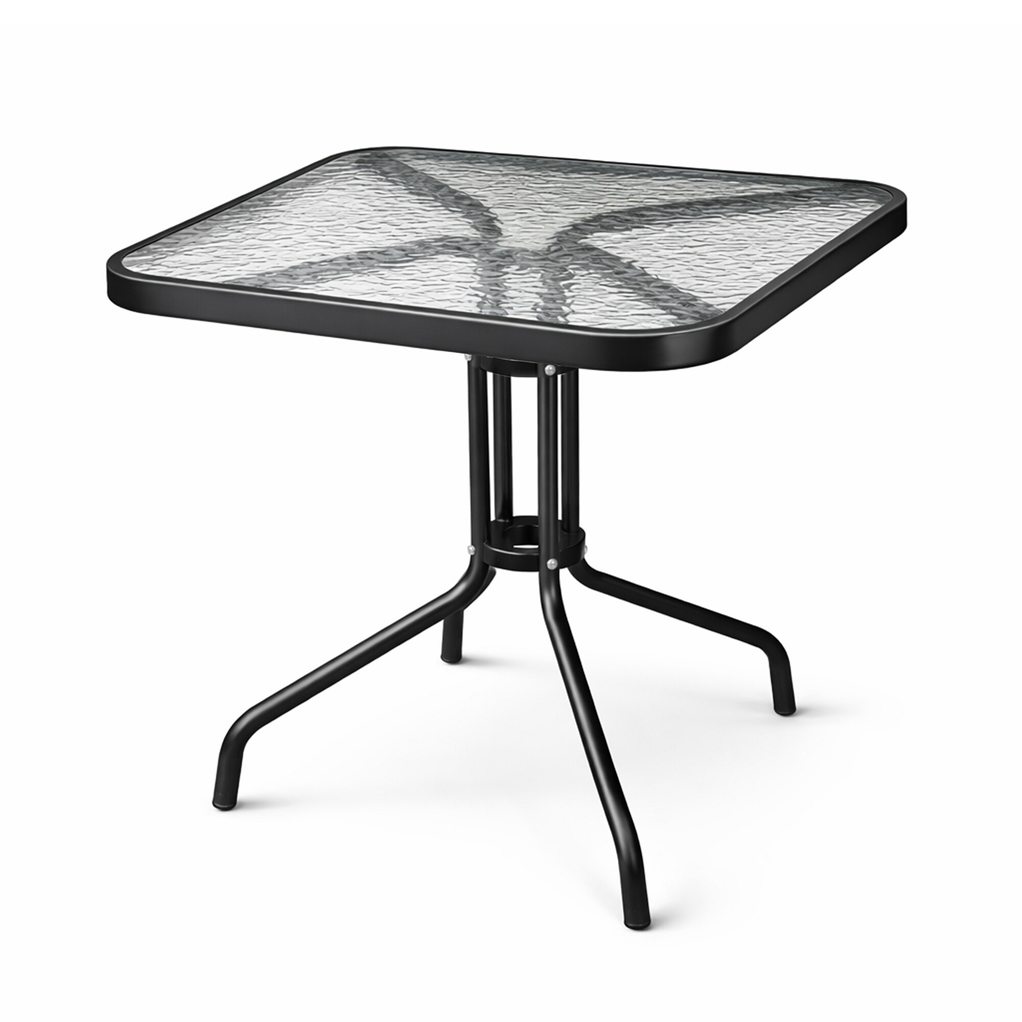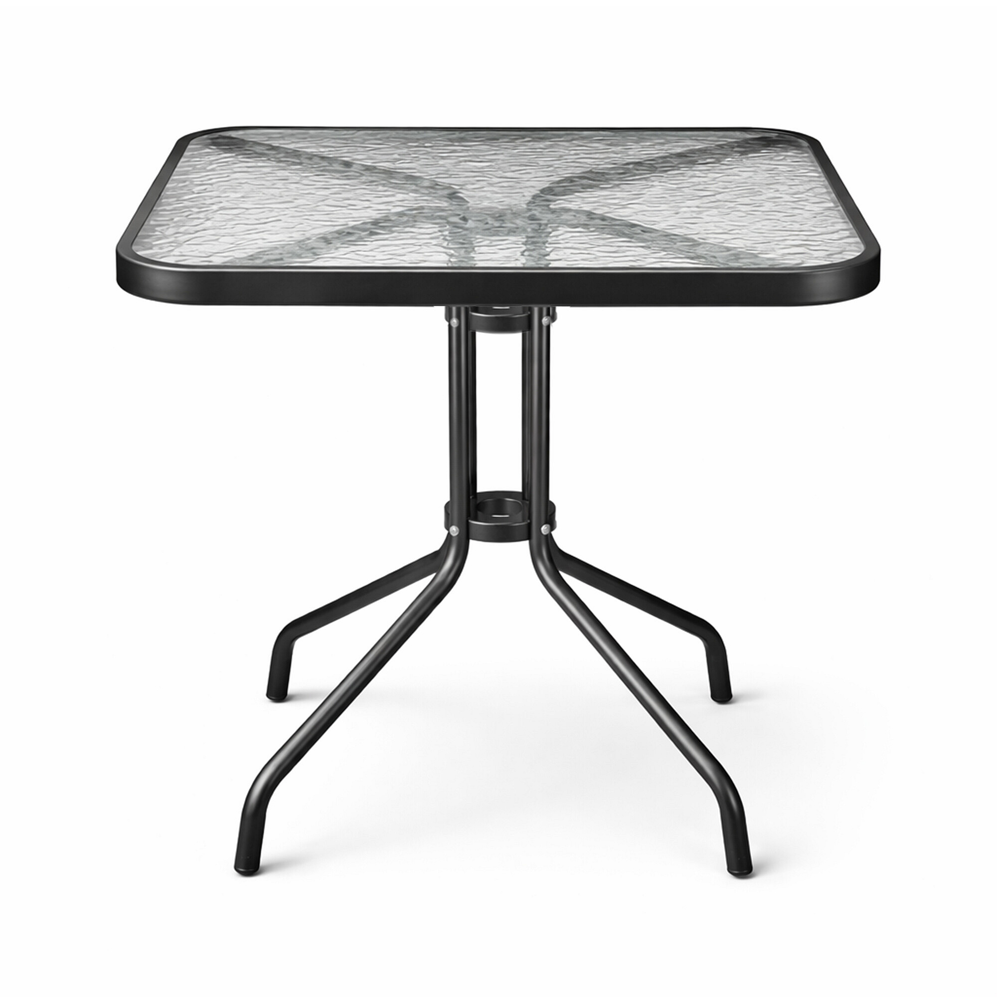 Kerti asztal erős fém vázzal és üveglappal, alkalmas kertekbe, teraszokra, kávézókba, pavilonokba, erkélyekre.