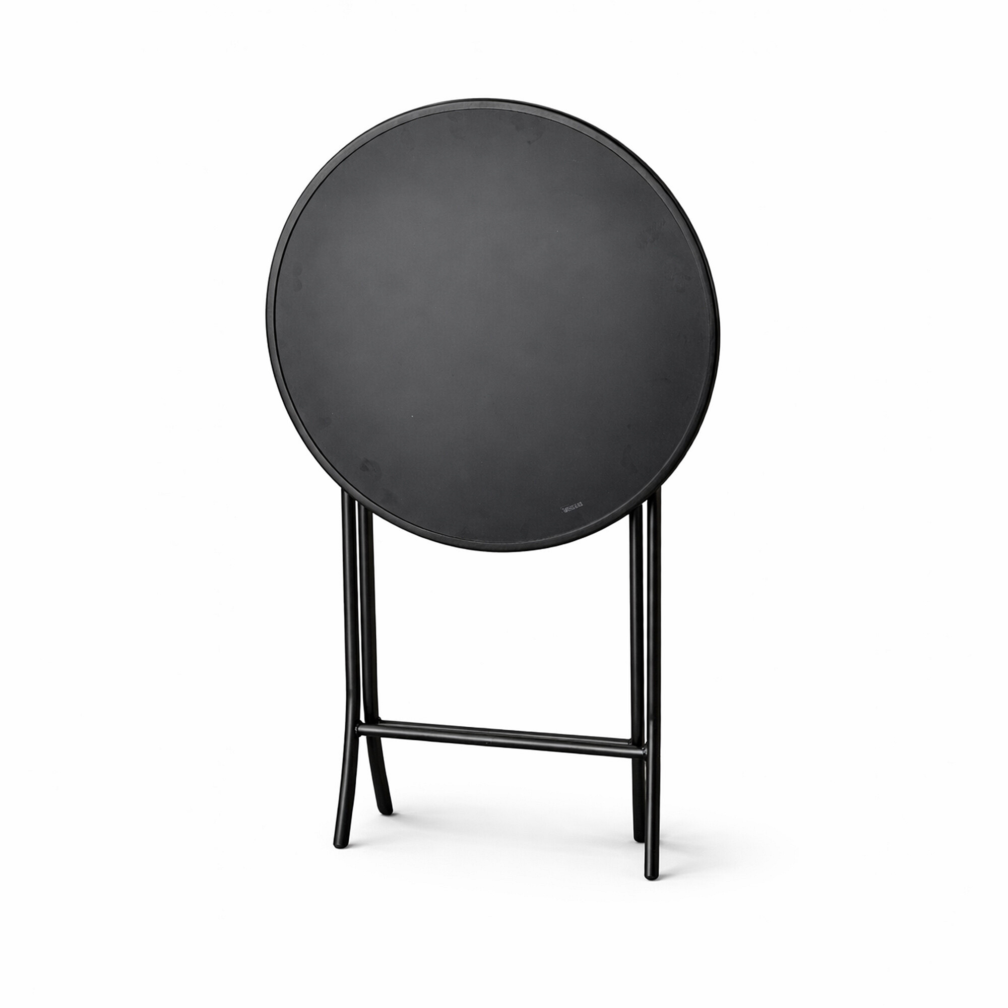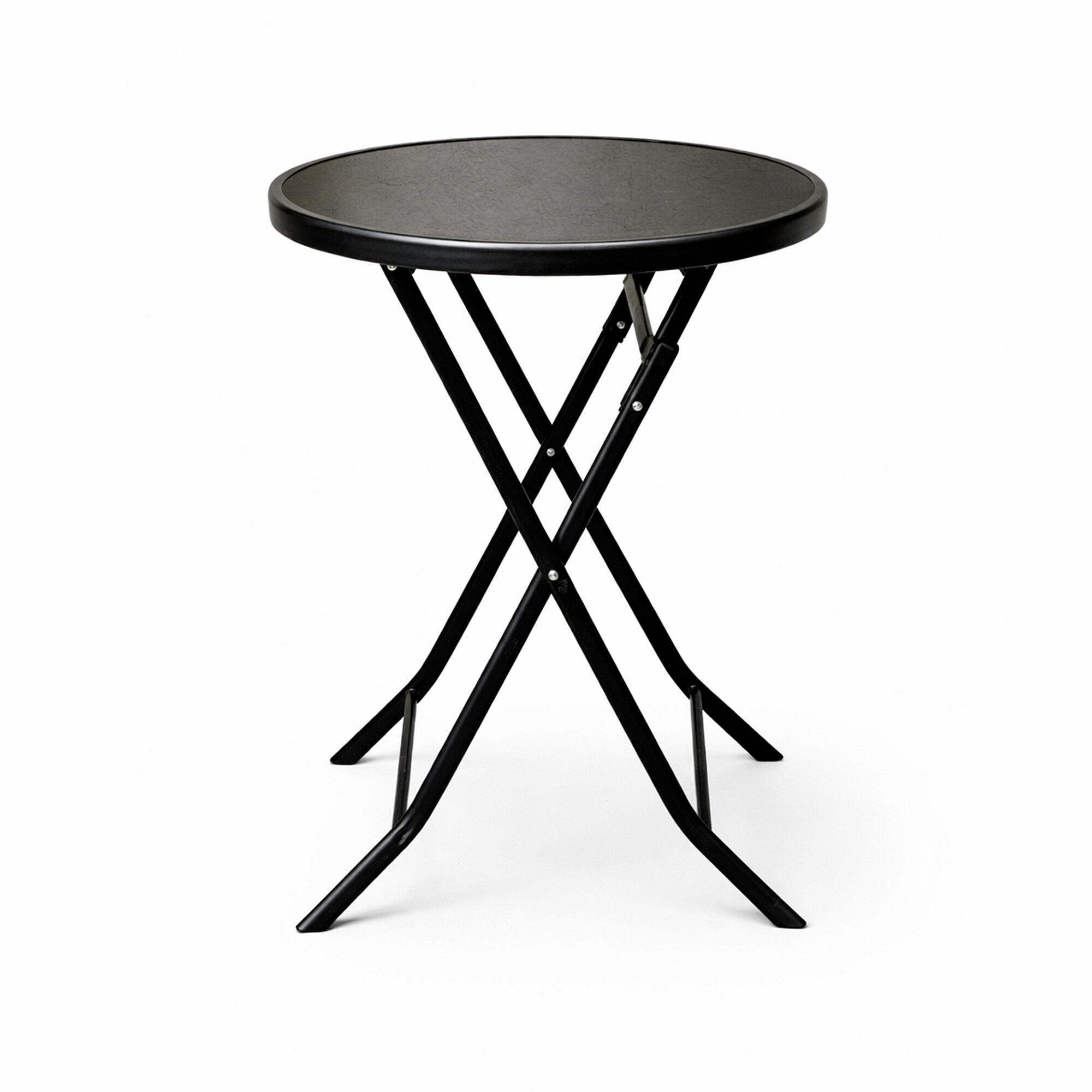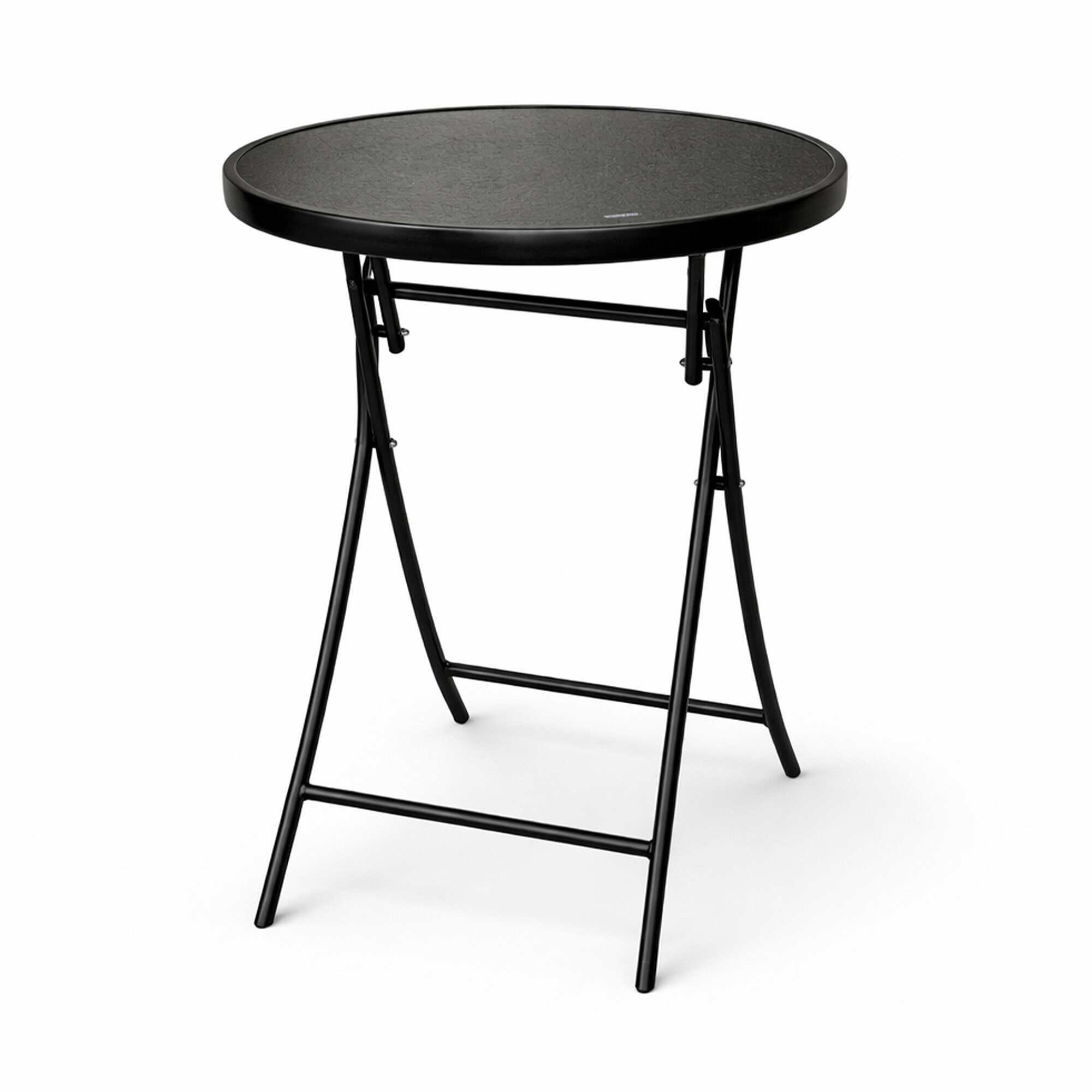 Kerek kerti asztal masszív fém vázzal és üveglappal, alkalmas kertekbe, teraszokra, kávézókba, pavilonokba, erkélyekre.