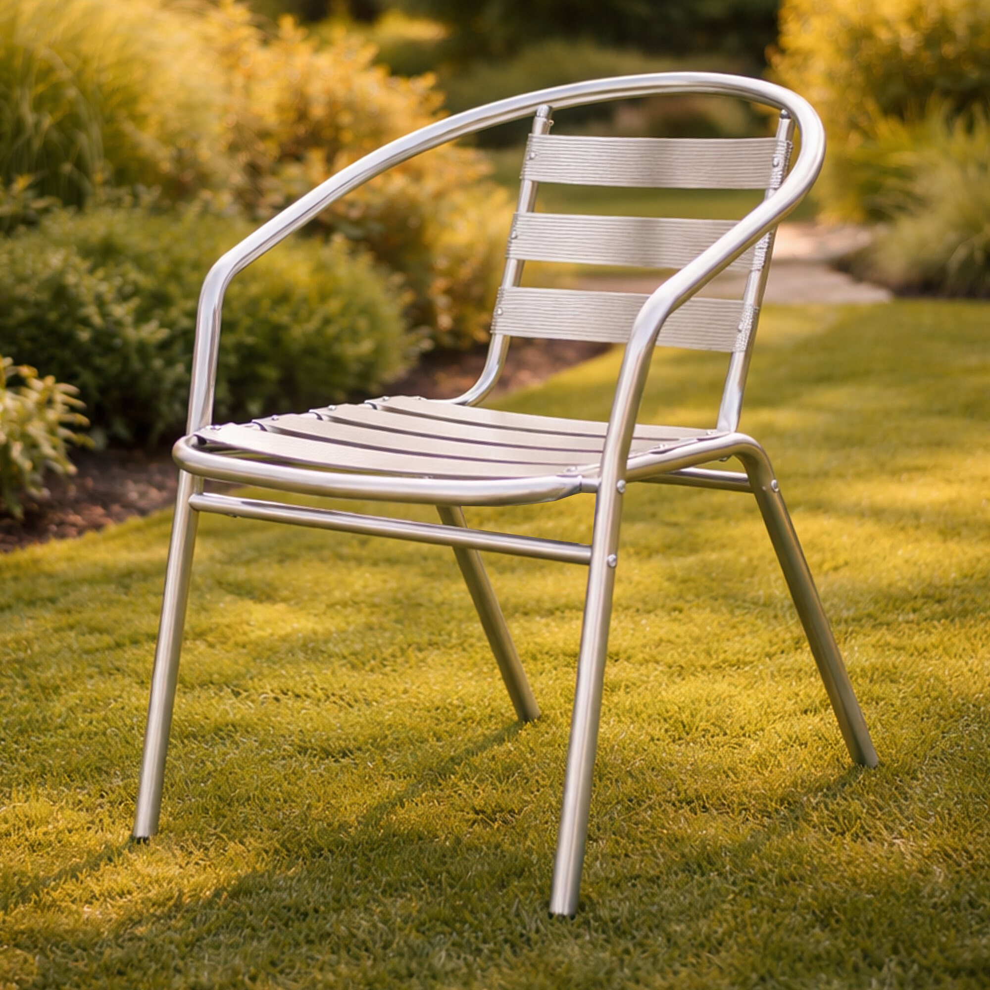 Modern dizájnú, teljes alumínium szerkezetű kerti szék, amely alkalmas kertekbe, teraszokra, verandákra, erkélyekre vagy kerti éttermekbe.