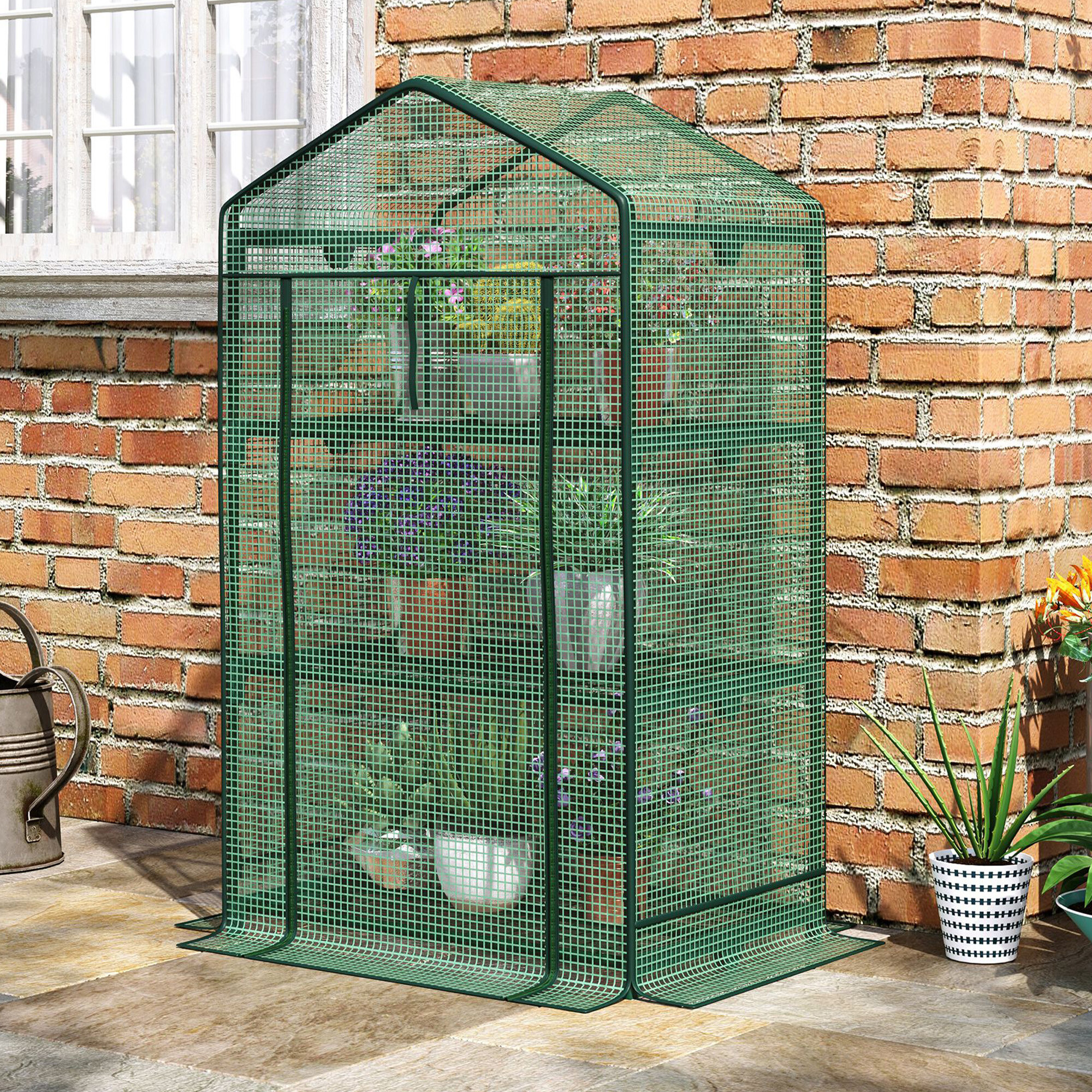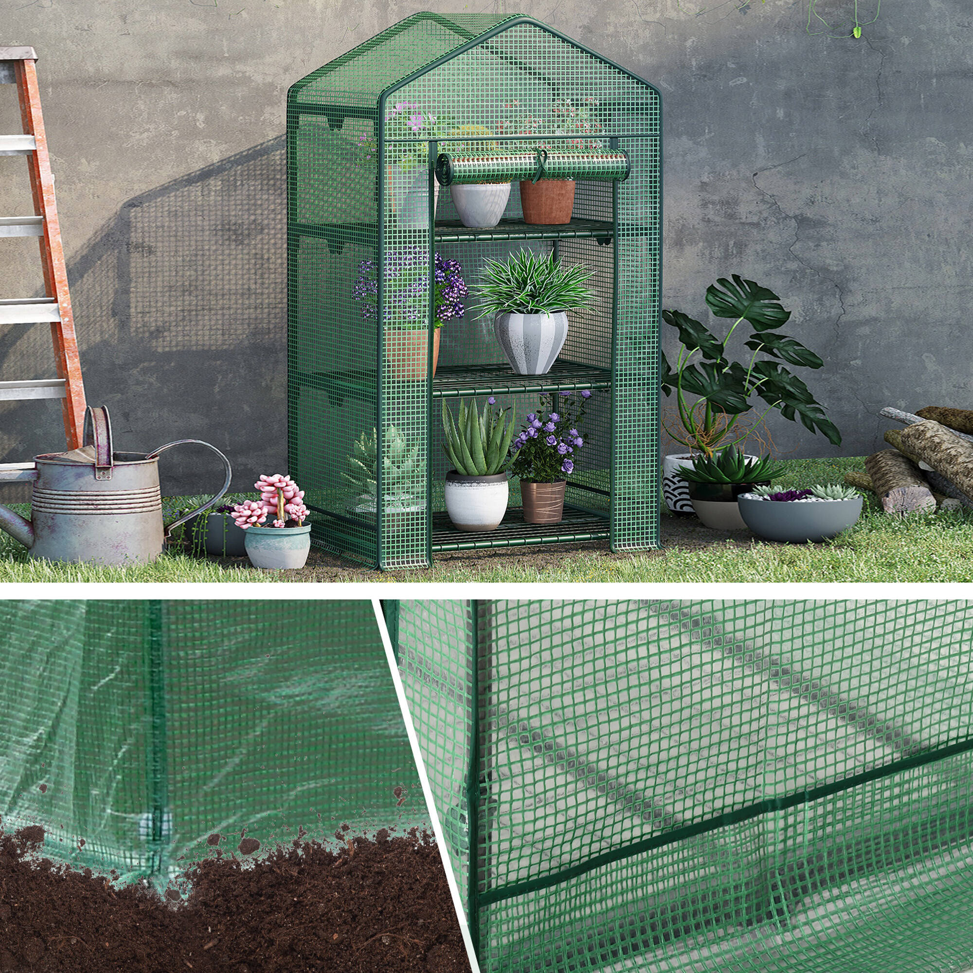A fóliasátor három polccal van felszerelve, feltekerhető ajtóval és könnyű szerkezettel rendelkezik, így könnyen áthelyezheti igényei szerint.