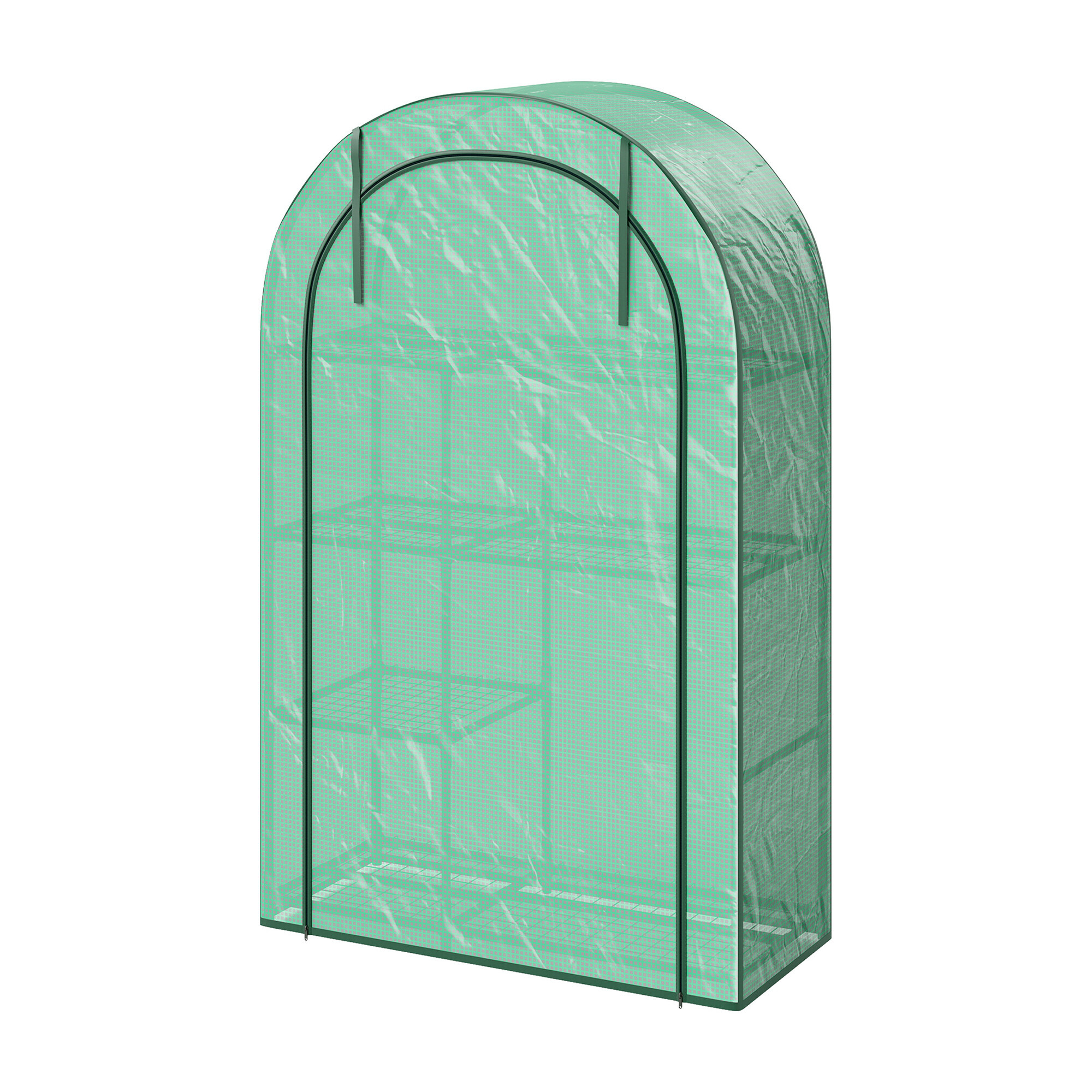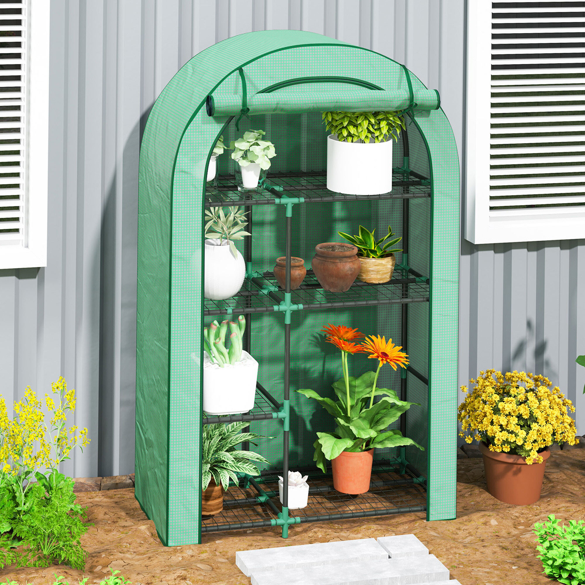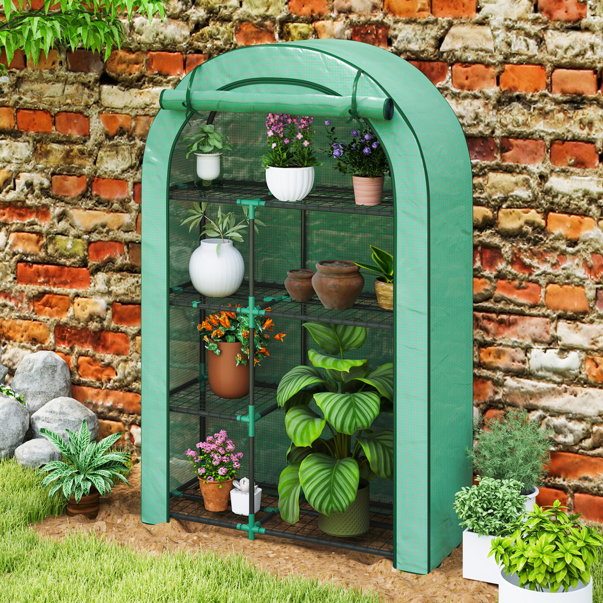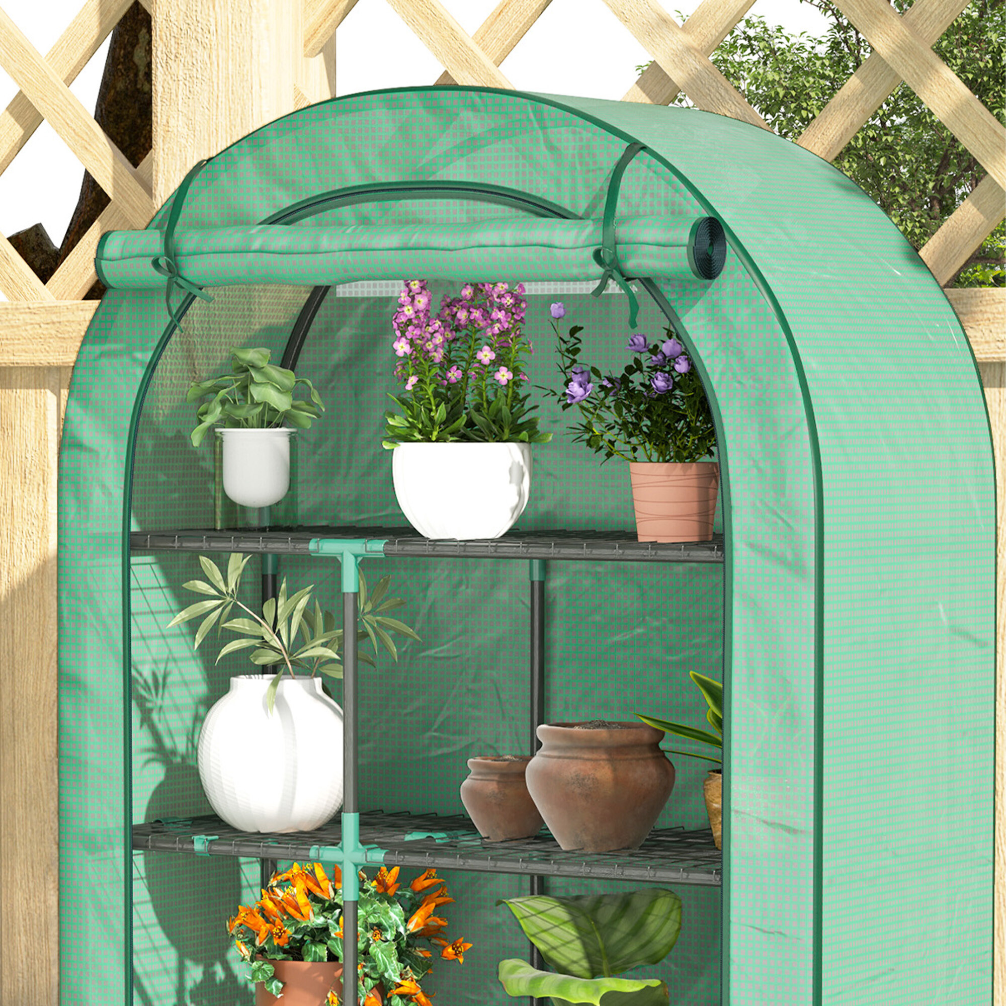 A fóliasátor négy polccal van felszerelve, feltekerhető ajtóval és könnyű szerkezettel rendelkezik, így könnyen áthelyezheti igényei szerint.