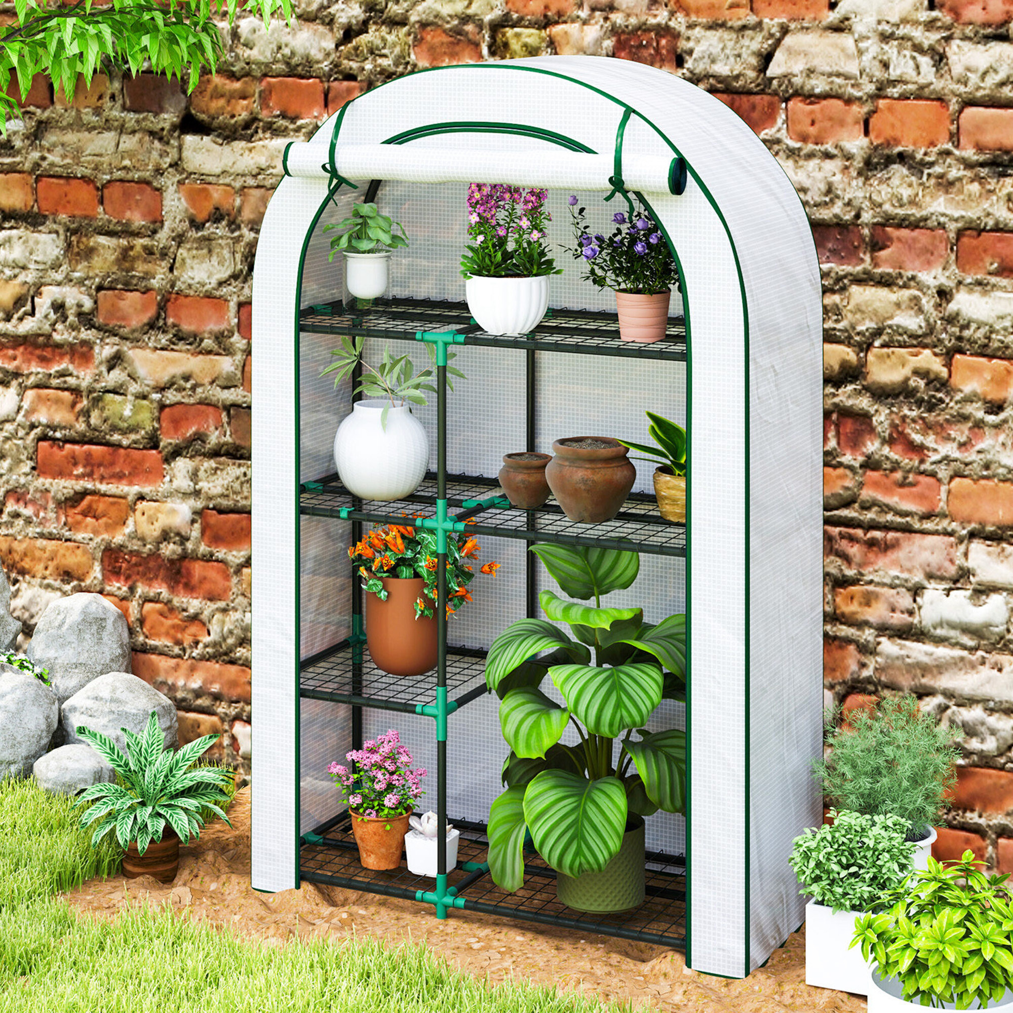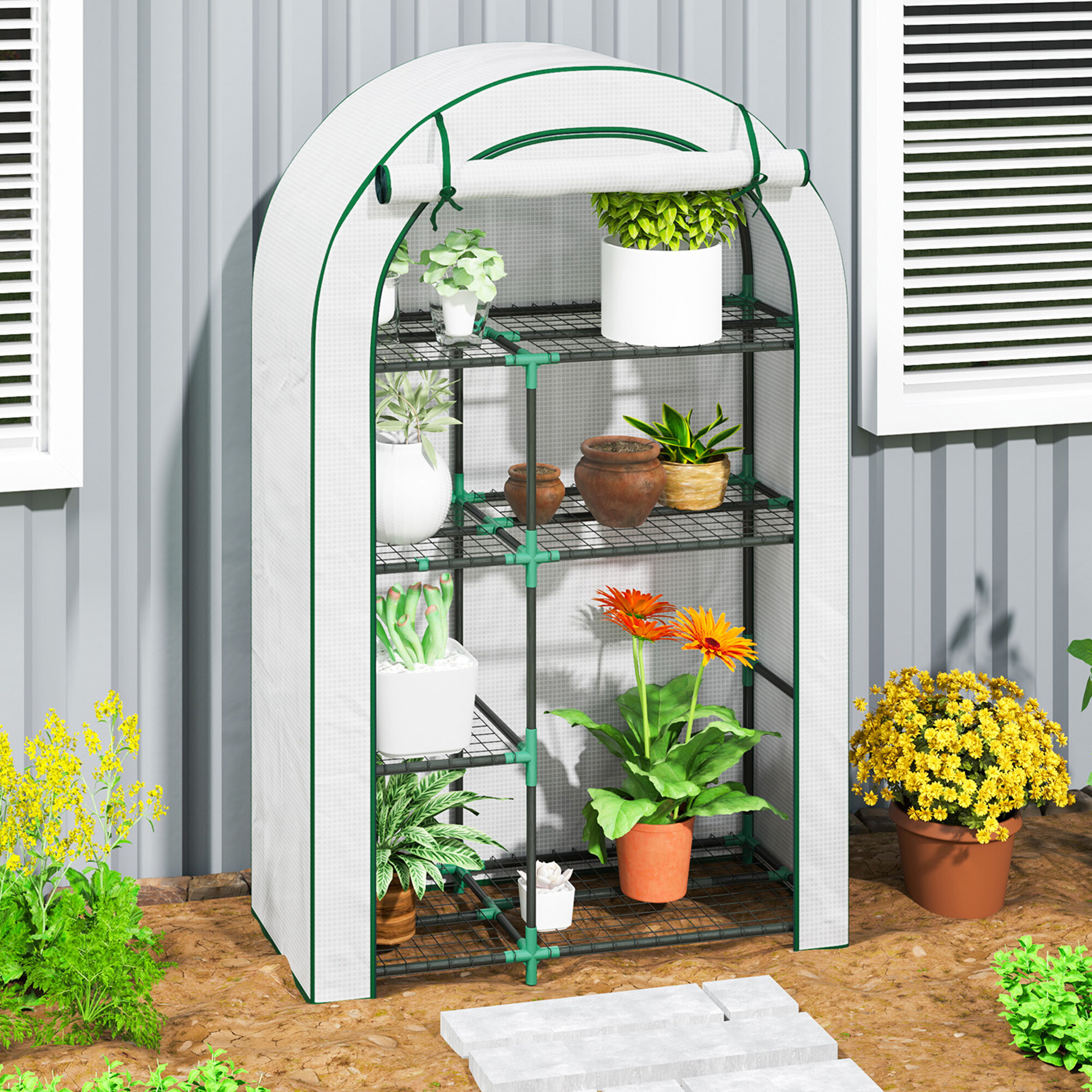 A fóliasátor négy polccal van felszerelve, és gurulós ajtóval is rendelkezik.