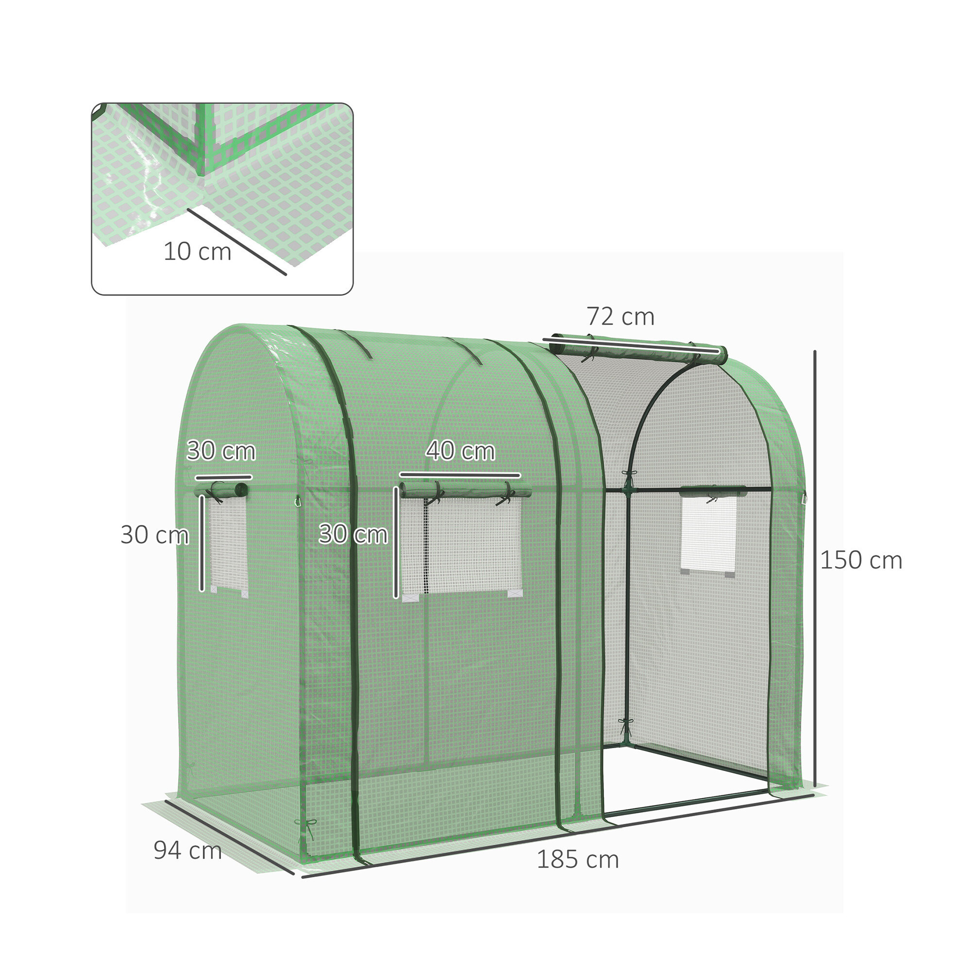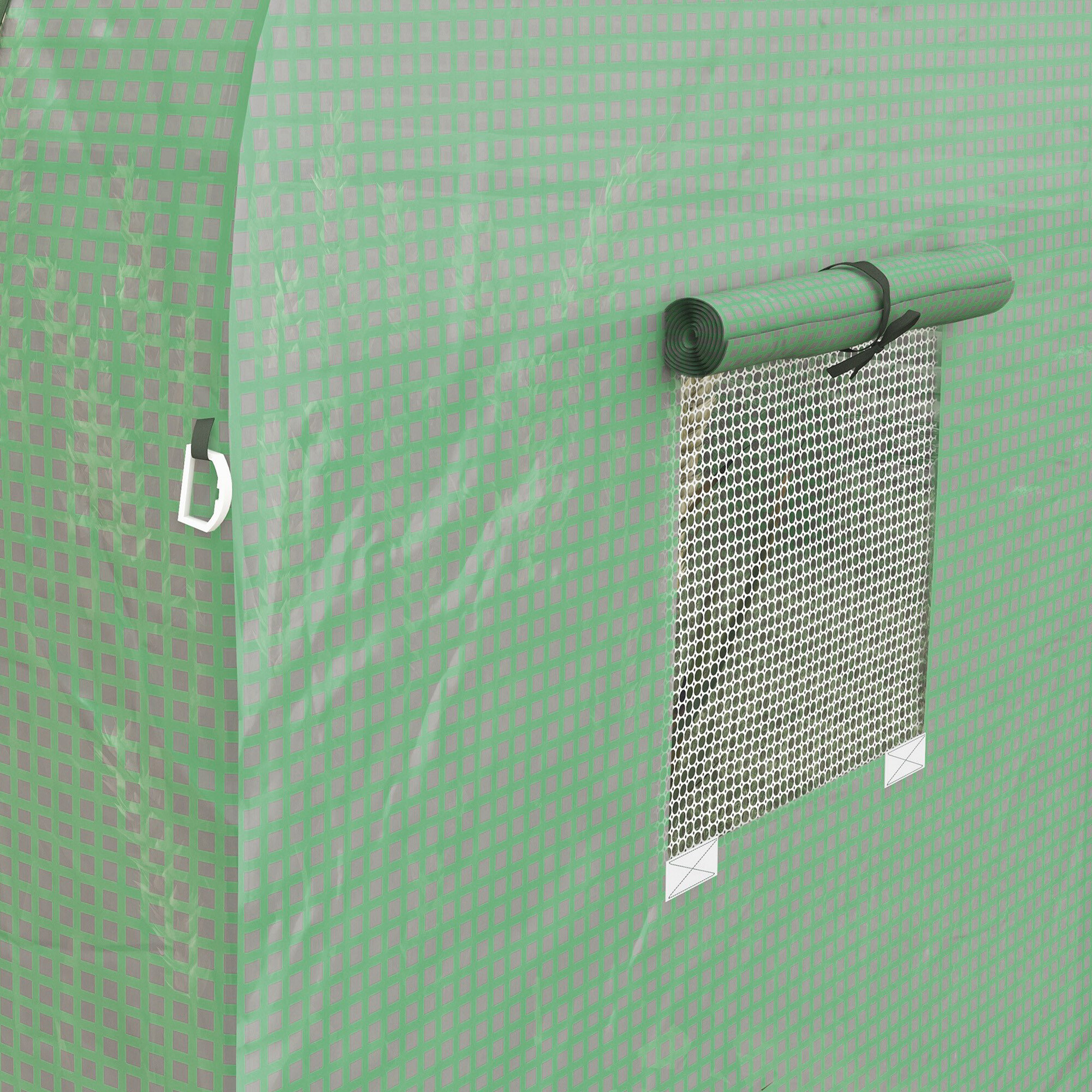 Az átlátszó PE fóliaréteg figyelemre méltó hőszabályozási tulajdonságokat és maximális fényáteresztést biztosít. A PP hálós zöld háló beágyazva a fólia szerkezetébe megerősíti és védi a szakadás és mechanikai sérülés ellen.