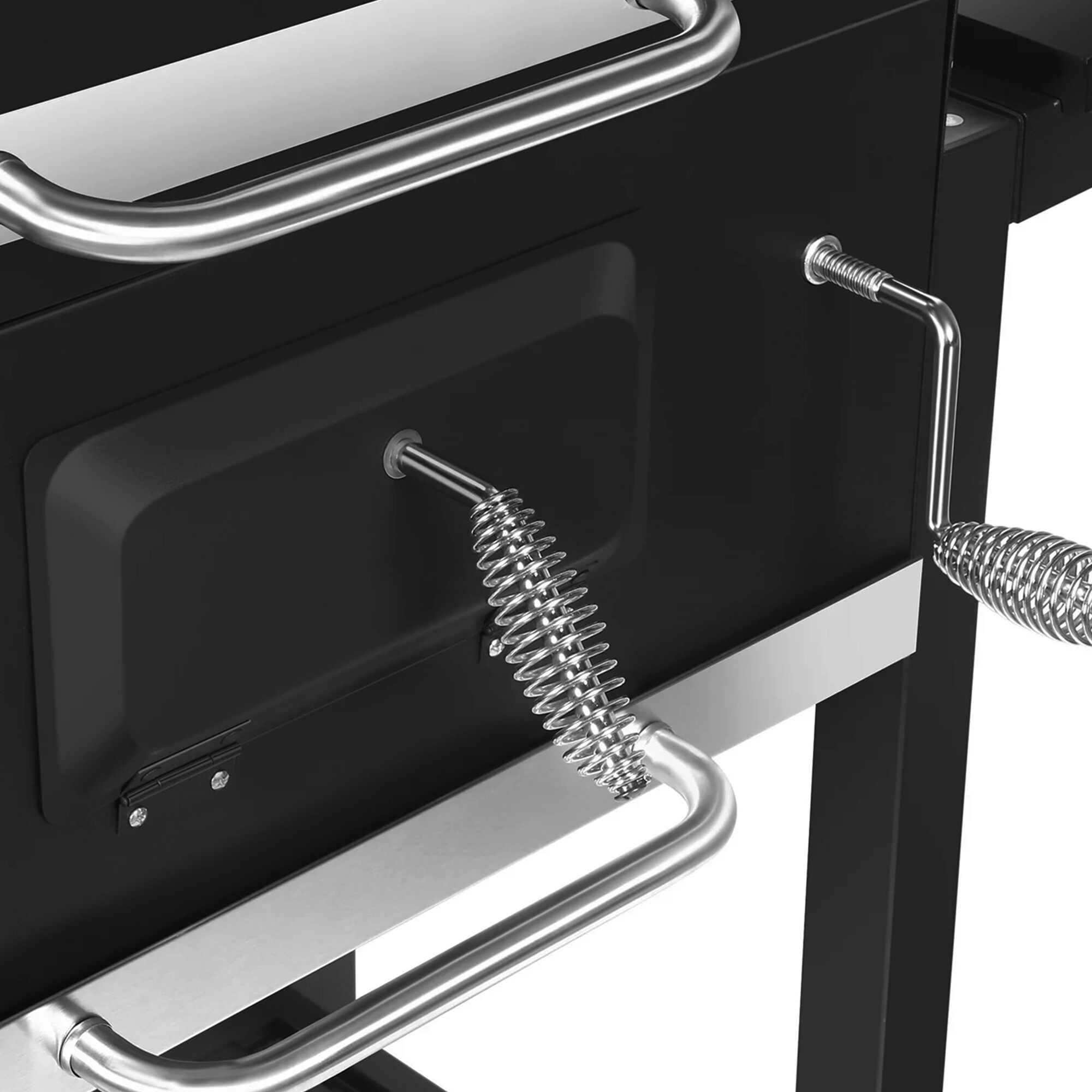 Különleges szellőzőnyílások biztosítják a kiegyensúlyozott légáramlást a grillezés során, és megakadályozzák a tűz kialvását. A tekerőgomb segítségével könnyedén beállíthatja a rostély magasságát, ami lehetővé teszi a hő intenzitásának pontos szabályozását.