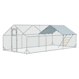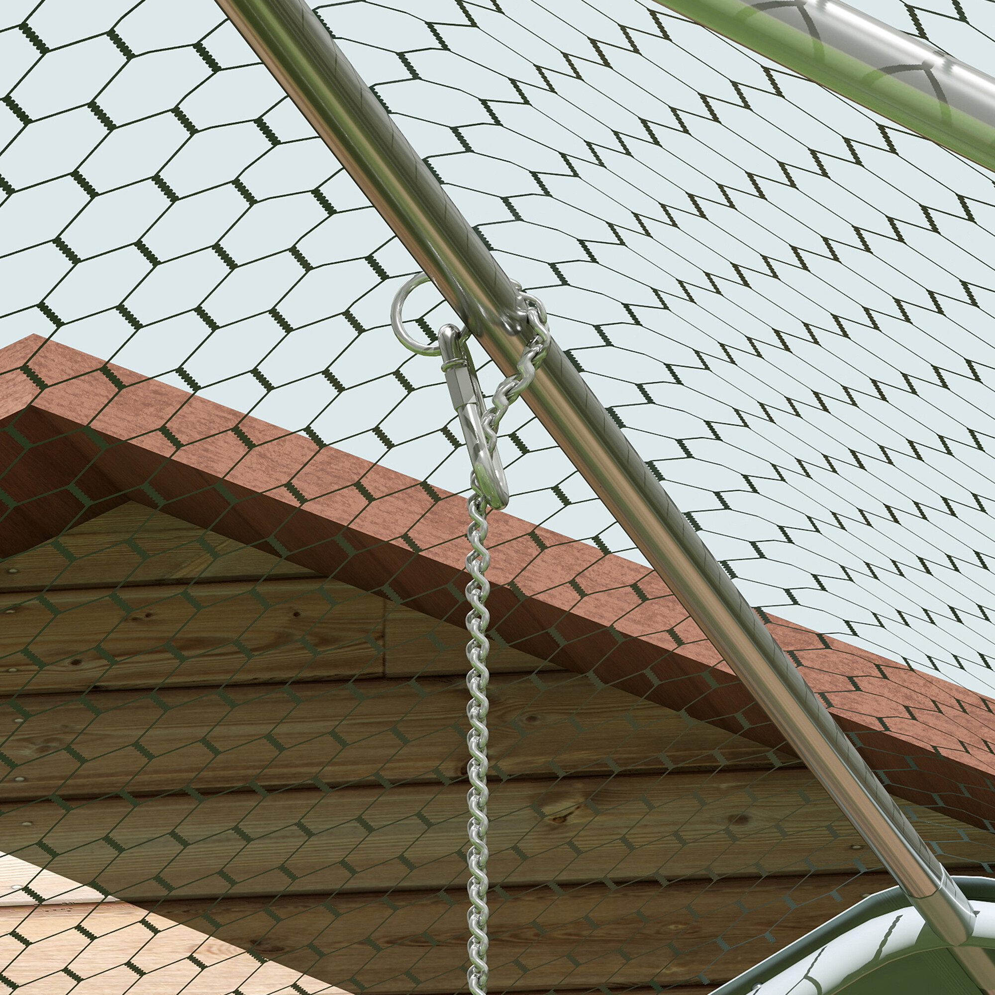 A ketrec erős ezüst horganyzott acélból készült, amely megfelelő stabilitást biztosít a kifutónak, és megakadályozza a nem kívánt baleseteket, például a baromfi szökését. A szerkezetet kiegészíti egy zöld színű horganyzott háló és a tető, amelyet egy fehér PVC ponyva alkot.
