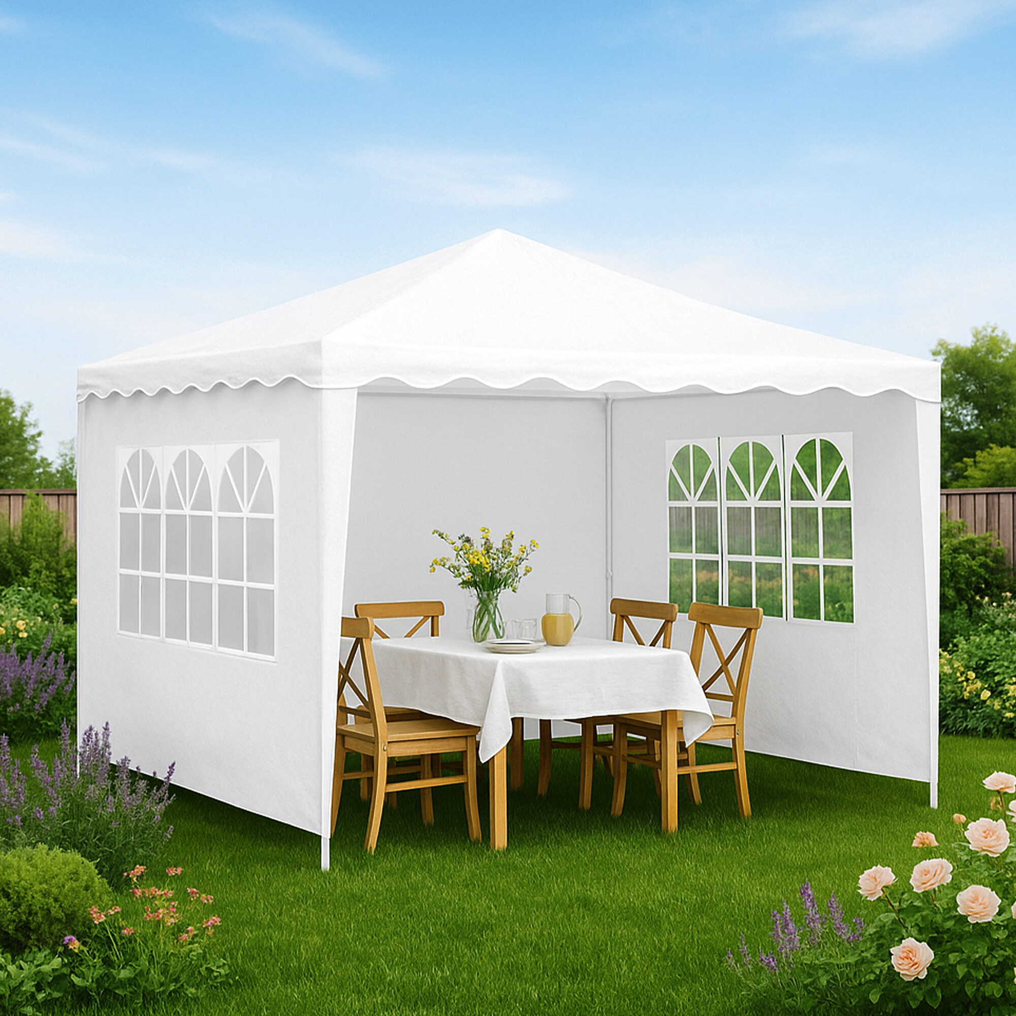 A pavilon összeszerelése nagyon egyszerű, és nem igényel speciális szerszámokat. A gondosan megtervezett szerkezetnek és a mellékelt útmutatónak köszönhetően a pavilont néhány perc alatt fel tudja állítani. Ugyanilyen könnyen szétszerelheti és tárolhatja is, ha éppen nincs rá szüksége.