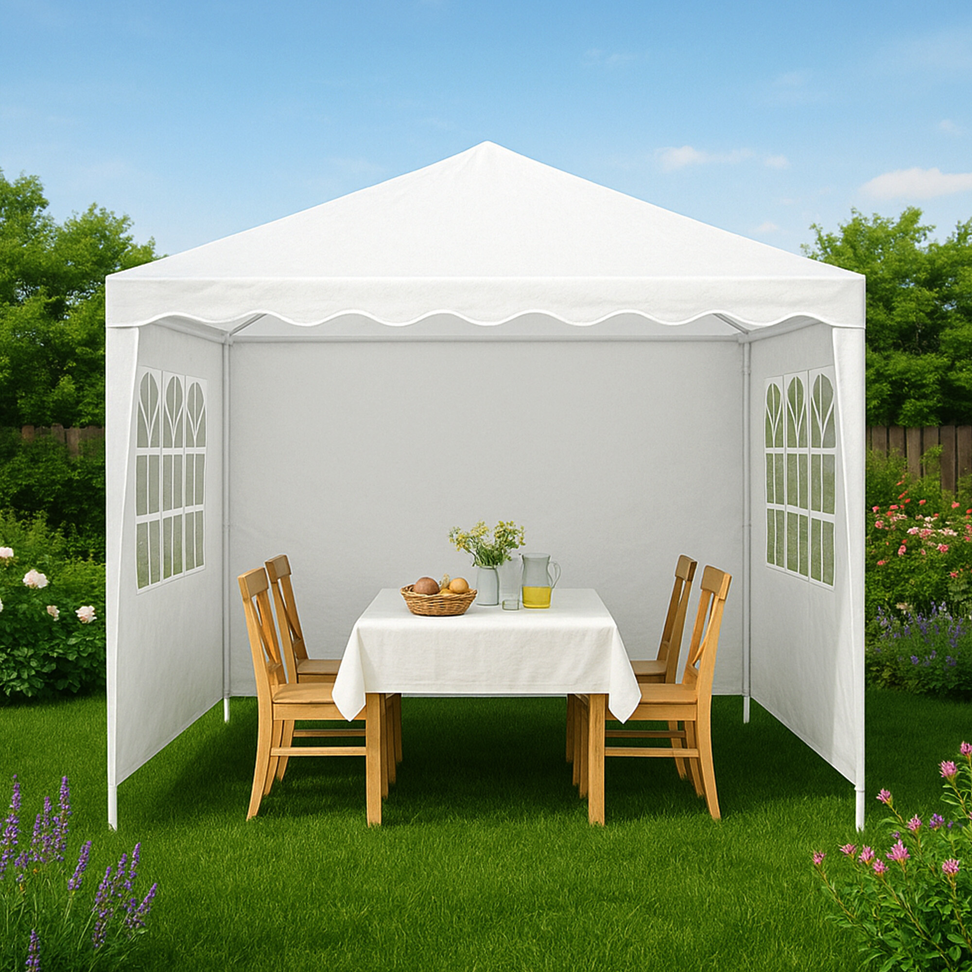 Az acélcsöveket korrózióvédelemmel is ellátták, így nem kell aggódnia a nedvesség vagy az eső okozta károk miatt.A pavilon borítása kiváló minőségű, 140 g/m2 súlyú polietilénből készült, amely nemcsak vízálló, hanem UV-védelemmel is rendelkezik.