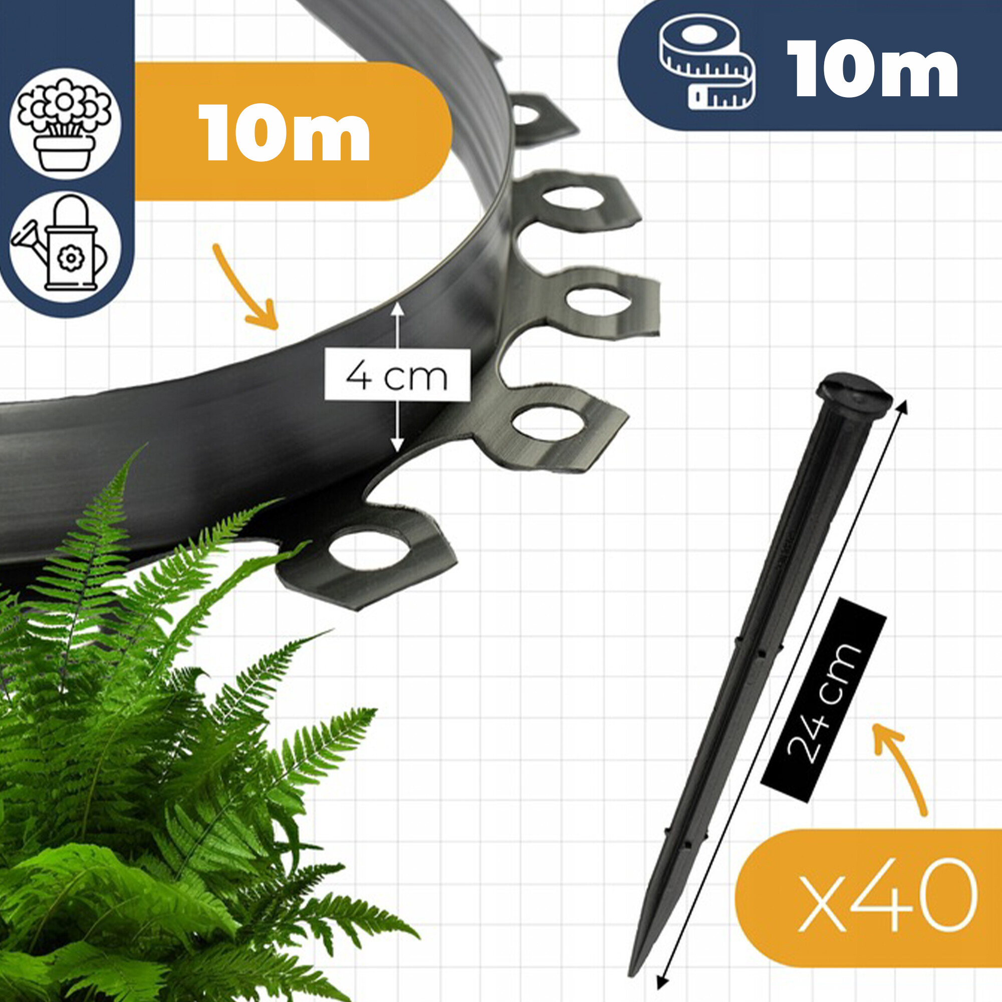 A kerti műanyag szegély UV-sugárzásnak, fagynak és nedvességnek ellenálló, ami biztosítja a hosszú élettartamot egész éves használat esetén is. A csomagban talál 1 tekercs 10 méteres szalagot, valamint 20 darab 24 cm hosszú horgonyt, amelyek biztosítják a szegély szilárd rögzítését a talajban.