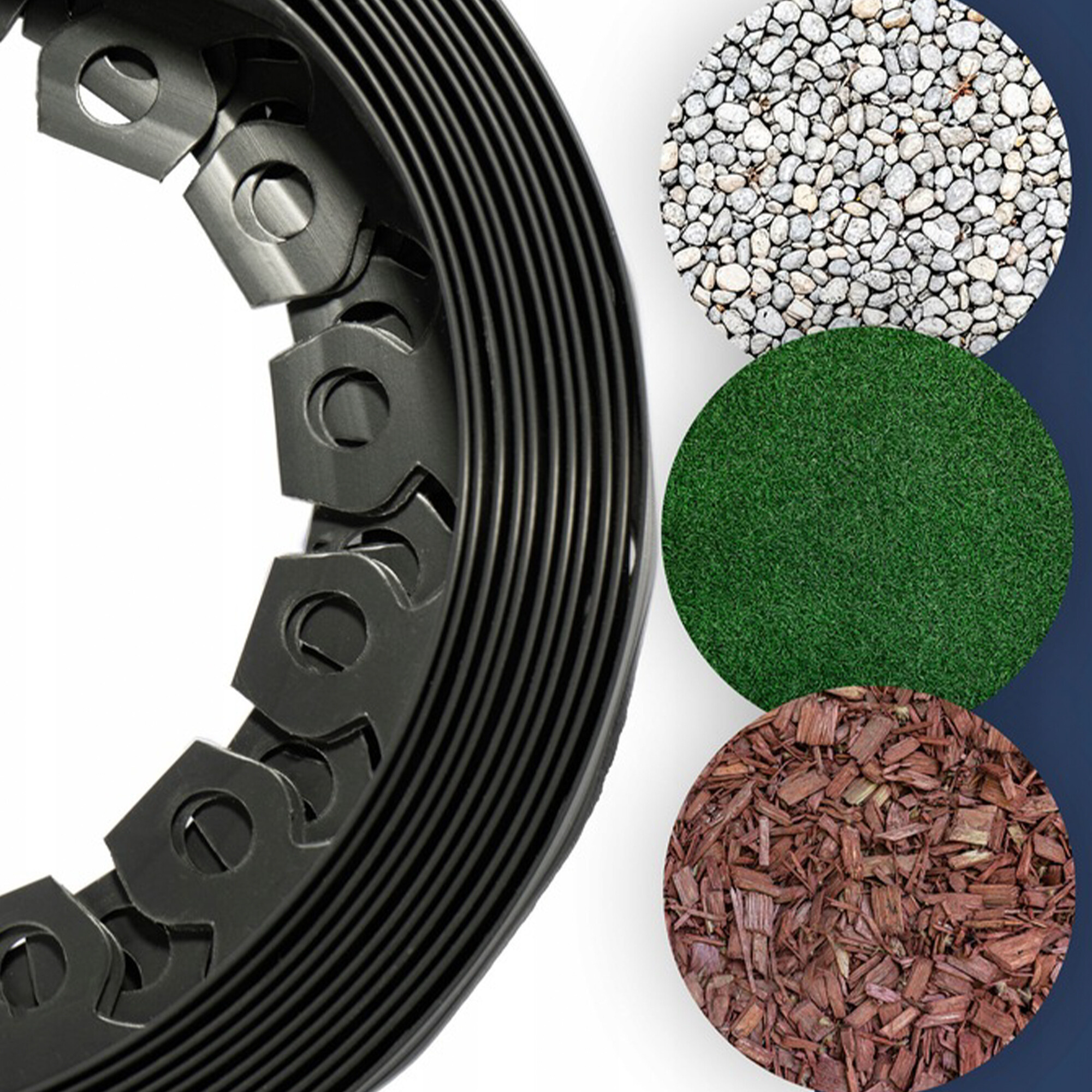 A 10 méteres műanyag kerti szegély megbízható megoldást jelent a gyep, virágágyások, járdák és a kert egyéb részeinek elválasztására. A gyepszegély rugalmas műanyagból készül, amely lehetővé teszi egyenes vonalak és ívek kialakítását, így problémamentesen alkalmazkodik bármilyen terephez.