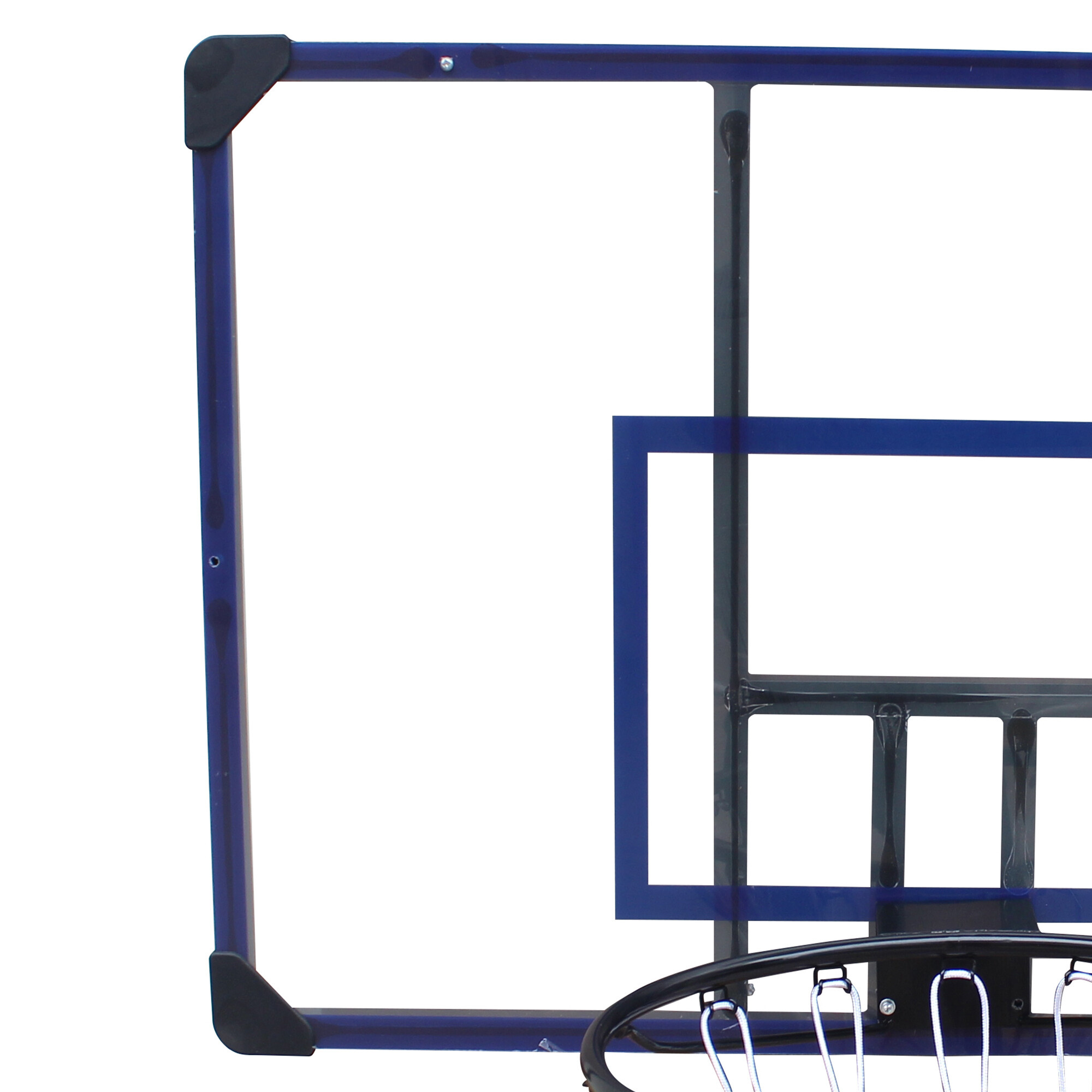 A kék vonalakkal ellátott visszapattanó táblára egy 45 cm átmérőjű, porszórt festékkel bevont acélgyűrűvel és időjárásálló hálóval ellátott kosárlabda kosár van rögzítve.