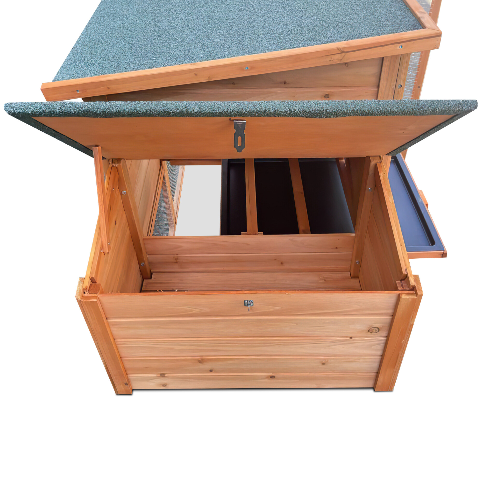 Nincs többé bonyolult hajlítás és nyújtás, egyszerűen emelje fel a tetőt, és a tojások kéznél vannak.A tyúkól oldalsó fészkelő dobozzal van felszerelve, amely nyugodt és biztonságos helyet biztosít a tyúkoknak a tojásrakáshoz.