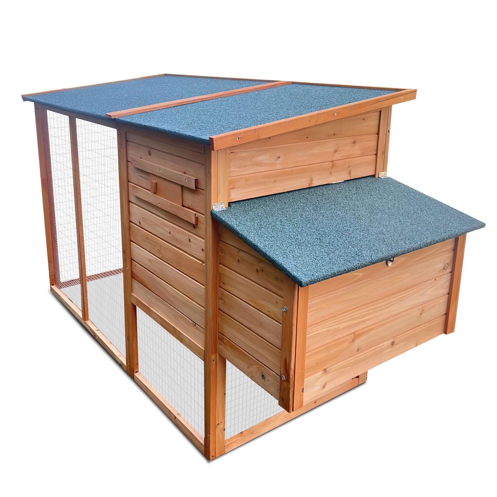 A tető kiváló minőségű zsindelyfedéssel van ellátva, amely megvédi a tyúkokat az esőtől és a hótól. Az alsó emeletről a felső emeletre egy rámpa vezet, amelyen az állatok könnyen felmászhatnak. Az ajtó könnyen becsukható és tolóreteszekkel rögzíthető.A tyúkól egyik fő előnye a lehajtható tető, amely megkönnyíti a tojásokhoz való hozzáférést.