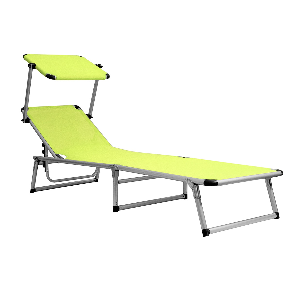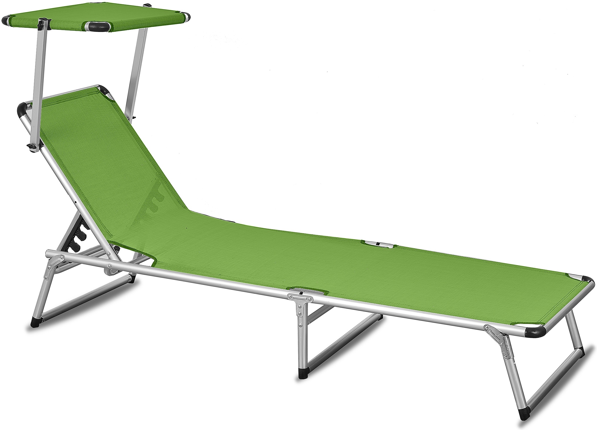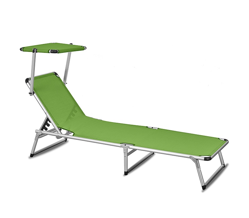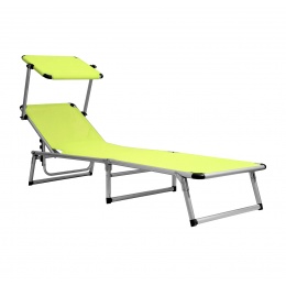Összecsukható kerti napozószék előtetővel és megerősített alumínium szerkezettel, modern kivitelben, alkalmas kertekbe, kempingekbe vagy strandok.