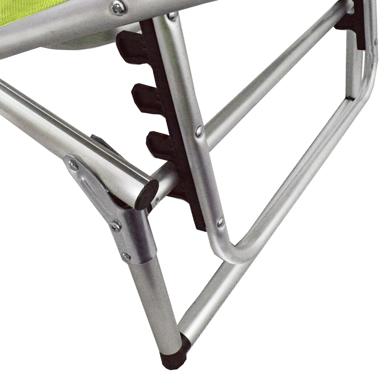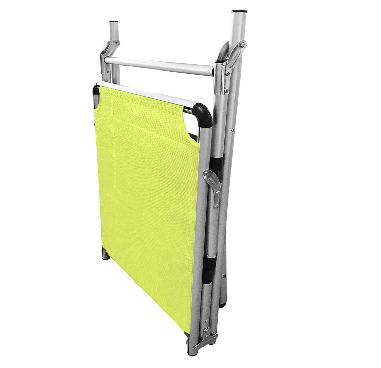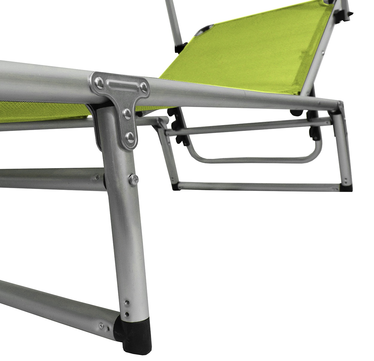 Összecsukható kerti napozószék előtetővel és megerősített alumínium szerkezettel, modern kivitelben, alkalmas kertekbe, kempingekbe vagy strandok.