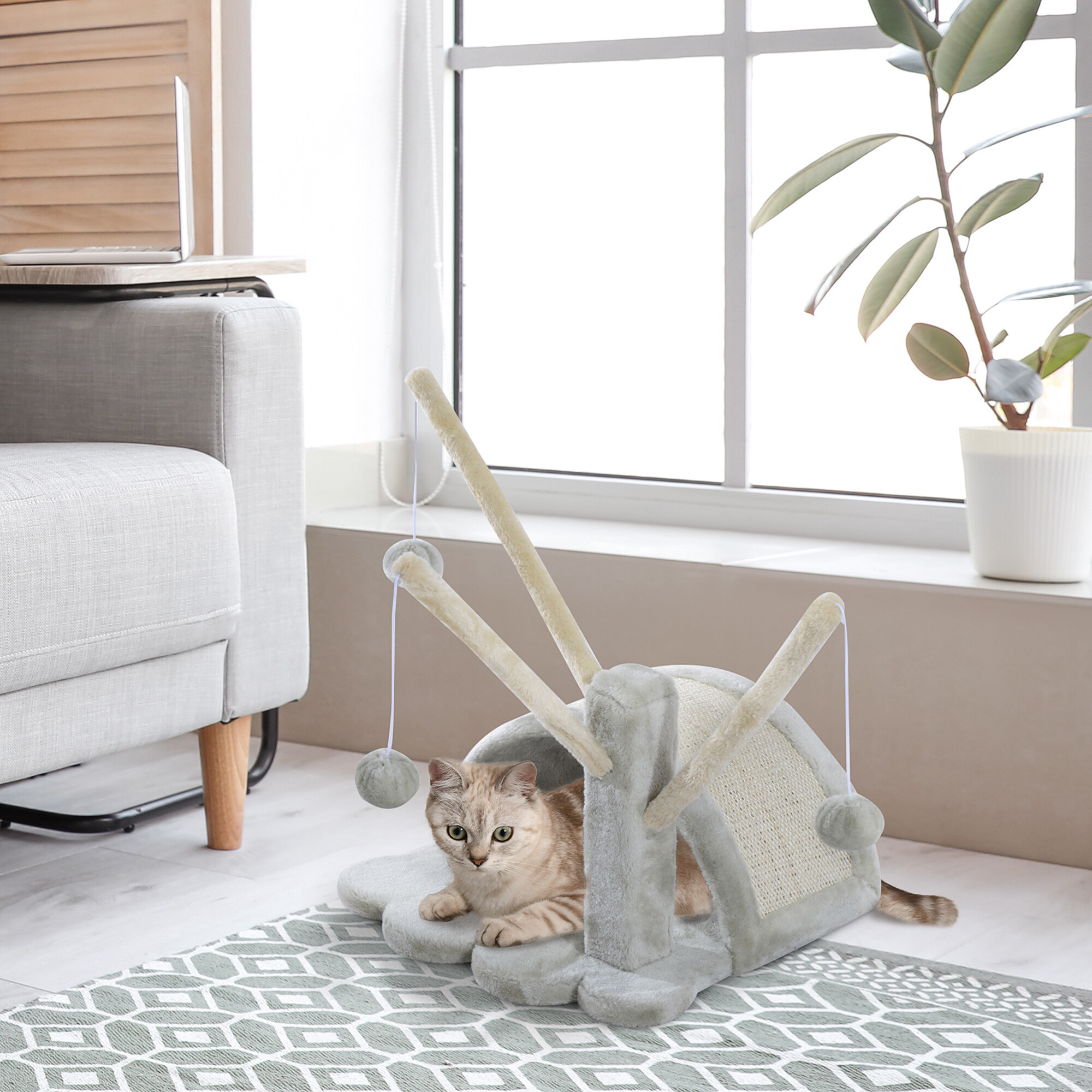 A minőségi és erős szizállal körbetekert kaparóhíd bármikor lehetőséget nyújt neki a karmok élesítésére anélkül, hogy kockáztatná, hogy pontosan ott teszi, ahol nem szeretné. Ugyanakkor a puha plüssnek köszönhetően ez lesz a kedvenc helye a pihenésre és a játékra.