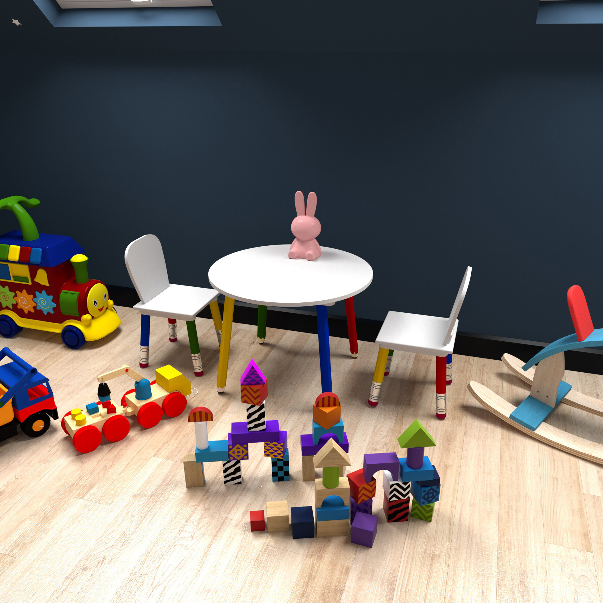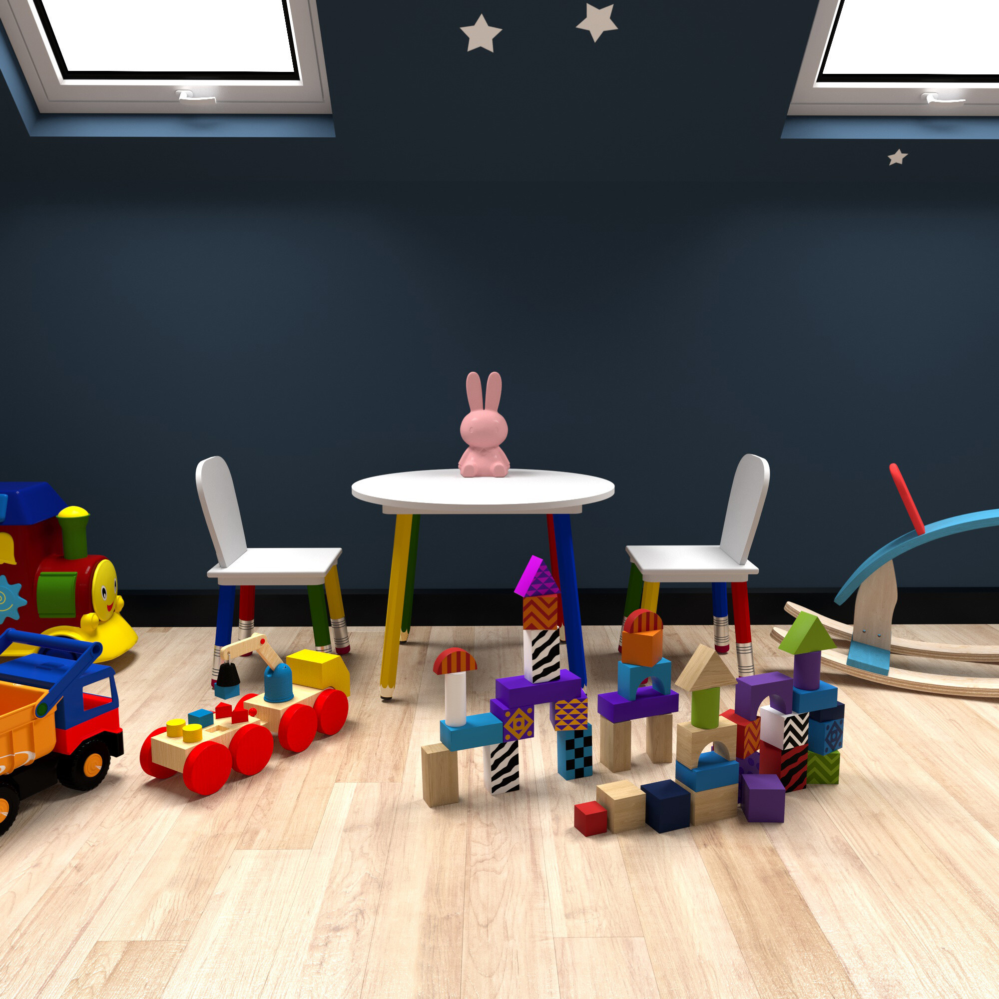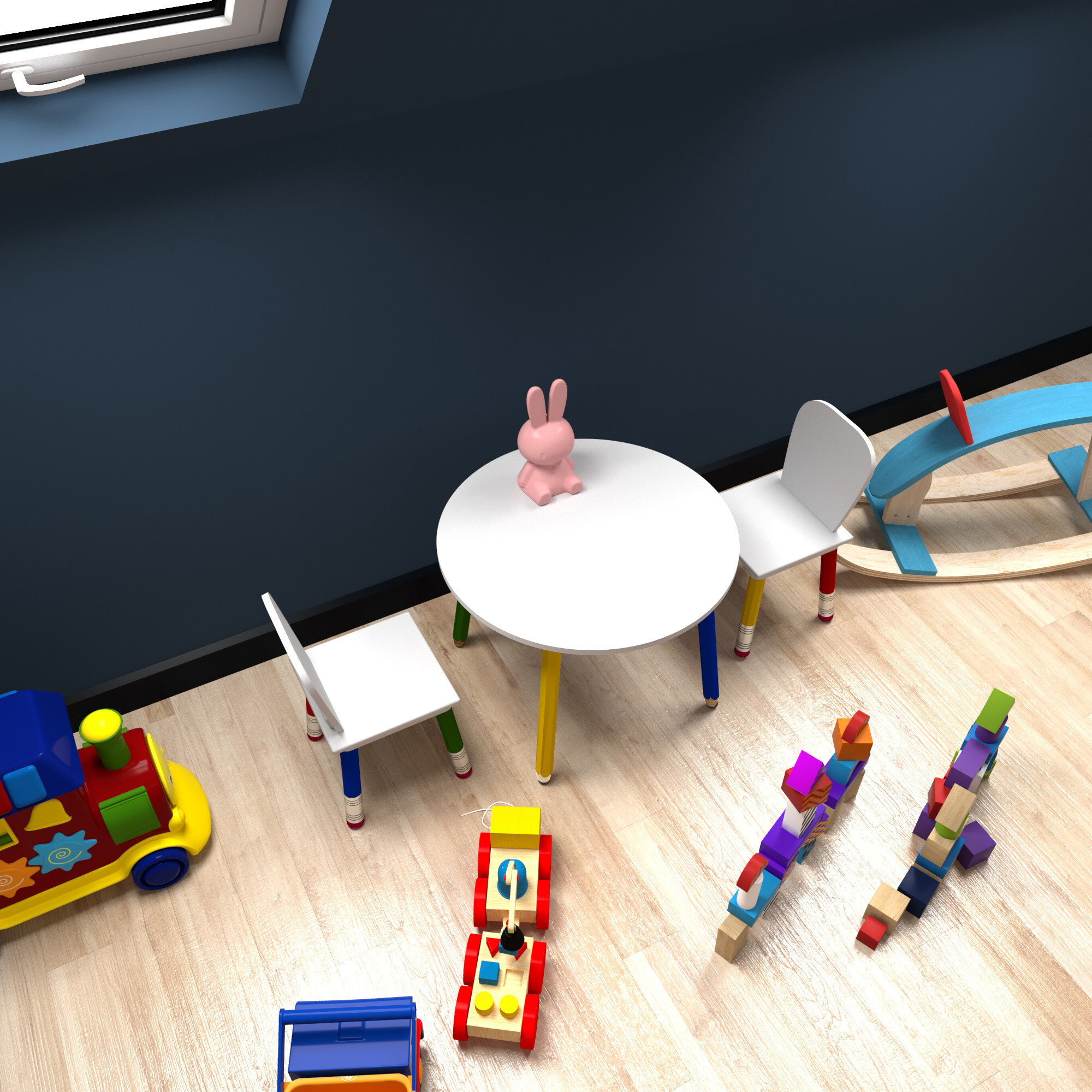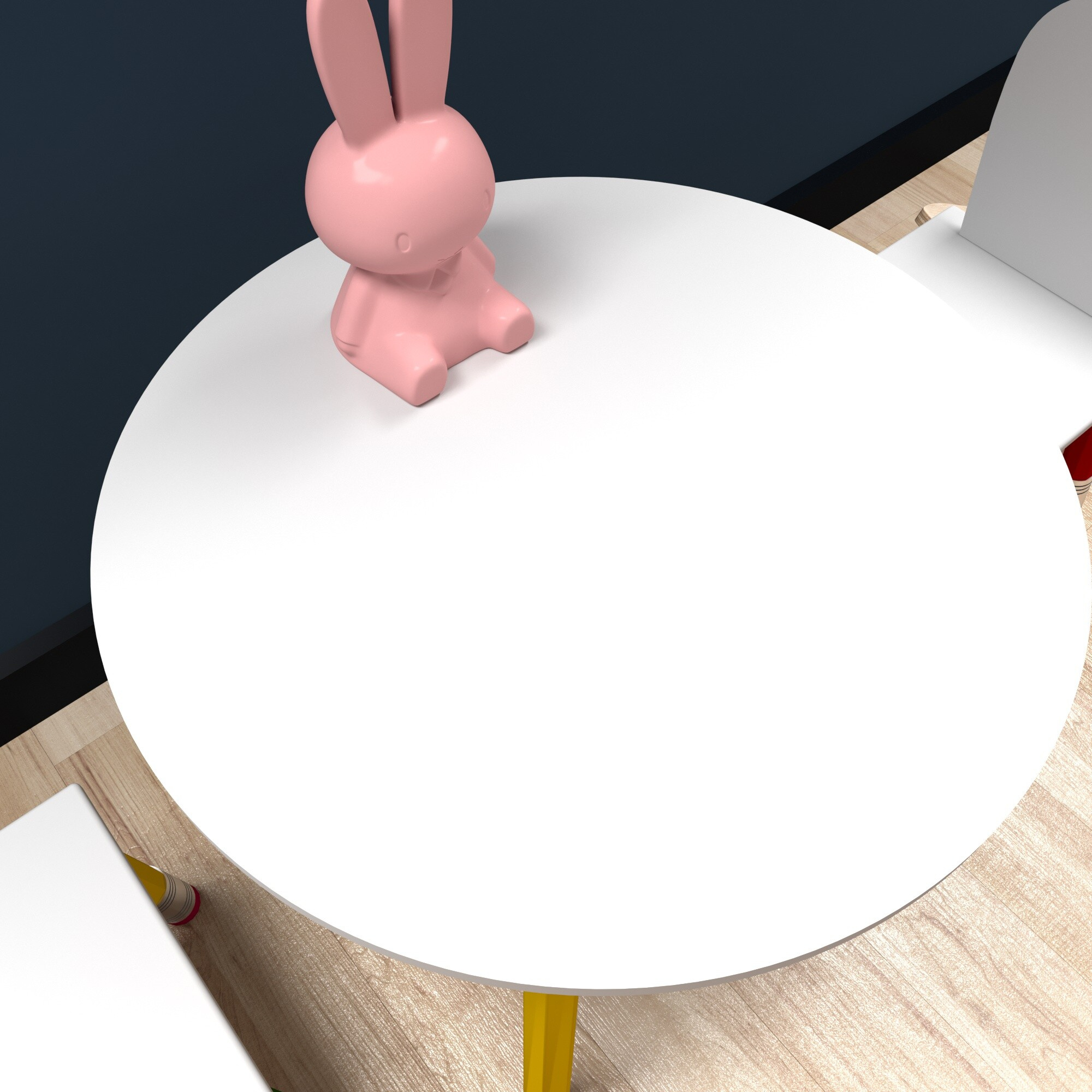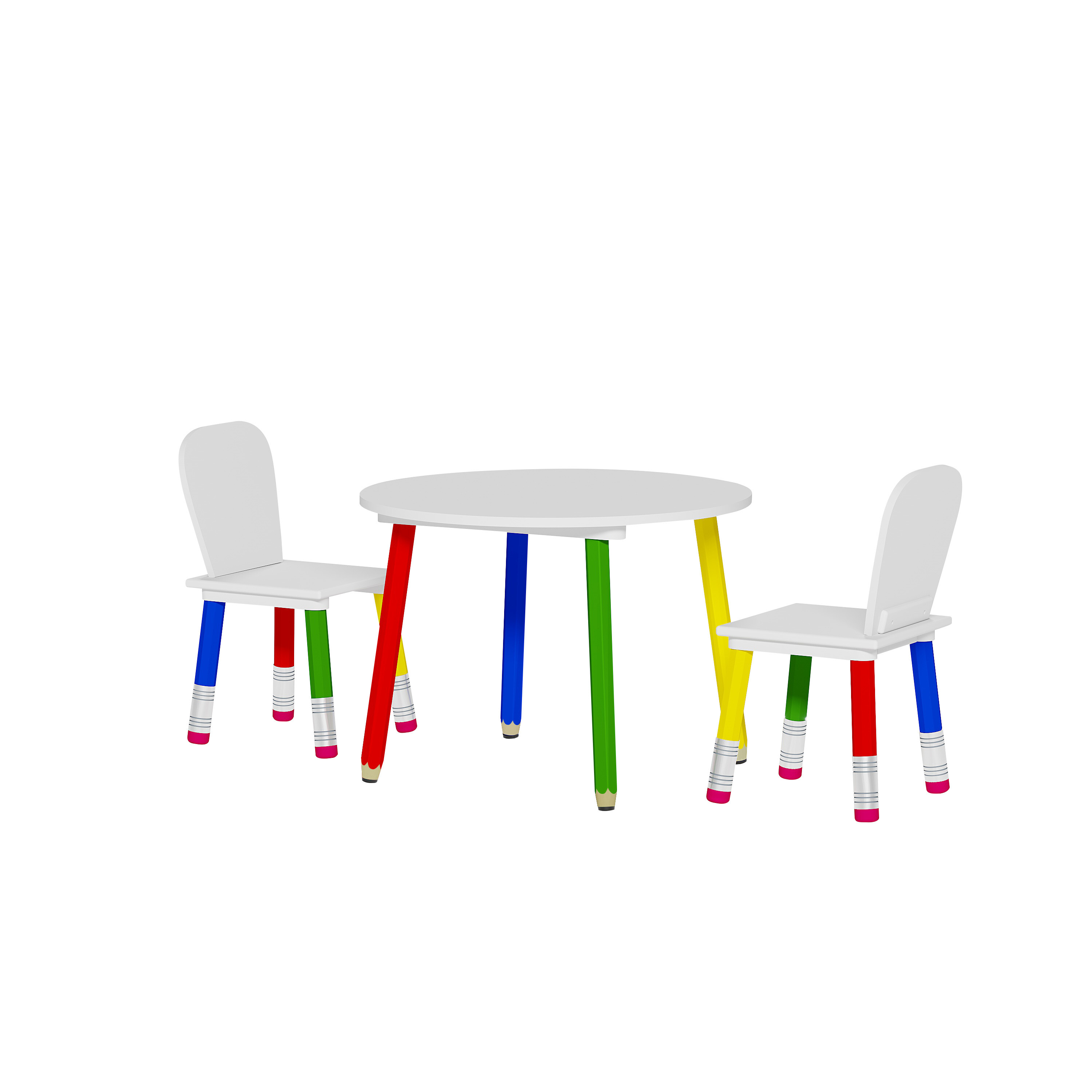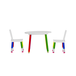 Szerezze be gyermekeinek ezt a színes gyerek étkező szettet asztallal és székekkel.A bútorok lábai gyerek zsírkrétákra emlékeztetnek.