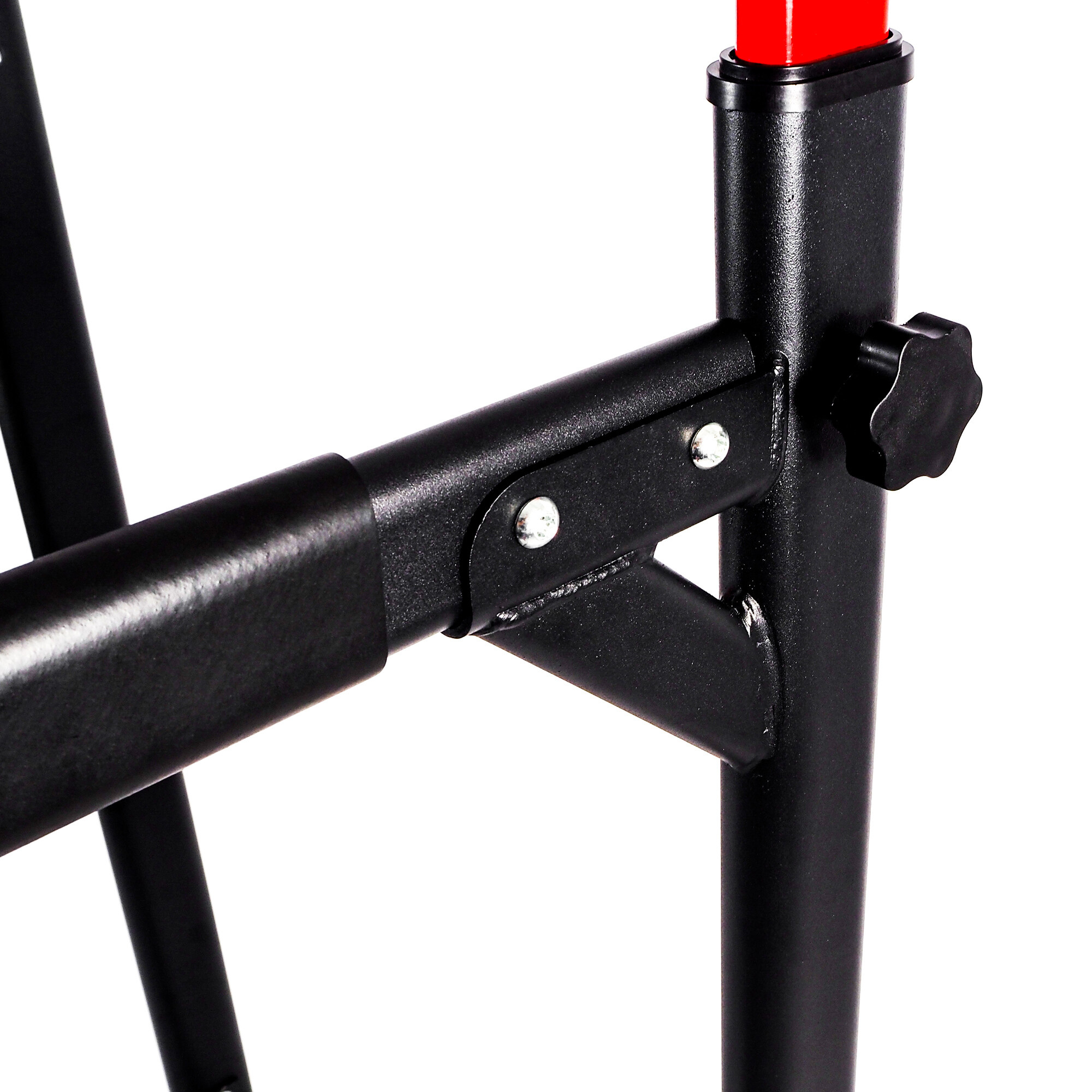 A multifunkcionális húzódzkodó rúd magasságát kényelmesen a saját magasságához vagy edzési preferenciáihoz igazíthatja 174-221 cm tartományban. A beállításokat gyorsan elvégezheti a készülék keretén található szabályozó csavarok segítségével.