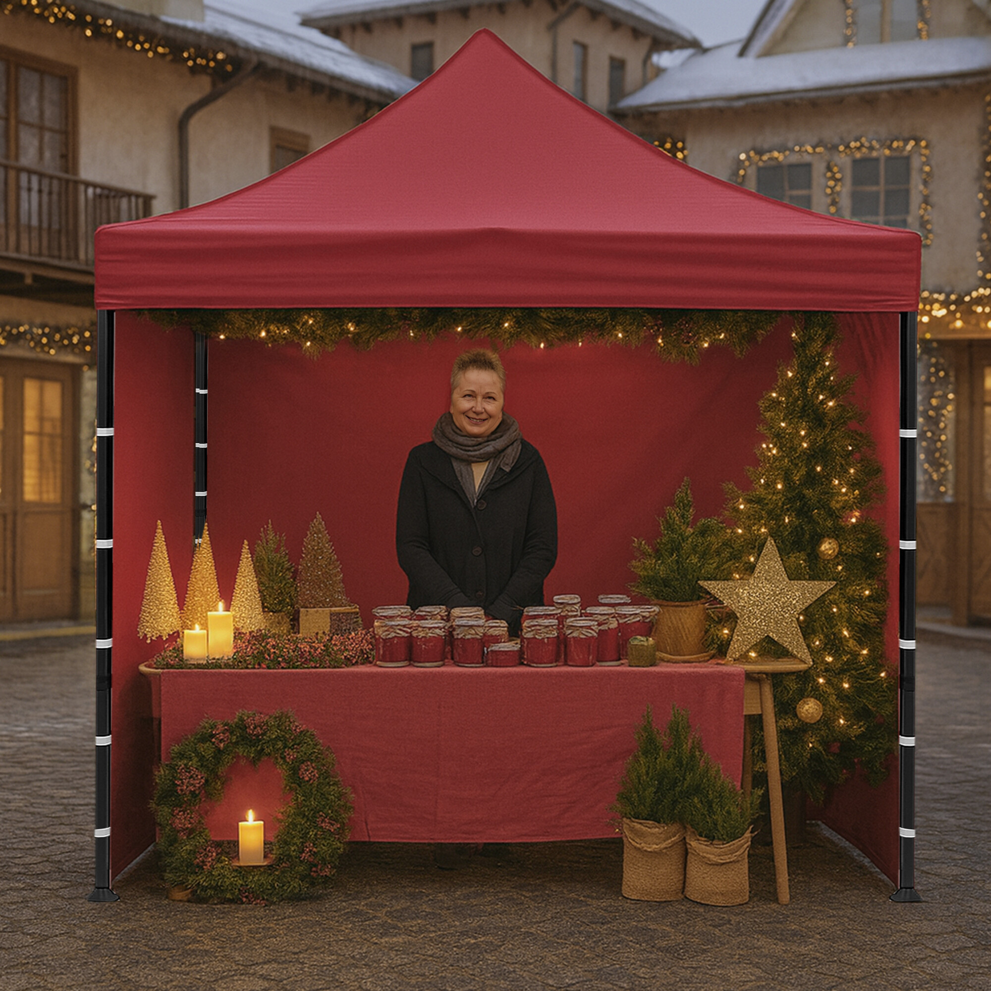A gyors összeszerelési és szétszerelési rendszer lehetővé teszi a stand 5–10 percen belüli előkészítését, szerszámok használata nélkül. Nemcsak kültéren, hanem beltéren is használhatja, mint például eladói stand, kiállítási stand, promóciós stand vagy party sátor.