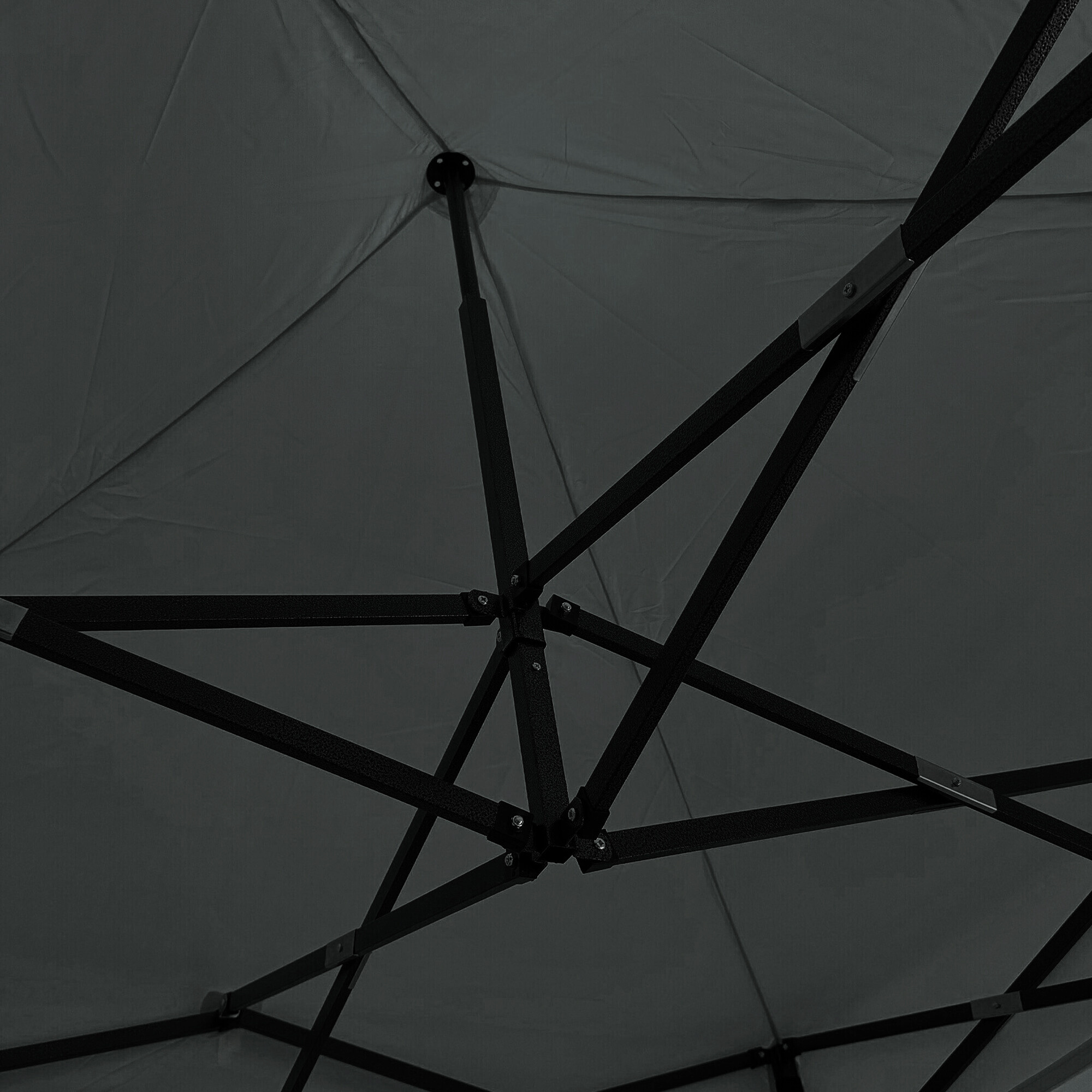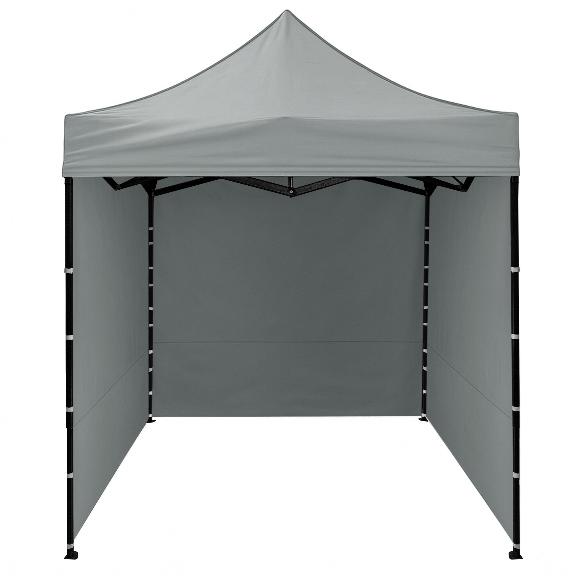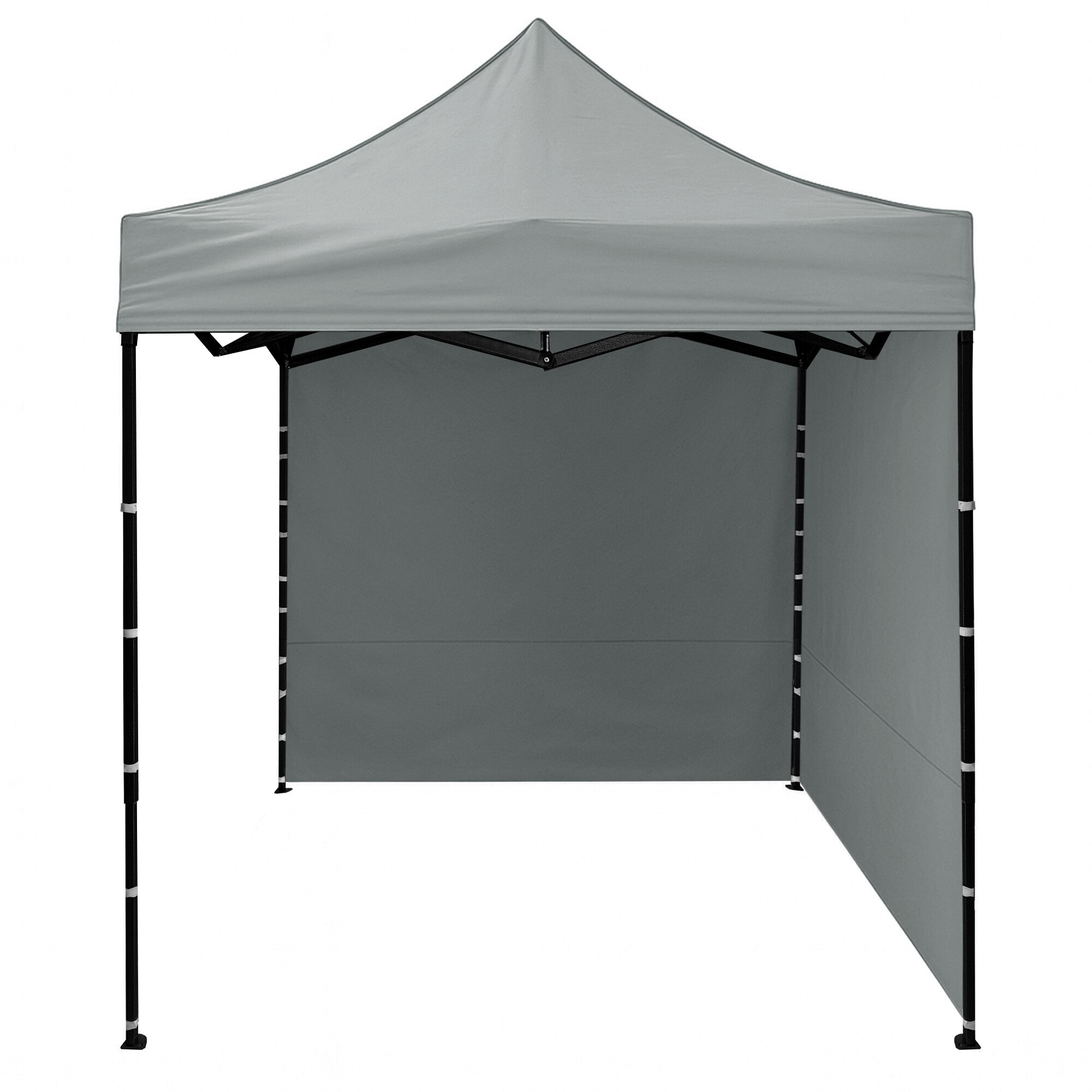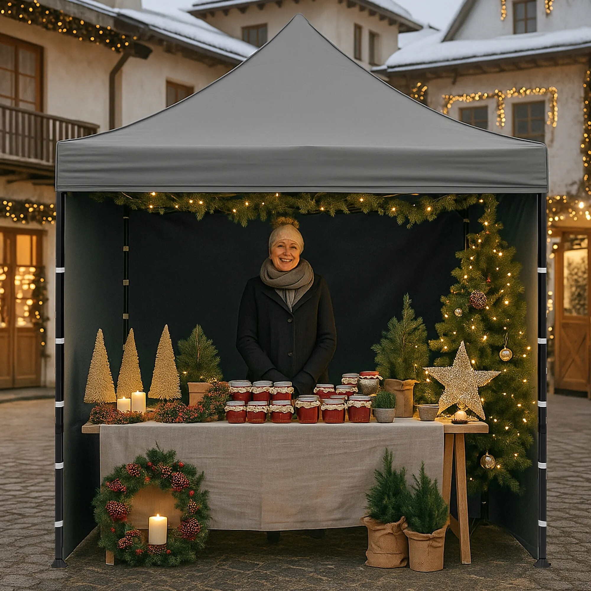 A tető 420D PU Oxfordból és az oldalfalak PVC Oxford 210D-ből készültek, amelyek védelmet nyújtanak a szél és az eső ellen, miközben reprezentatív hátteret biztosítanak az eladók és a vásárlók számára. A praktikus tépőzárnak köszönhetően az oldalfalak gyorsan eltávolíthatók vagy újra rögzíthetők.