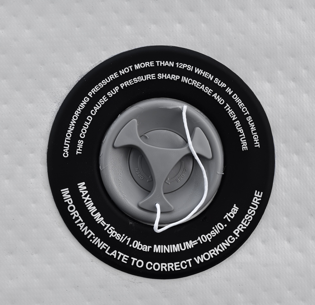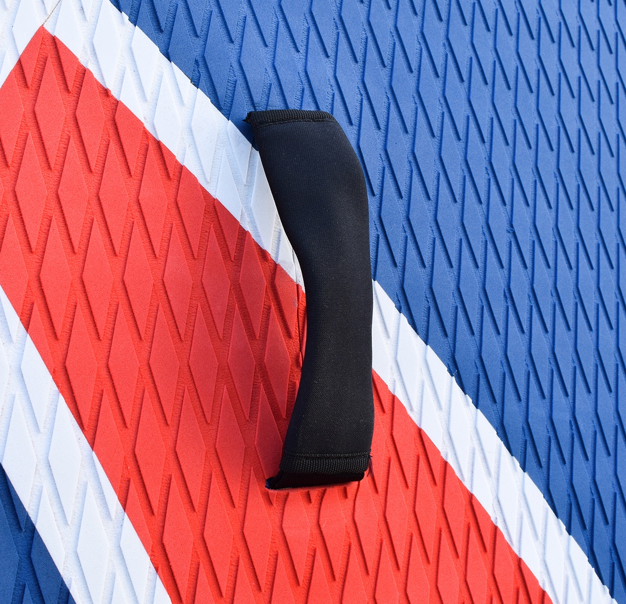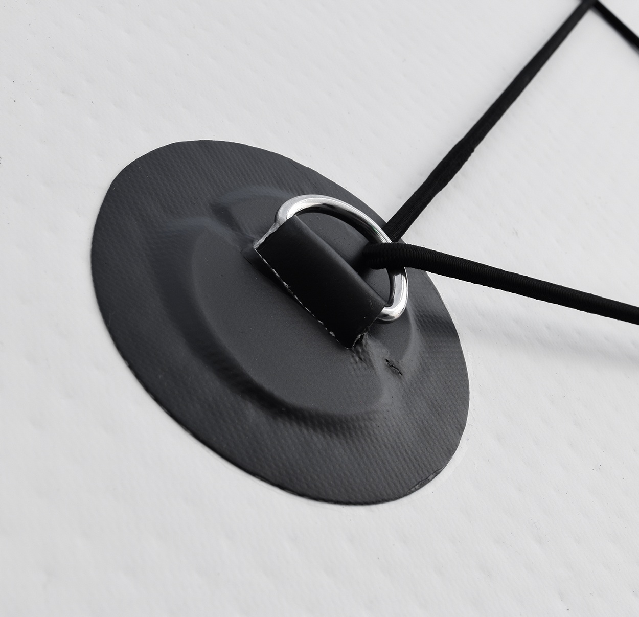 A deszka D-gyűrűs fogantyúkkal van felszerelve az orrnál és a tatnál a biztonsági zsinór rögzítéséhez.