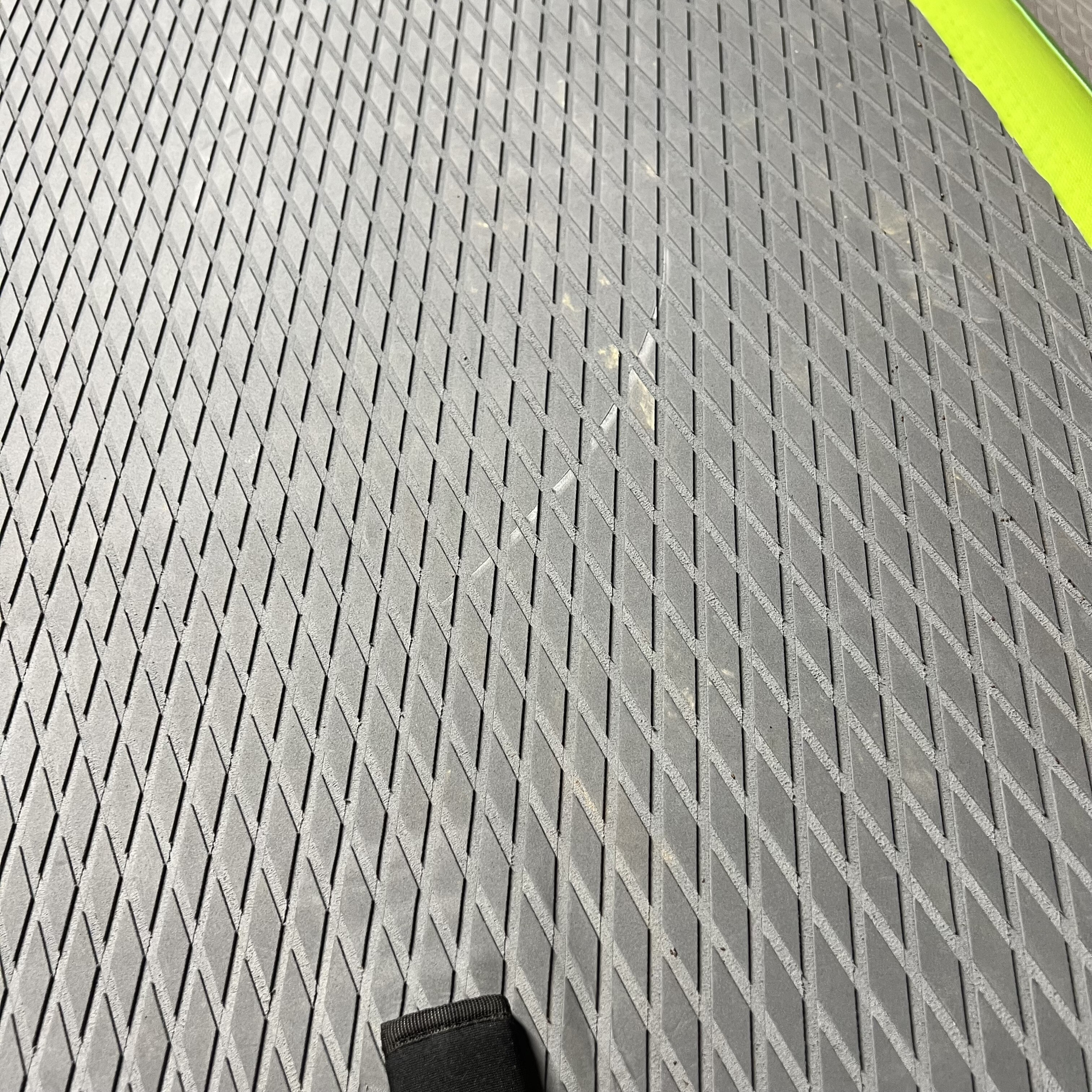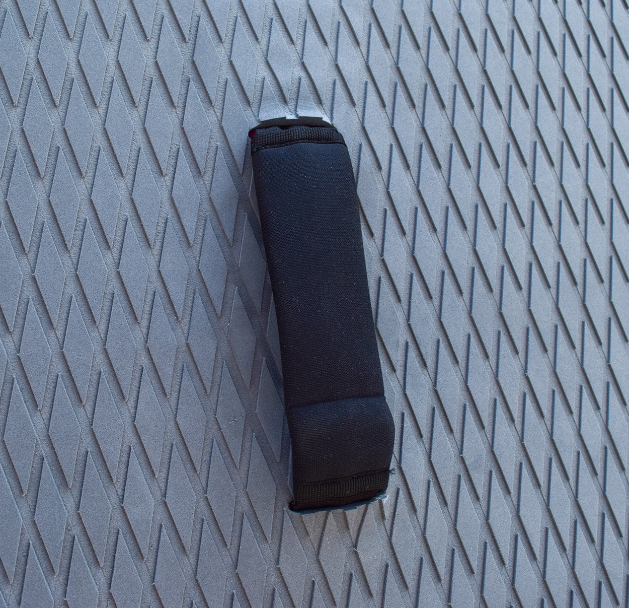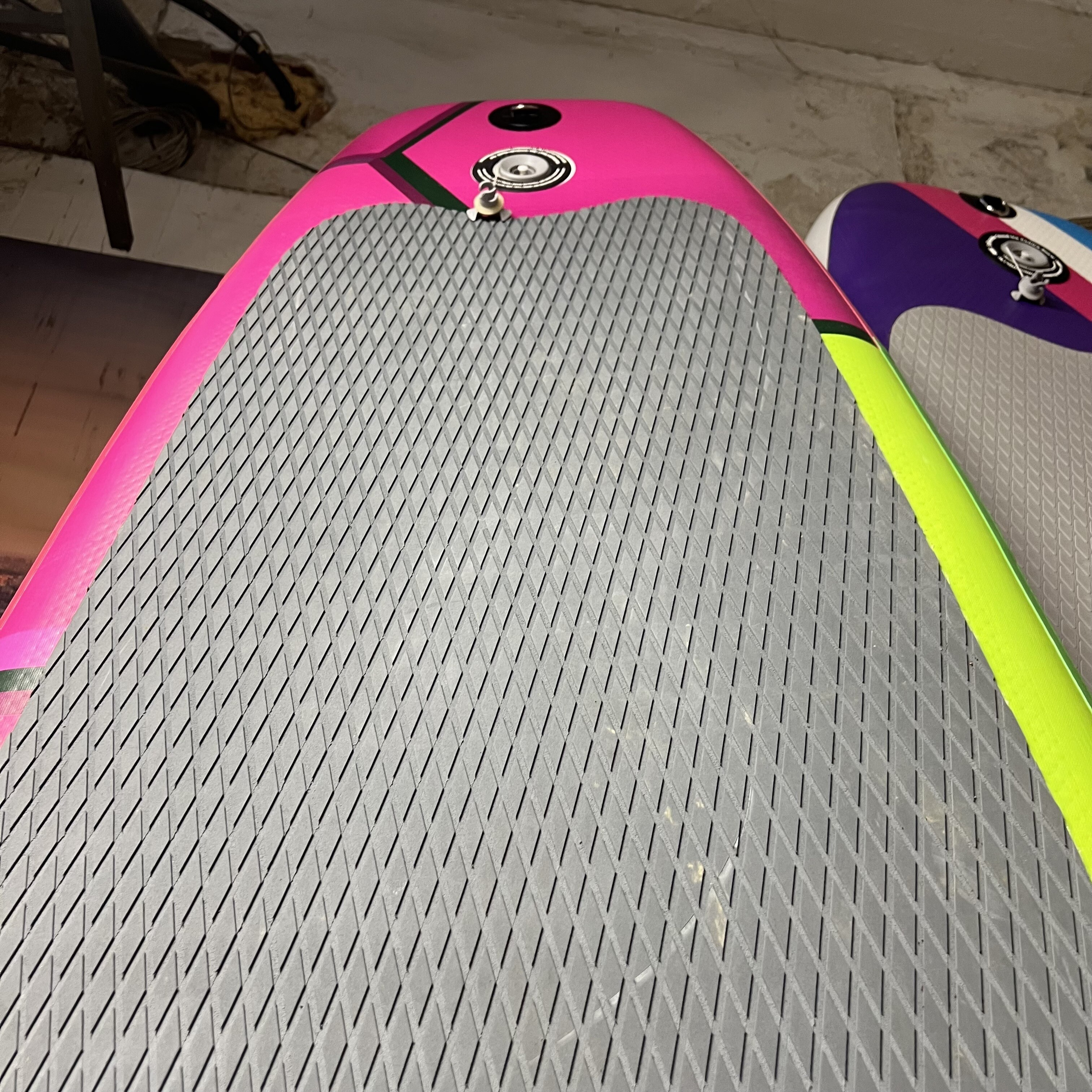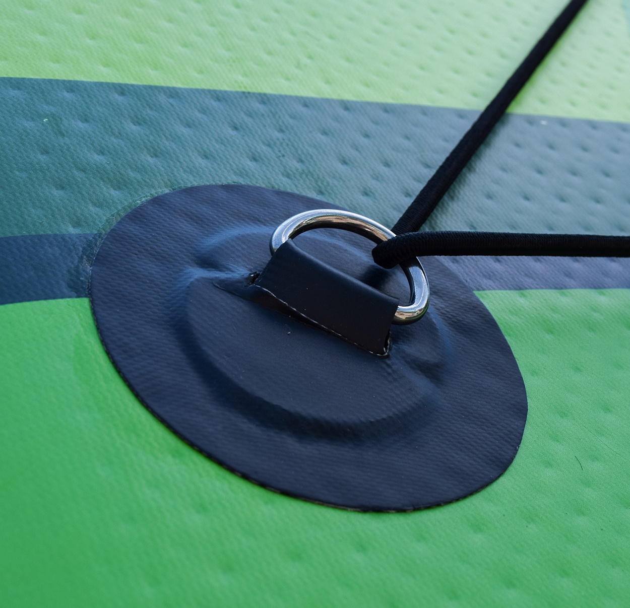 A deszka D-gyűrűs fogantyúkkal van felszerelve az orrnál és a tatnál a biztonsági zsinór rögzítéséhez.