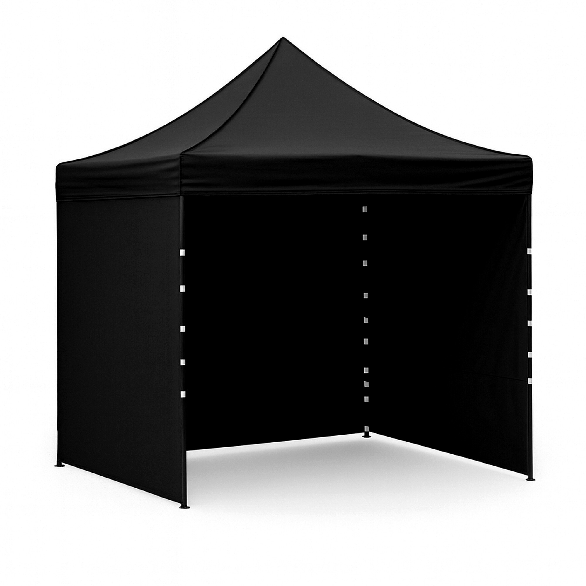 A tető 420D PU Oxfordból és az oldalfalak PVC Oxford 210D-ből készültek, amelyek védelmet nyújtanak a szél és az eső ellen, miközben reprezentatív hátteret biztosítanak az eladók és a vásárlók számára. A praktikus tépőzárnak köszönhetően az oldalfalak gyorsan eltávolíthatók vagy újra rögzíthetők.