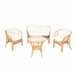 A kollekció 2 rattan fotelből, egy rattan padból és egy üveglapos rattan asztalból áll.Az asztal alján van egy terület kisebb tárgyak tárolására.