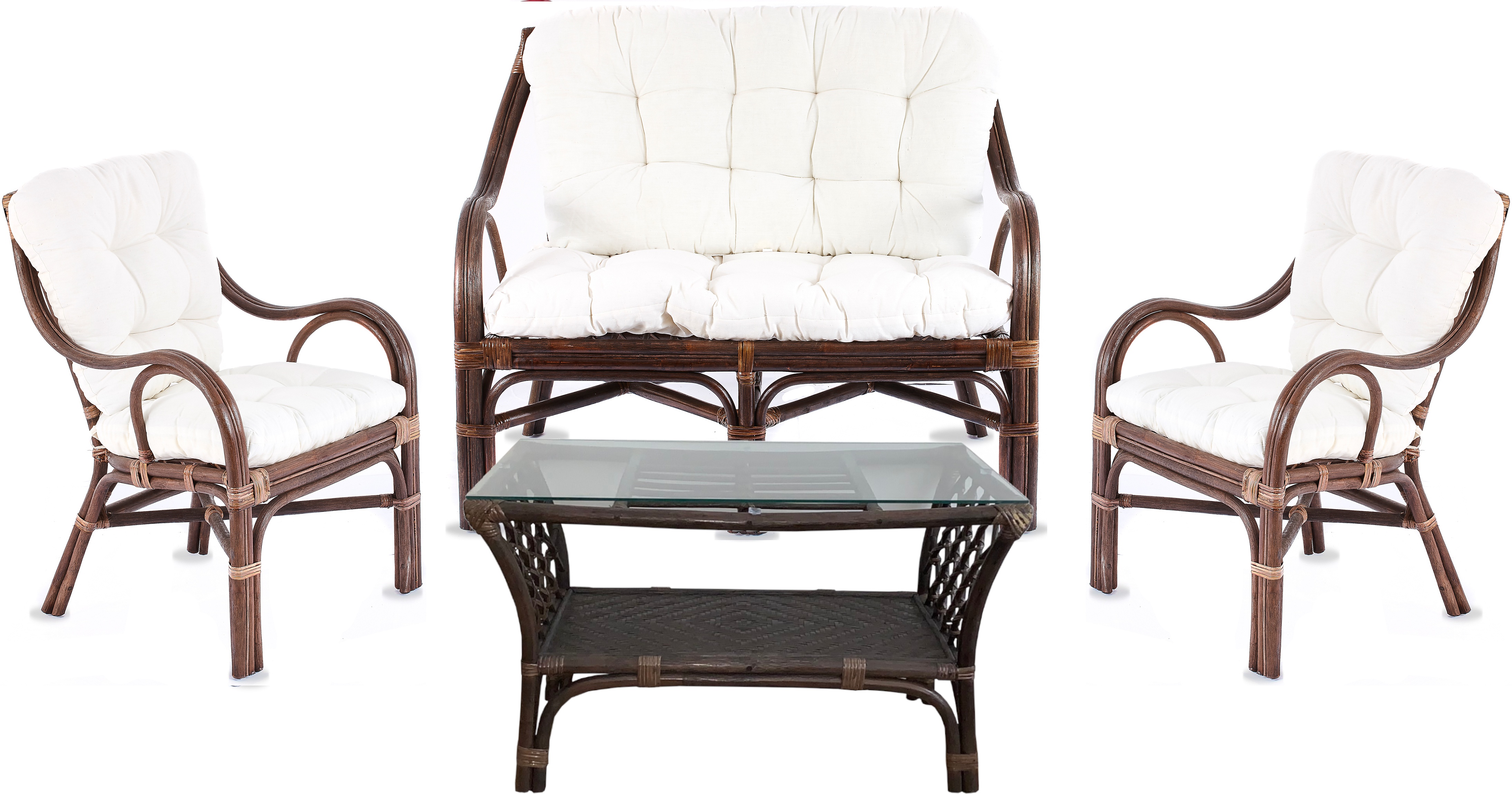 - A készlet a következőket tartalmazza: rattan pad, 2 fotel, asztal üveggel és teljes párnasorozat