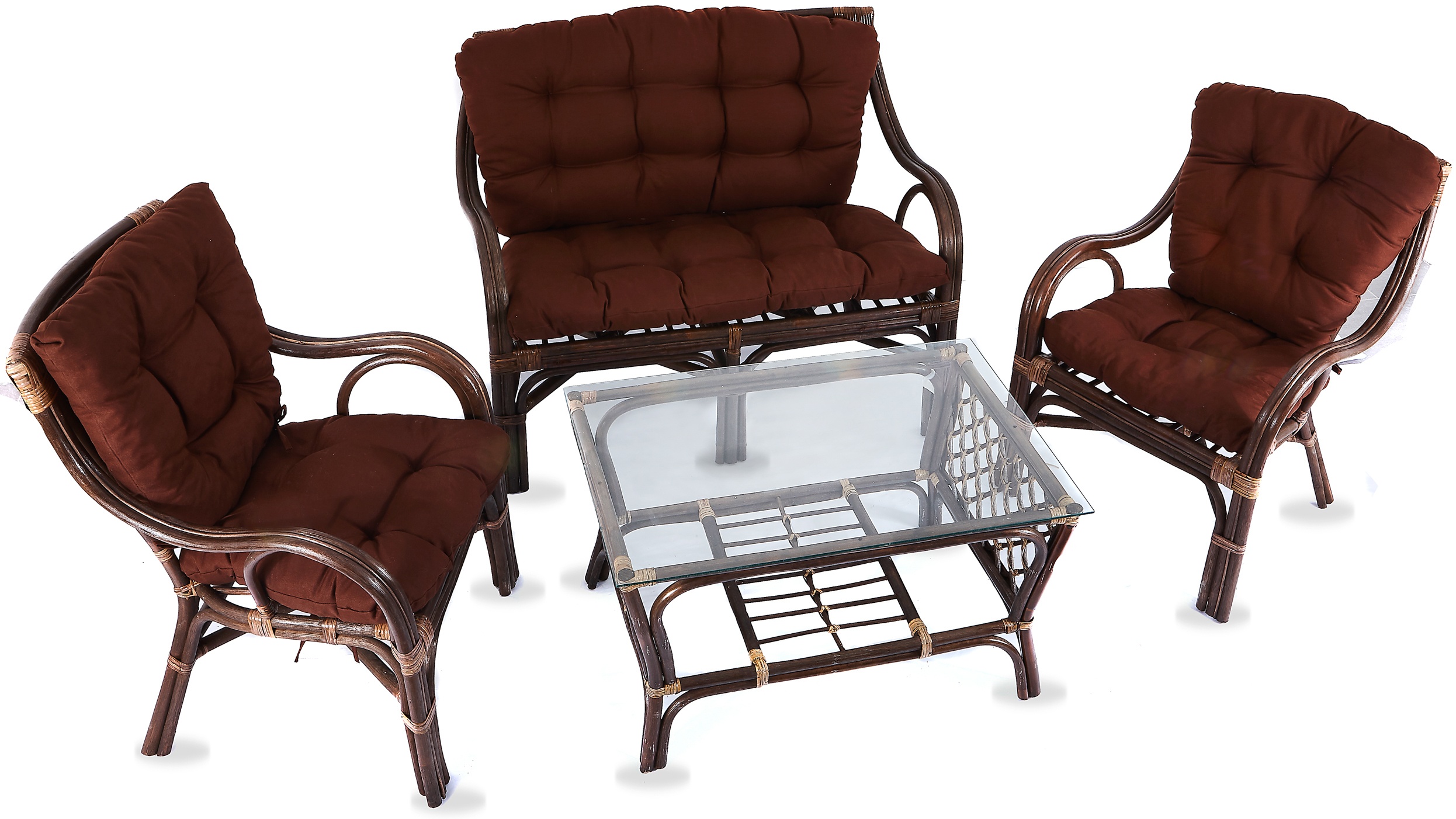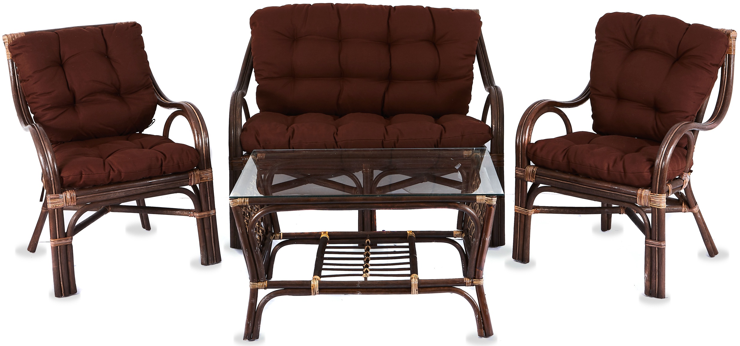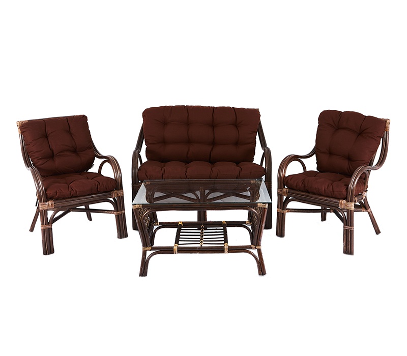 - A készlet a következőket tartalmazza: rattan pad, 2 fotel, asztal üveggel és teljes párnasorozat