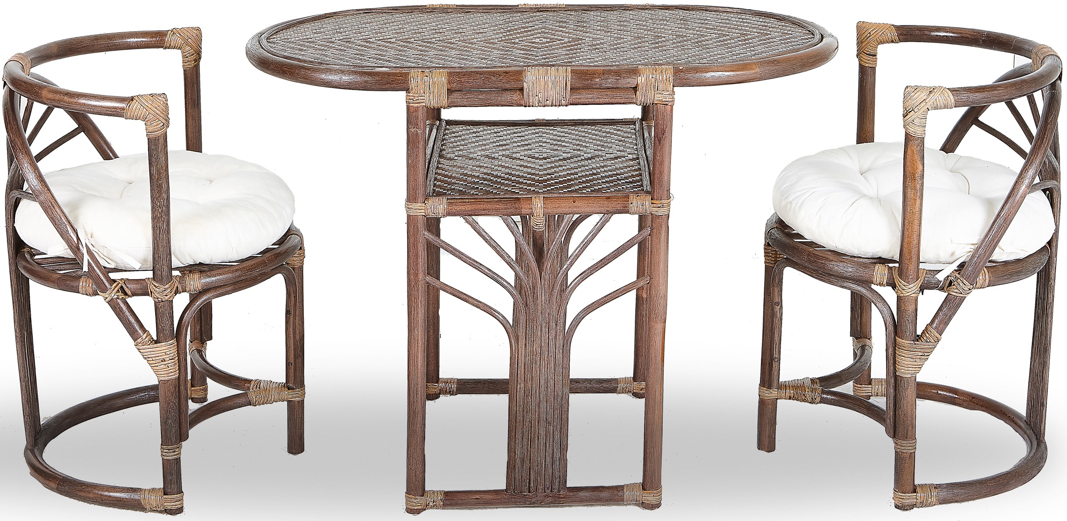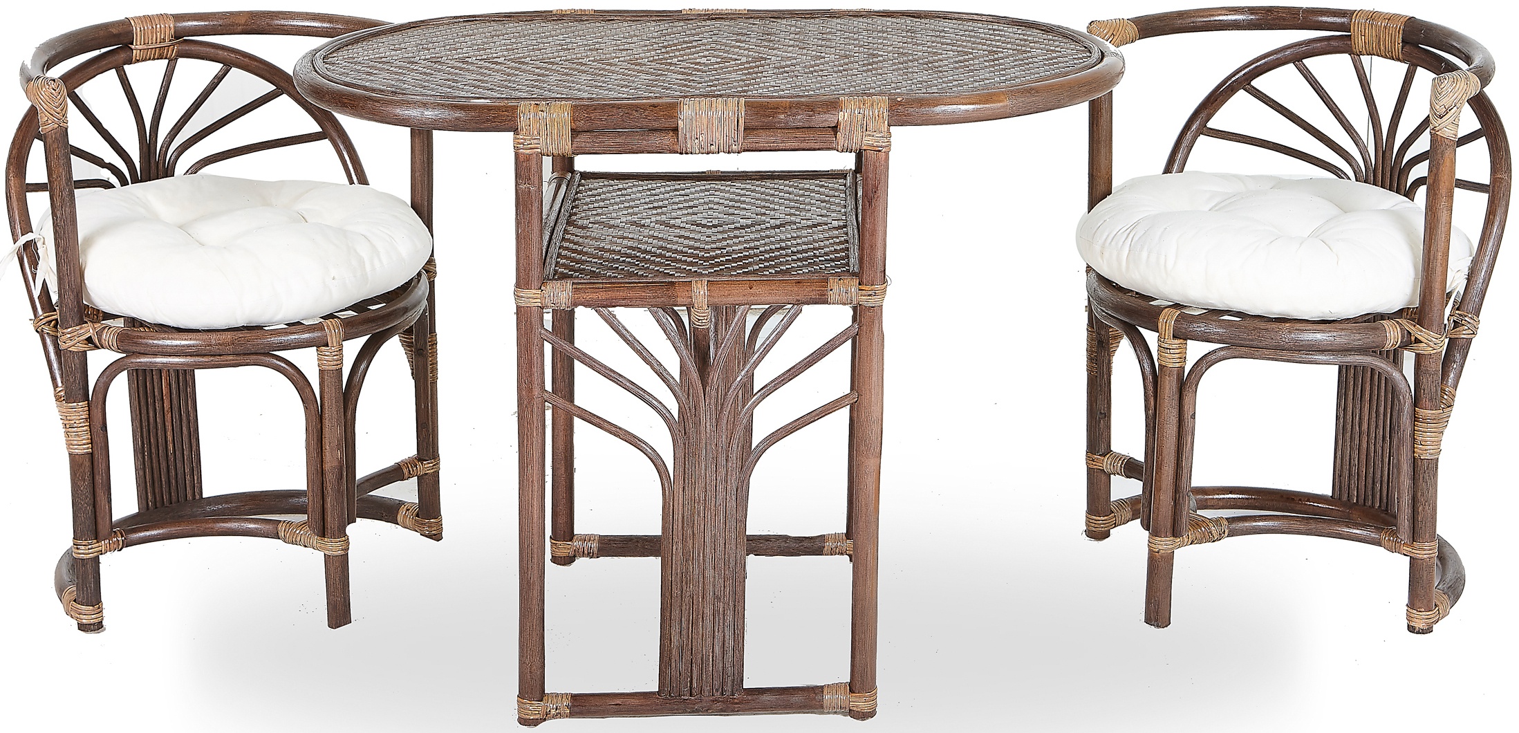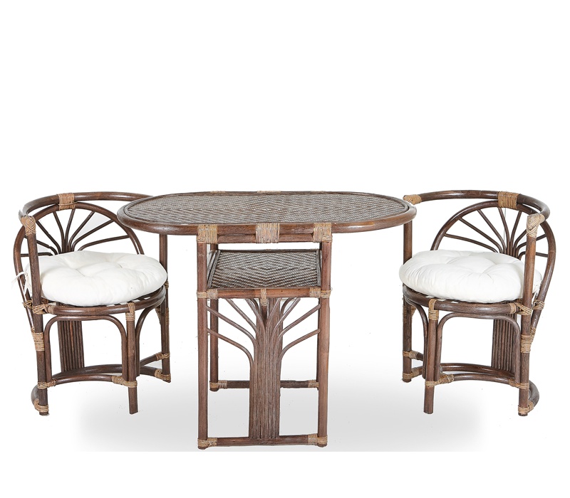 A kollekció 2 rattan karosszéket és egy üveglapos rattan asztalt tartalmaz.