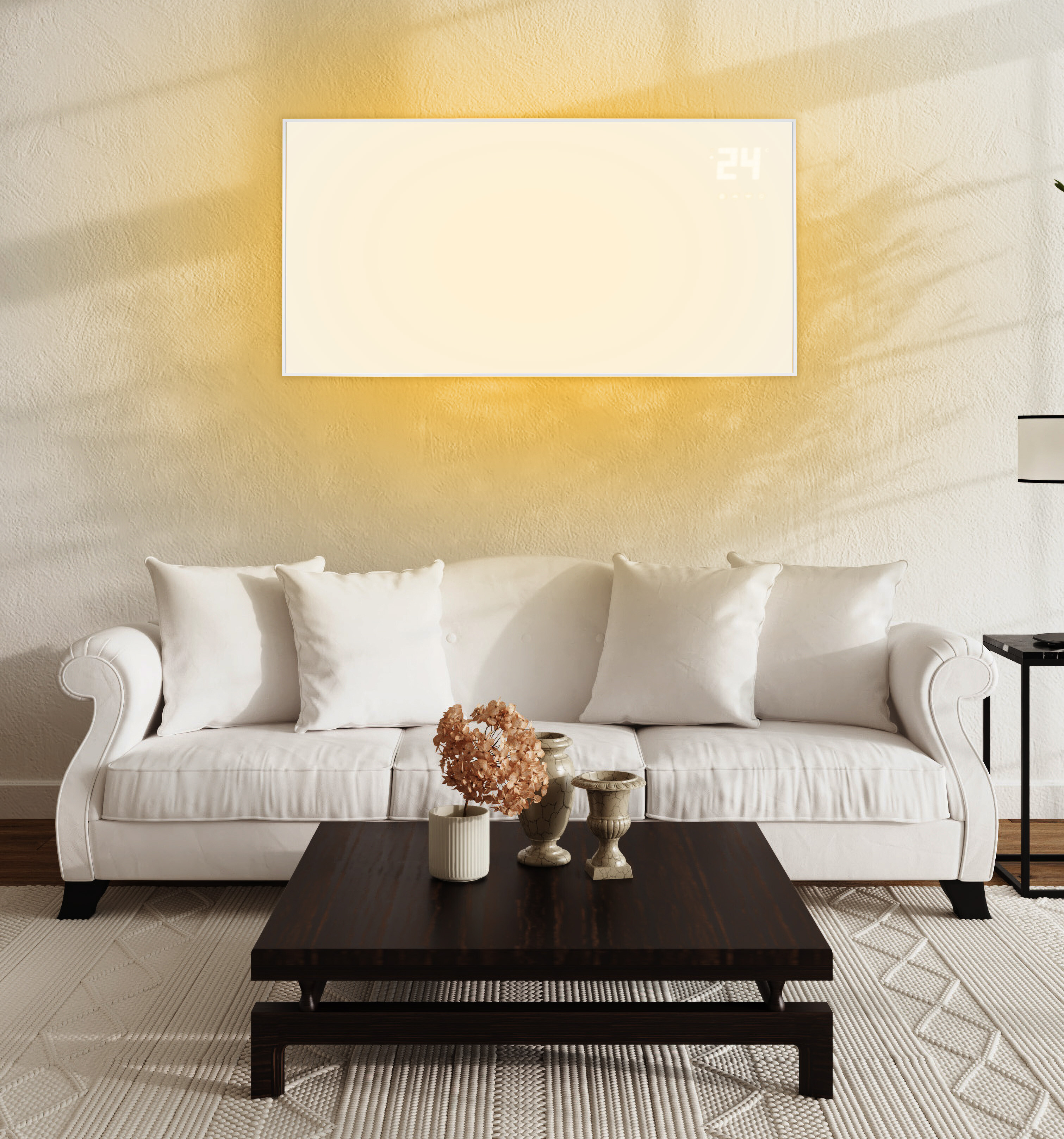 Ha a földre helyezés mellett dönt, nagyon egyszerűen rácsavarozhatja a lábakat a fűtő infrapanelre. A fali tartók is a csomag részét képezik.A fűtőpanel egy áttekinthető LCD kijelzővel van felszerelve, amely lehetővé teszi a kívánt hőmérséklet egyszerű beállítását.